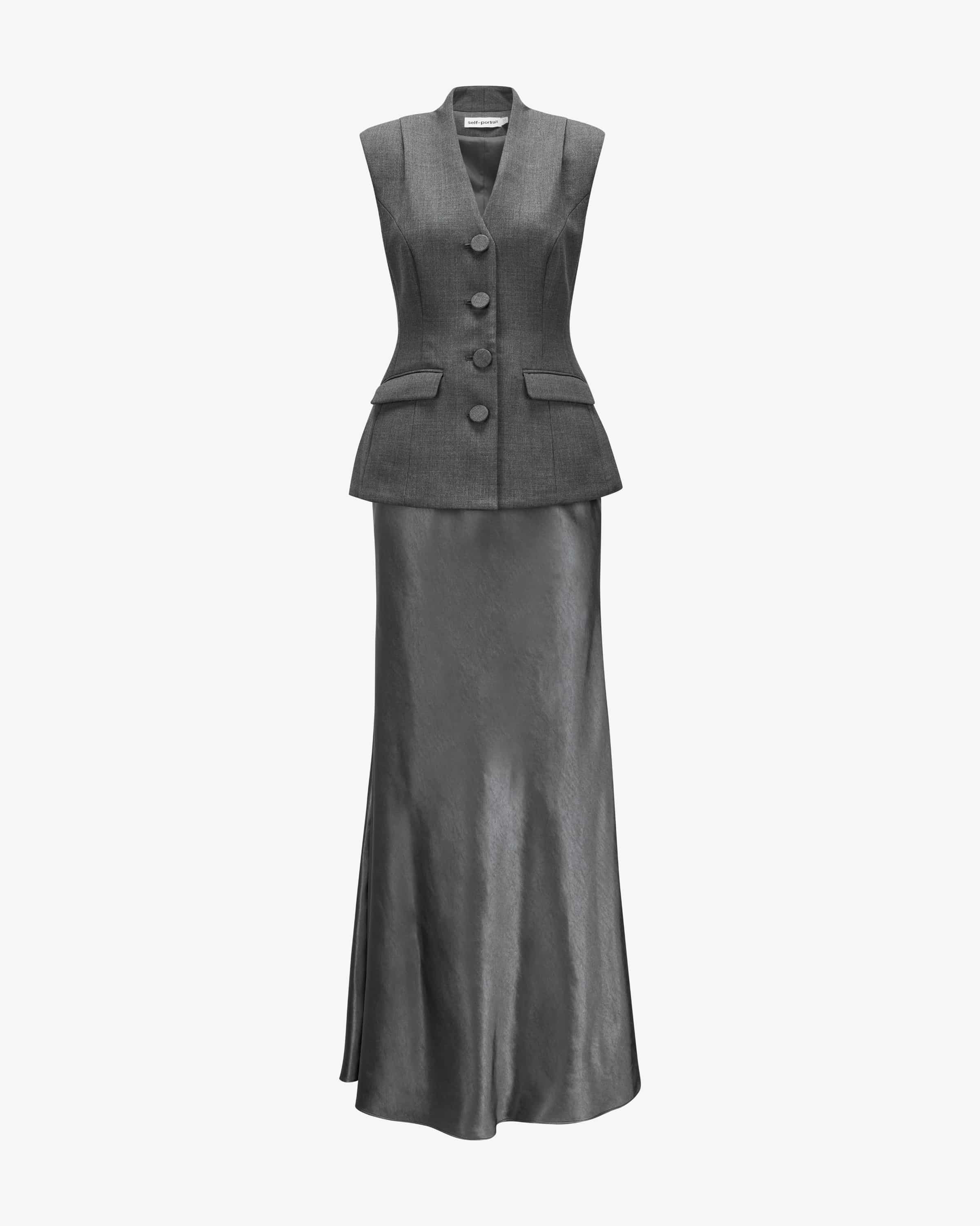 2-in-1-Kleid für Damen von Self-Portrait in Grau. Das Londoner Label steht für moderne Cocktailkleider mit Spitze, Cut-Outs und femininer Detailverliebtheit. Dieses bodenlange Modell avanciert durch die besondere Kombination aus taillierter Anzugweste und abtrennbarem Satinrock zu einem femininen Power-Look, der individuell getragen werden kann – ob als Einteiler oder separat.