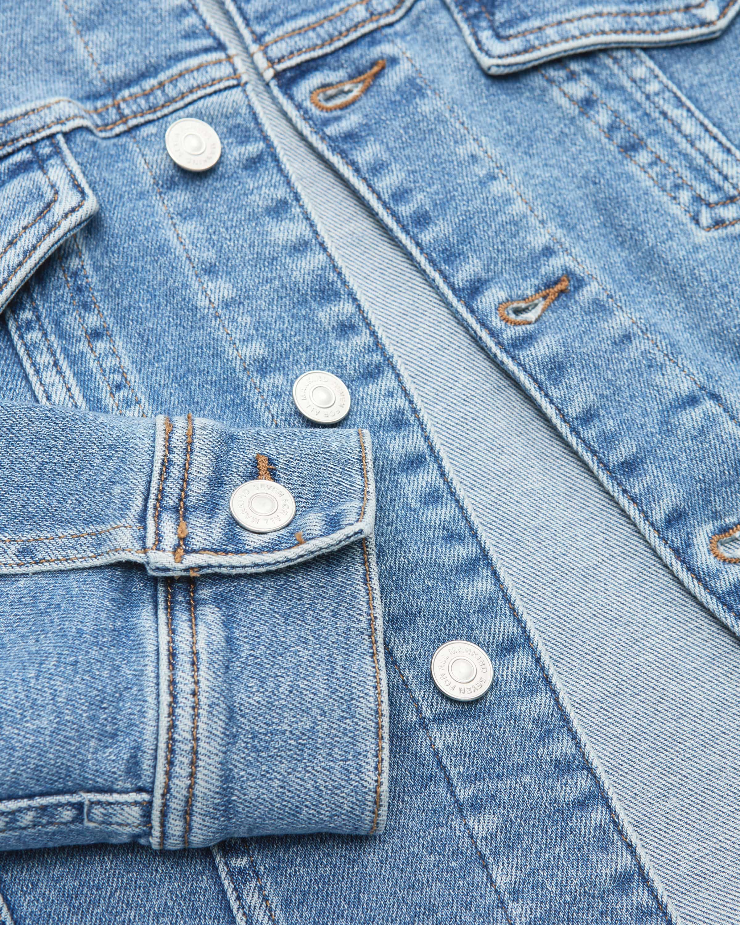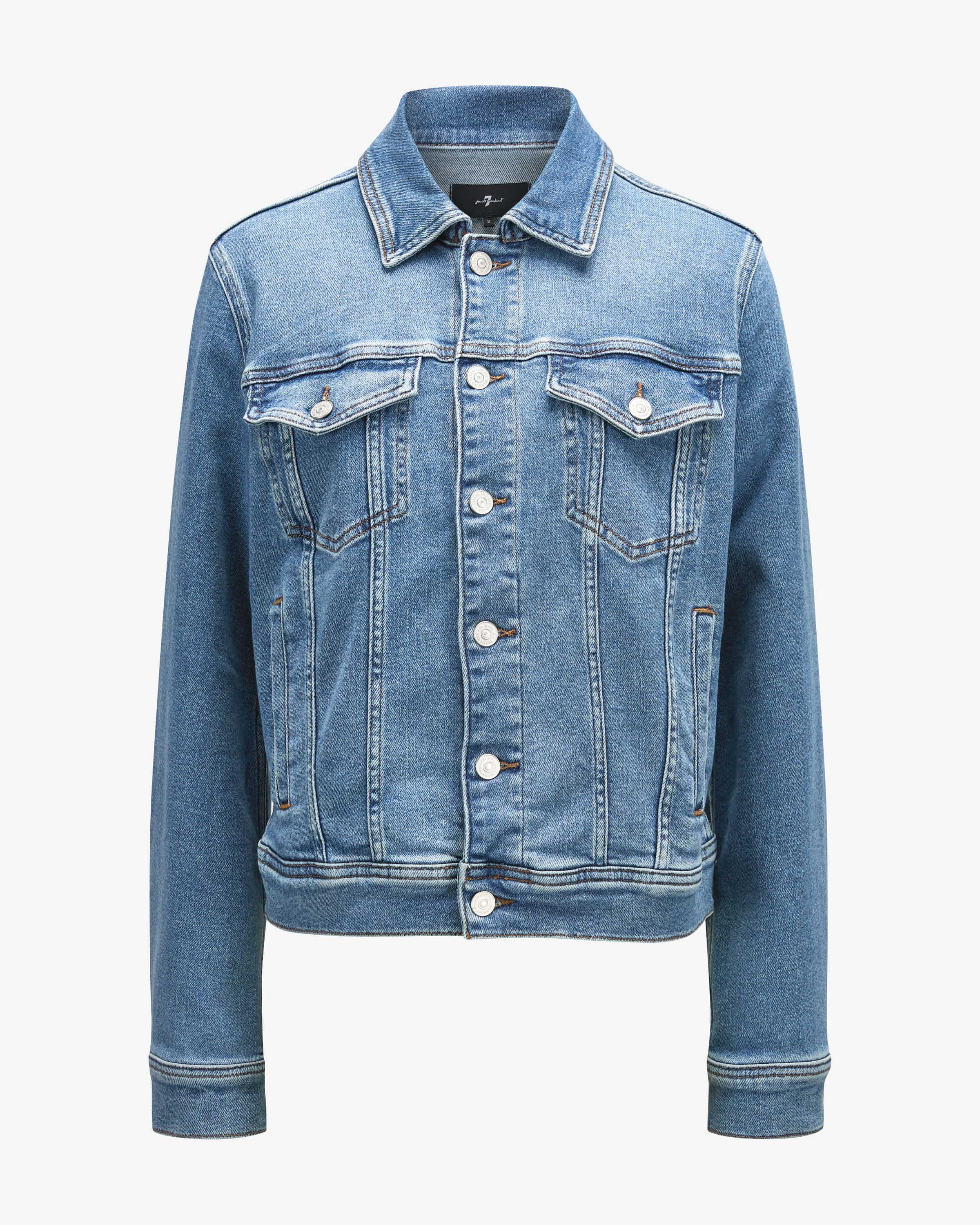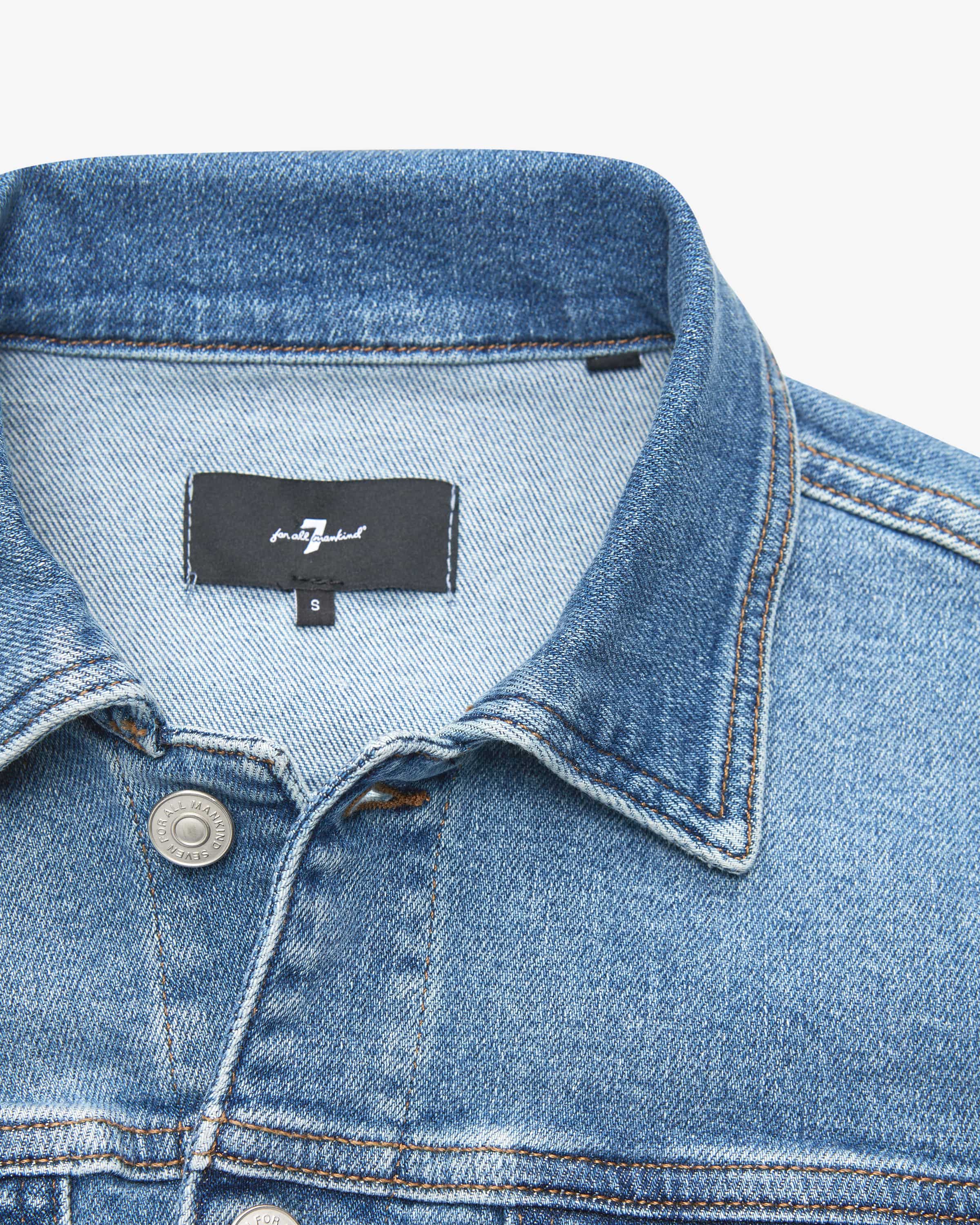 Adi Trucker Jeansjacke für Damen von 7 For All Mankind in Blau. Das kalifornische Label gehört zu den Denim-Pionieren im Premiumsegment – bekannt für innovative Waschungen und perfekte Fits. Auch dieses Modell präsentiert sich mit Kontrastnähten und klassischen Details im typischen Denim-Design und kreiert so einen legeren Look, während die Waschung das Gesamtbild harmonisch vollendet.