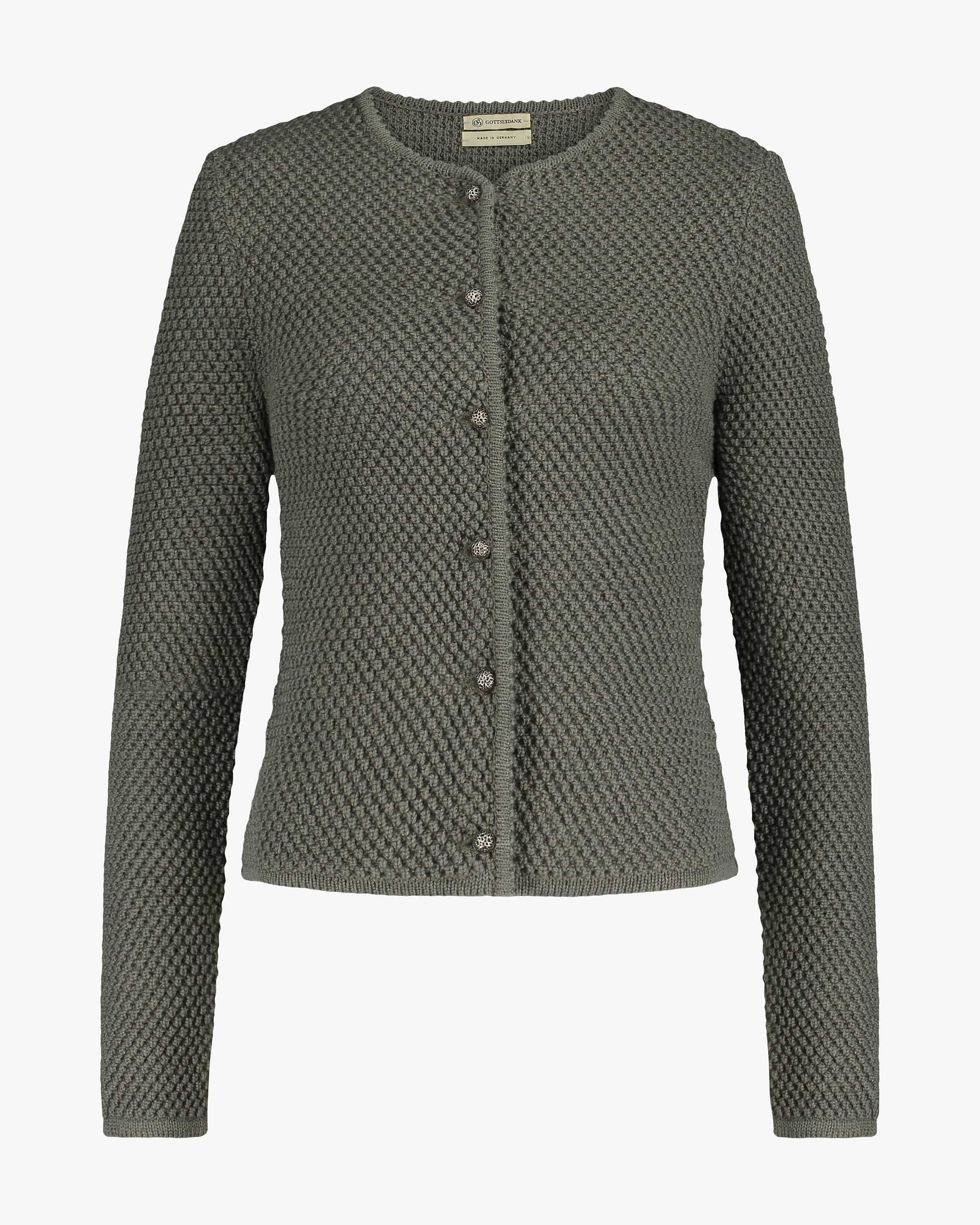 Agnes Trachten-Strickjacke für Damen von Gottseidank in Oliv. Die extrafeine Merino-Wolle punktet mit besonders angenehmem Tragekomfort, während das raffinierte Strickmuster sowohl haptisch als auch optisch ein modisches Highlight setzt.