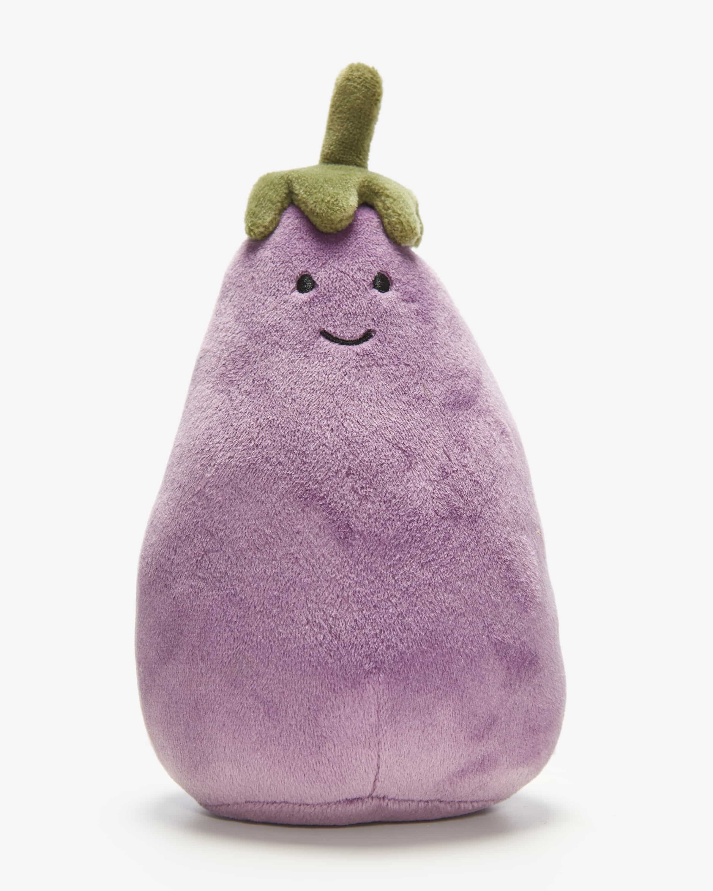 Amuseables Aubergine Plüschtier für Kinder von Jellycat in Violett und Oliv. Das Label, welches seit 1999 in London Kuscheltiere entwirft, begeistert durch die Kombination aus hochwertigen Stoffen sowie süßen und kreativen Designs. Auch dieses Plüschtier in süßer Auberginen-Aufmachung begeistert mit niedlichem Gesicht und besonders kuscheliger Haptik als origineller Spielbegleiter oder flauschiges Deko-Objekt.