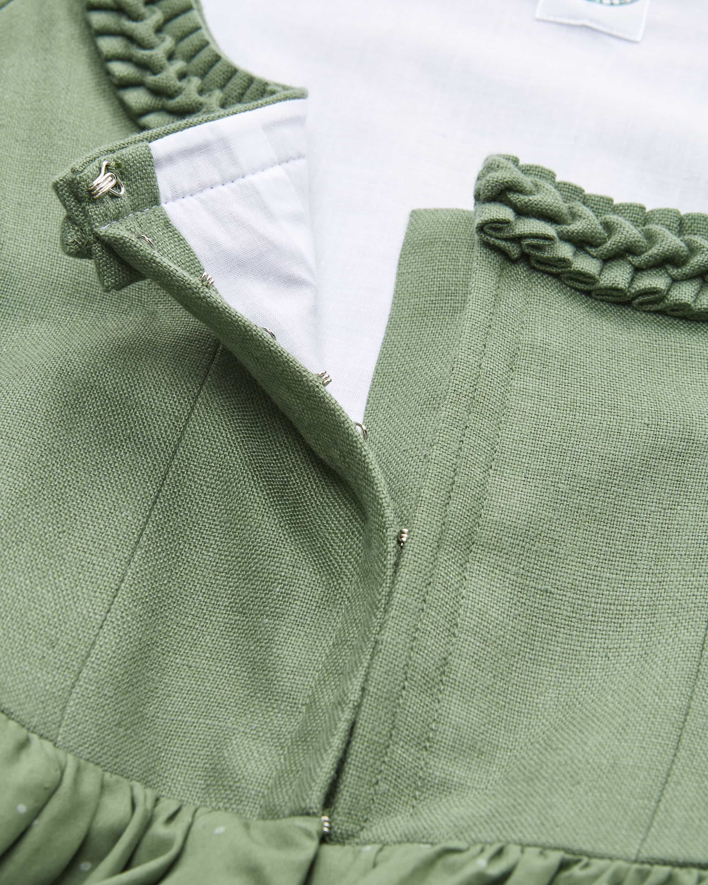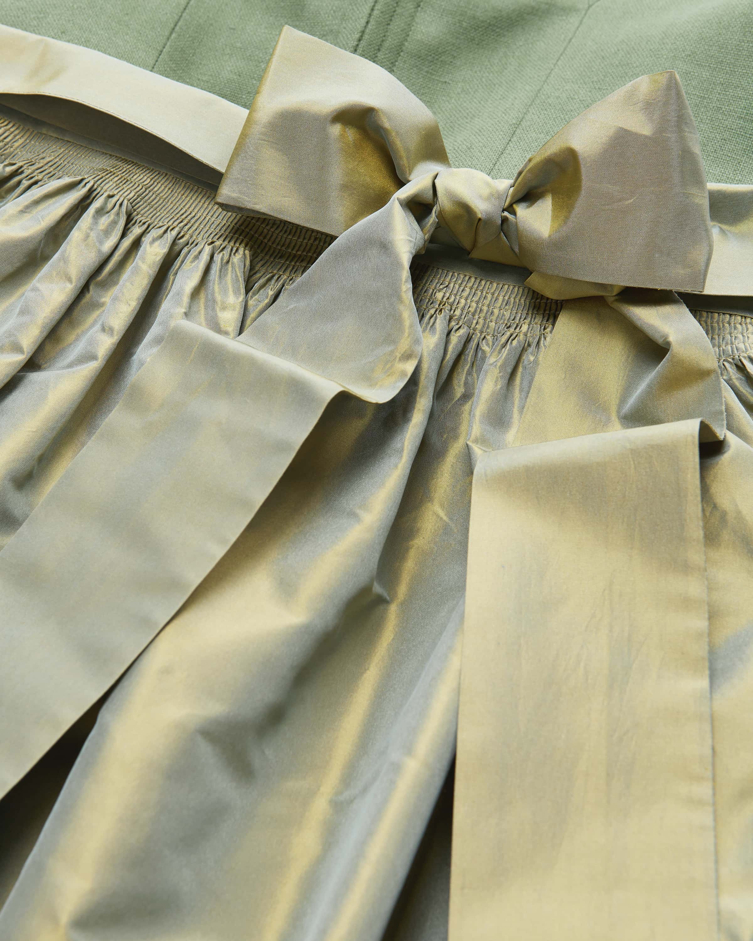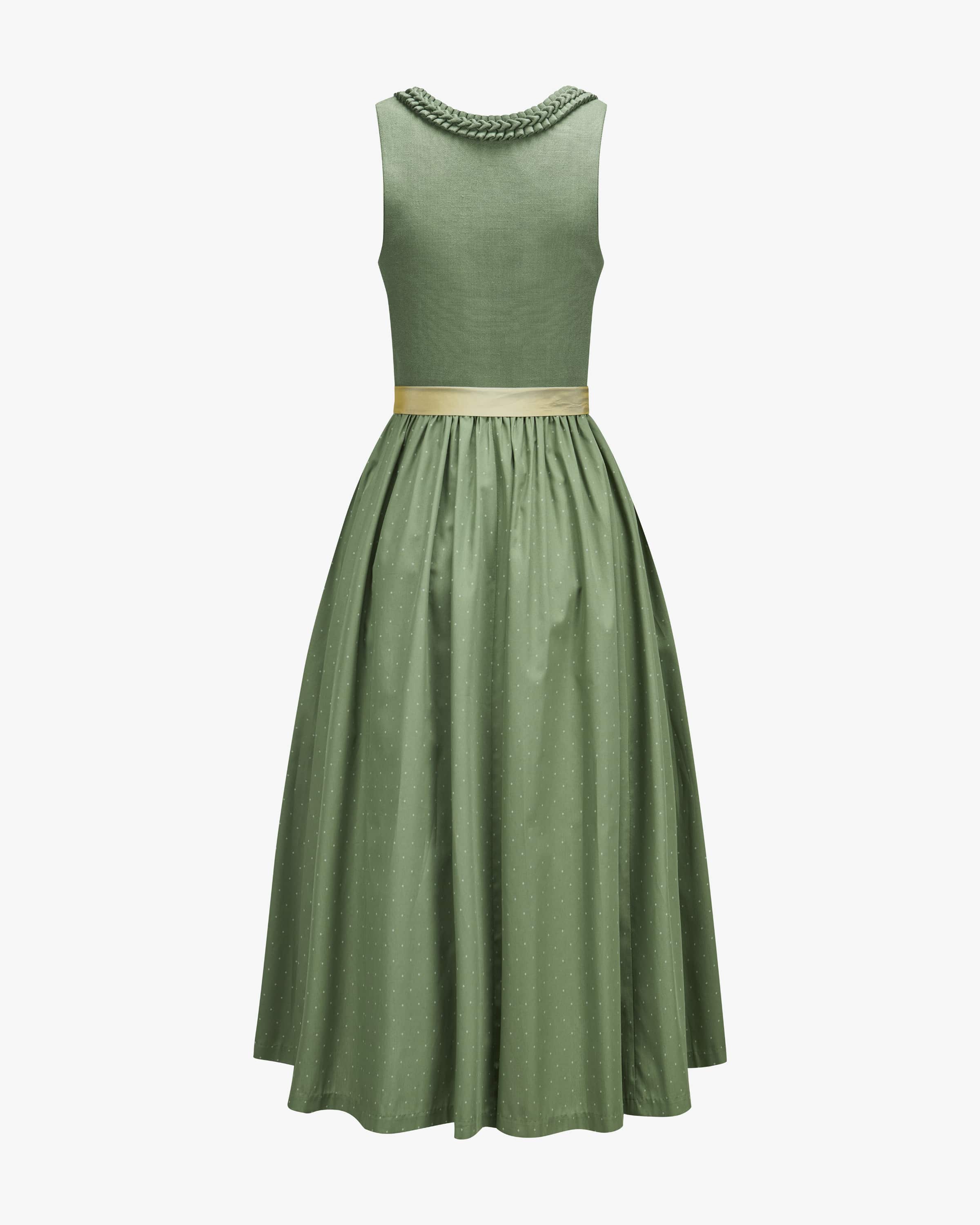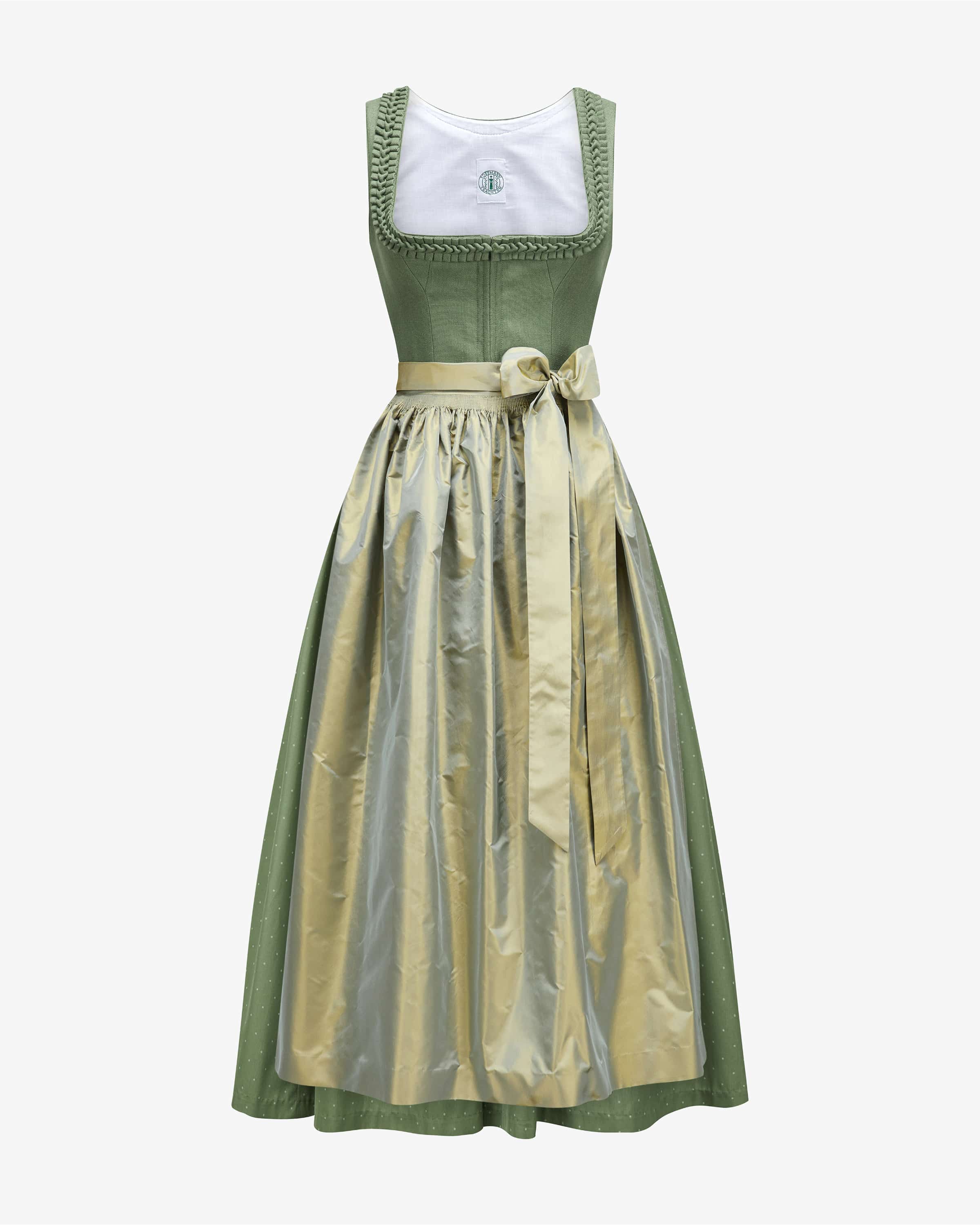 Anne Leinendirndl lang mit Sylvia Schürze für Damen von Tostmann in Grün und Schilf. Trachten-Handwerk aus Österreich - Das Modell überzeugt durch den Rock im dezenten Punkte-Muster und klassischen Details, während die strukturierte Leinen-Qualität im Mieder für angenehmen Tragekomfort sorgt. Die gestiftelte Schürze aus hochwertiger Seide rundet den Trachten-Look feminin ab.