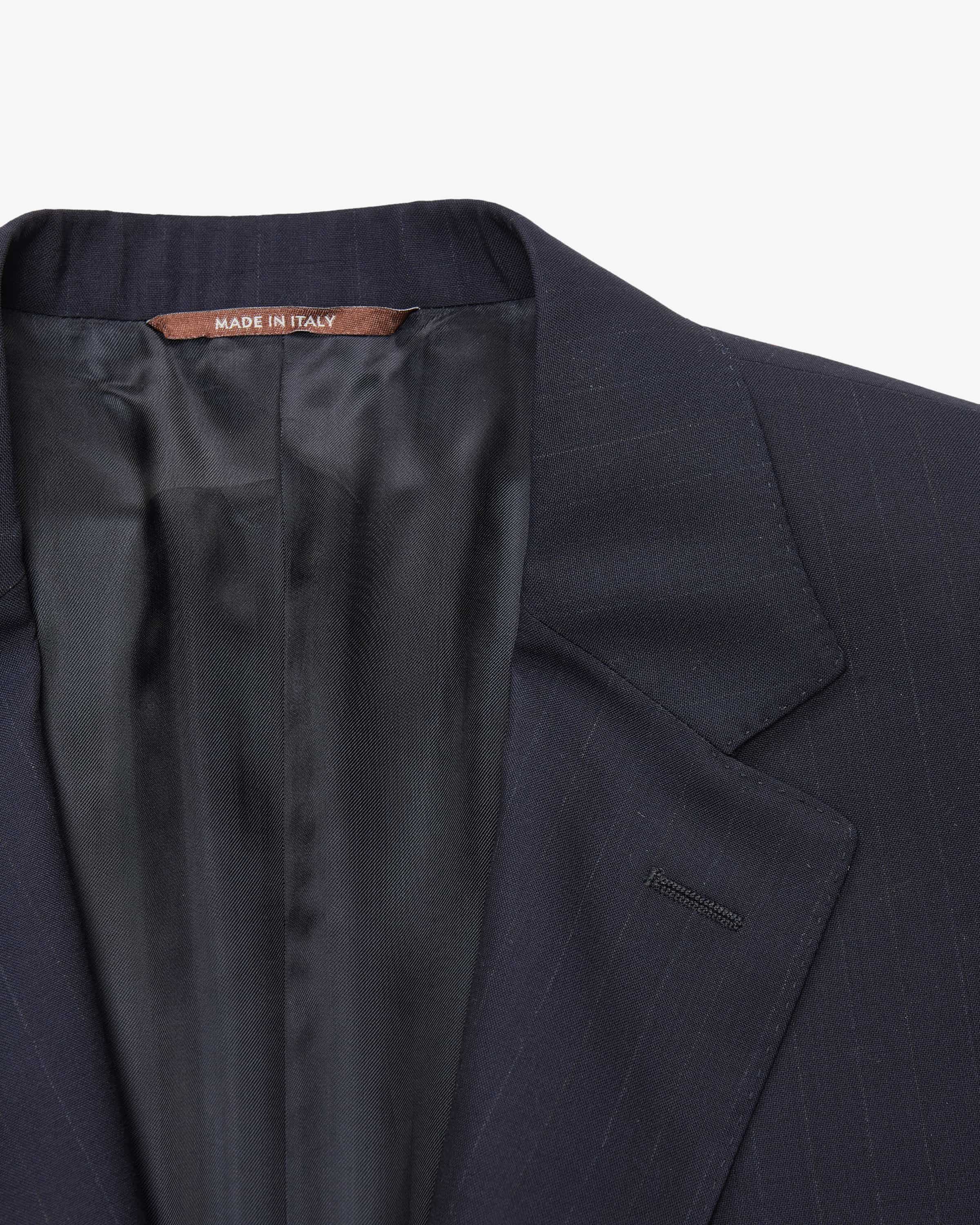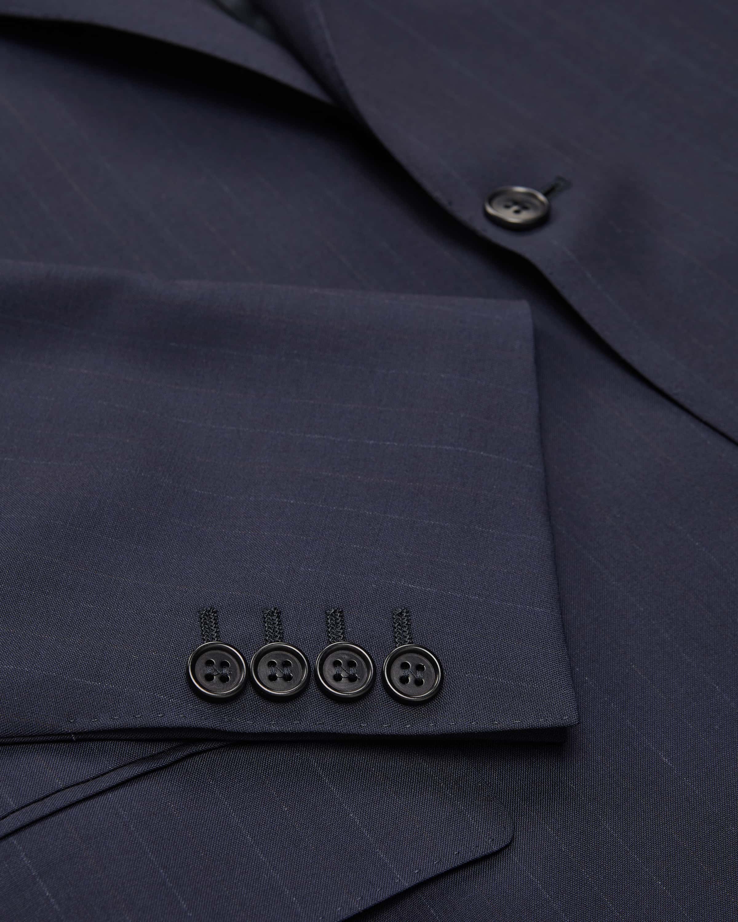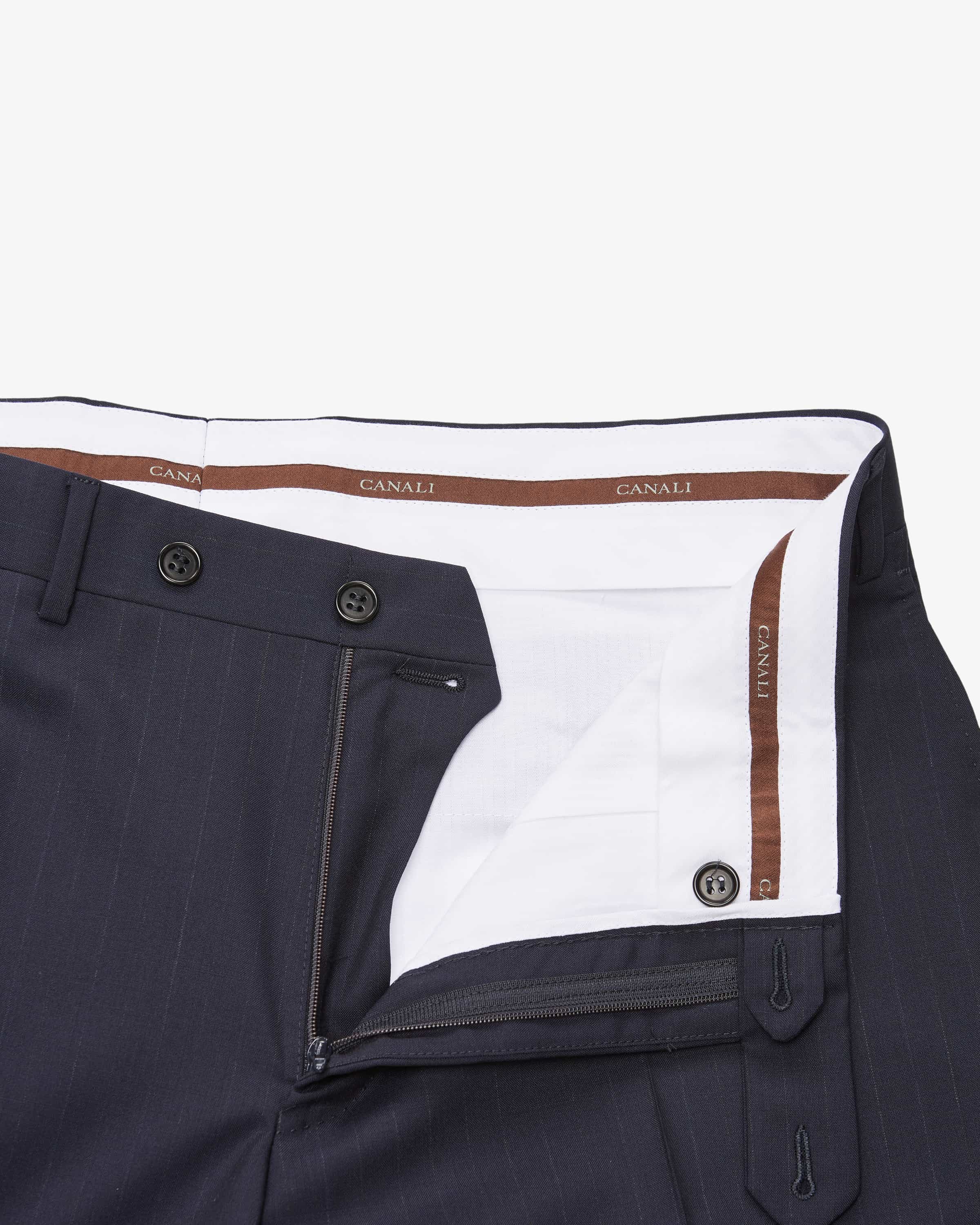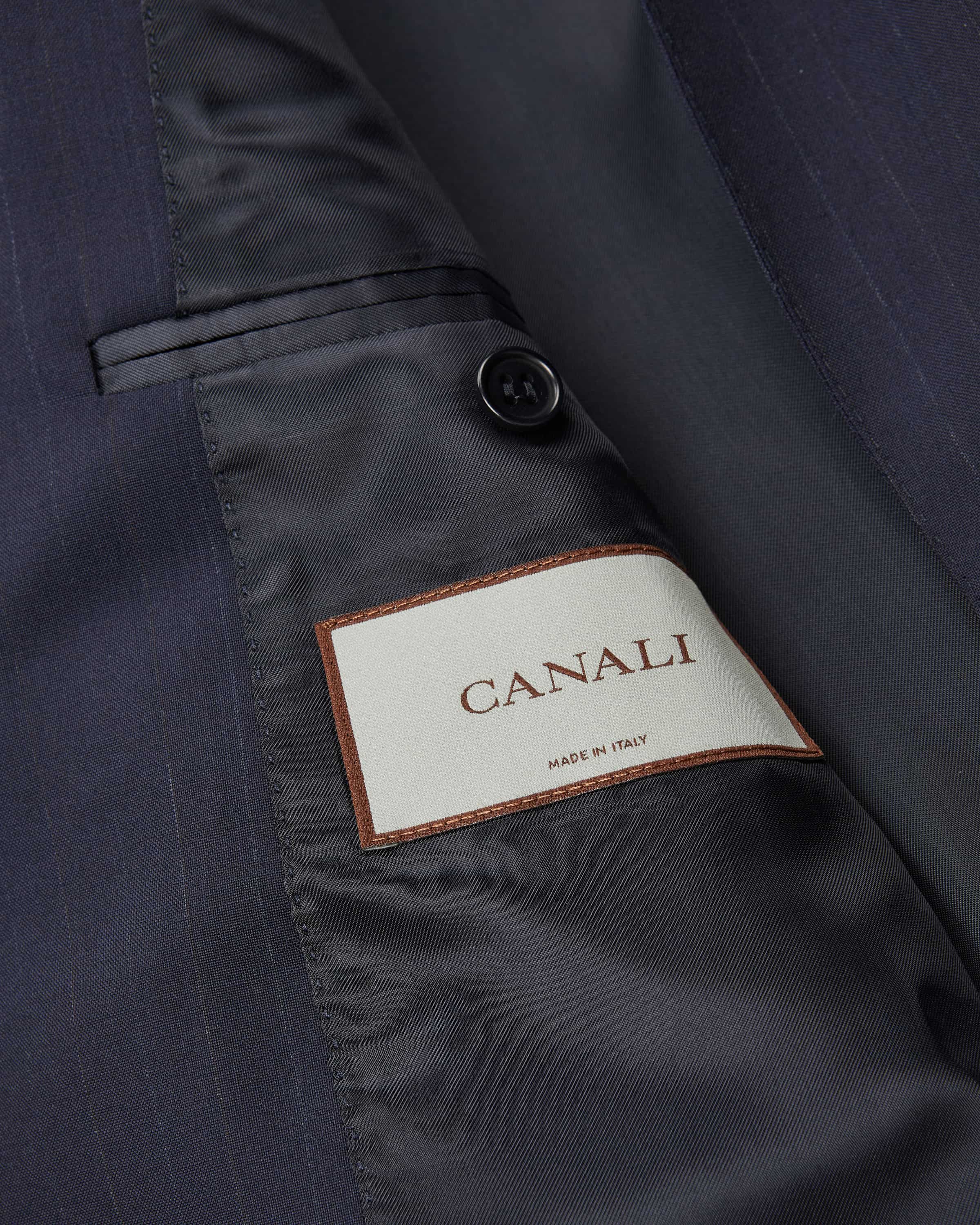 Anzug für Herren von Canali in Navy. Familiengeführtes italienisches Herrenausstatter-Unternehmen seit 1934, Symbol für „Made in Italy“. Auch dieses Modell überzeugt dank der hochwertigen Woll-Qualität nicht nur haptisch sondern auch optisch, während das feine Nadelstreifen-Design und die klassischen Details das maskuline Gesamtbild harmonisch abrunden.