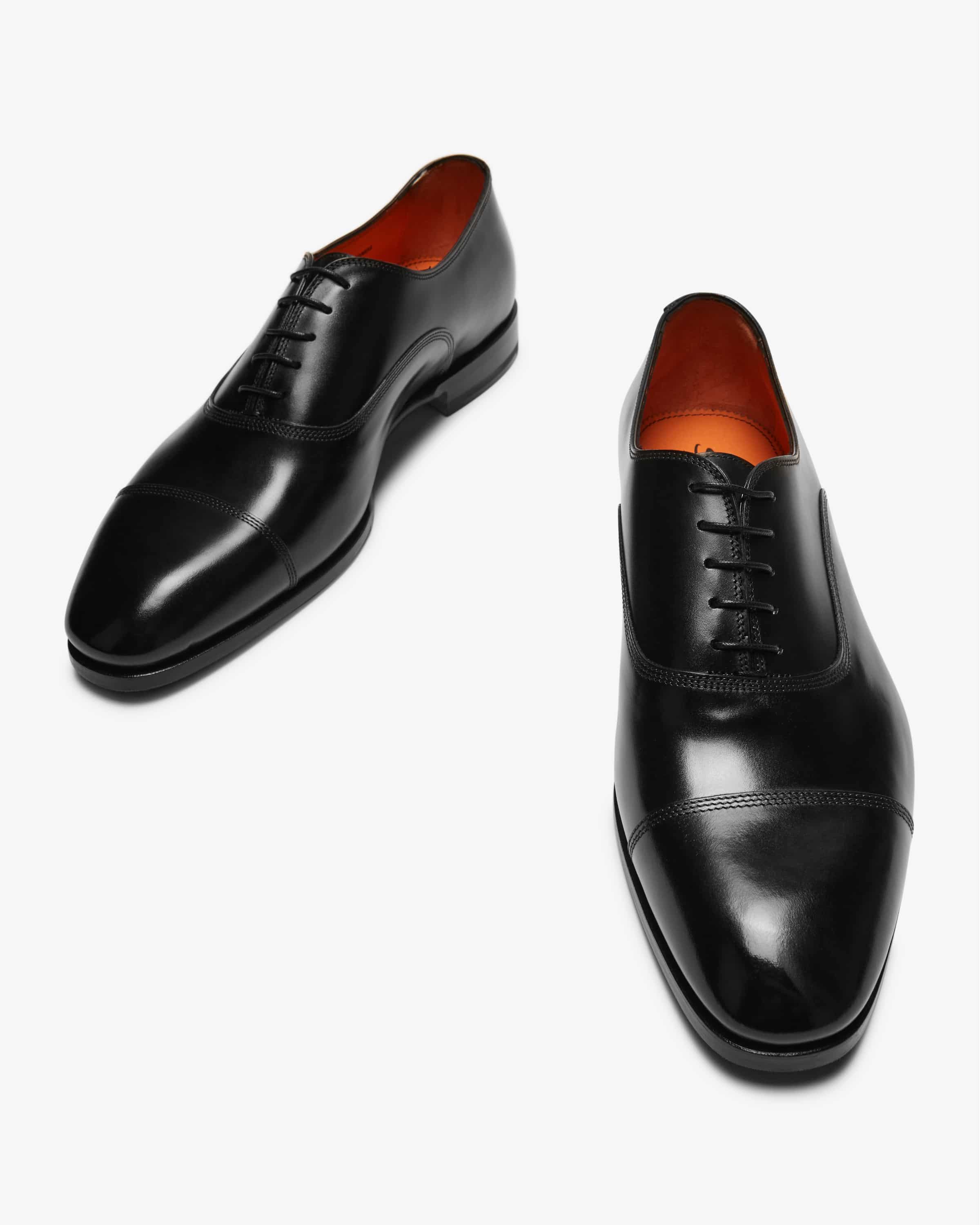 Archie Halbschuhe für Herren von Santoni in Schwarz. Made in Italy - Der edle handgefertigte Schuh präsentiert sich mit hochwertig verarbeitetem Glattleder. Die Ledersohle ist teilweise genagelt, während die klassische Schnürung und elegante Ziernähte das Gesamtbild gekonnt abrunden.