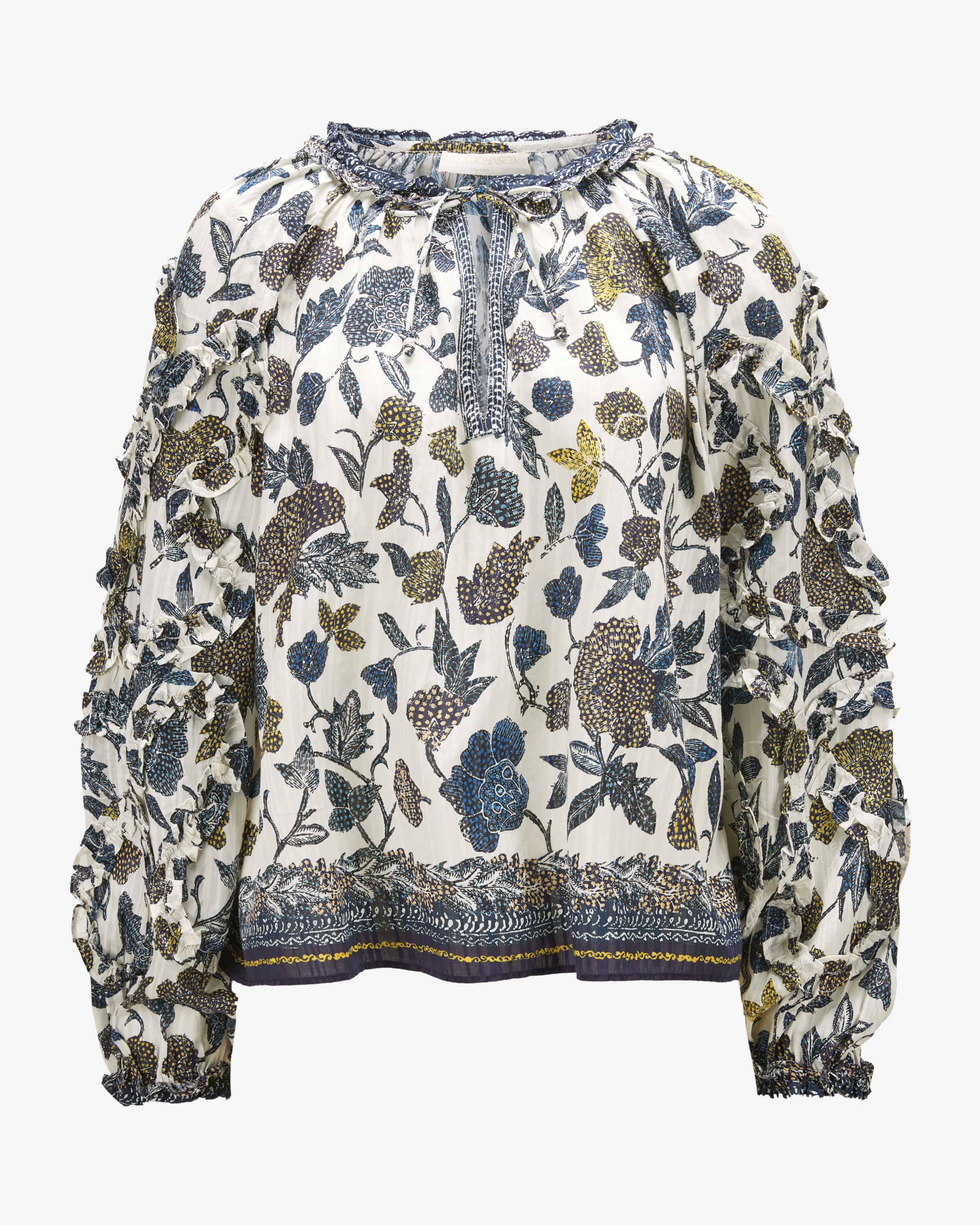 Azrou Bluse für Damen von Ulla Johnson in Dunkleblau, Creme und Gelb. Die New Yorker Designerin steht für Boho-Luxus mit femininen Volants, Stickereien und fließenden Stoffen. Auch dieses Modell präsentiert sich in femininer Tunika- Aufmachung und überzeugt mit leichtem Baumwoll-Viskose-Mix, während der florale Print einen sommerlichen Begleiter im modischen Bohemian-Look schafft.