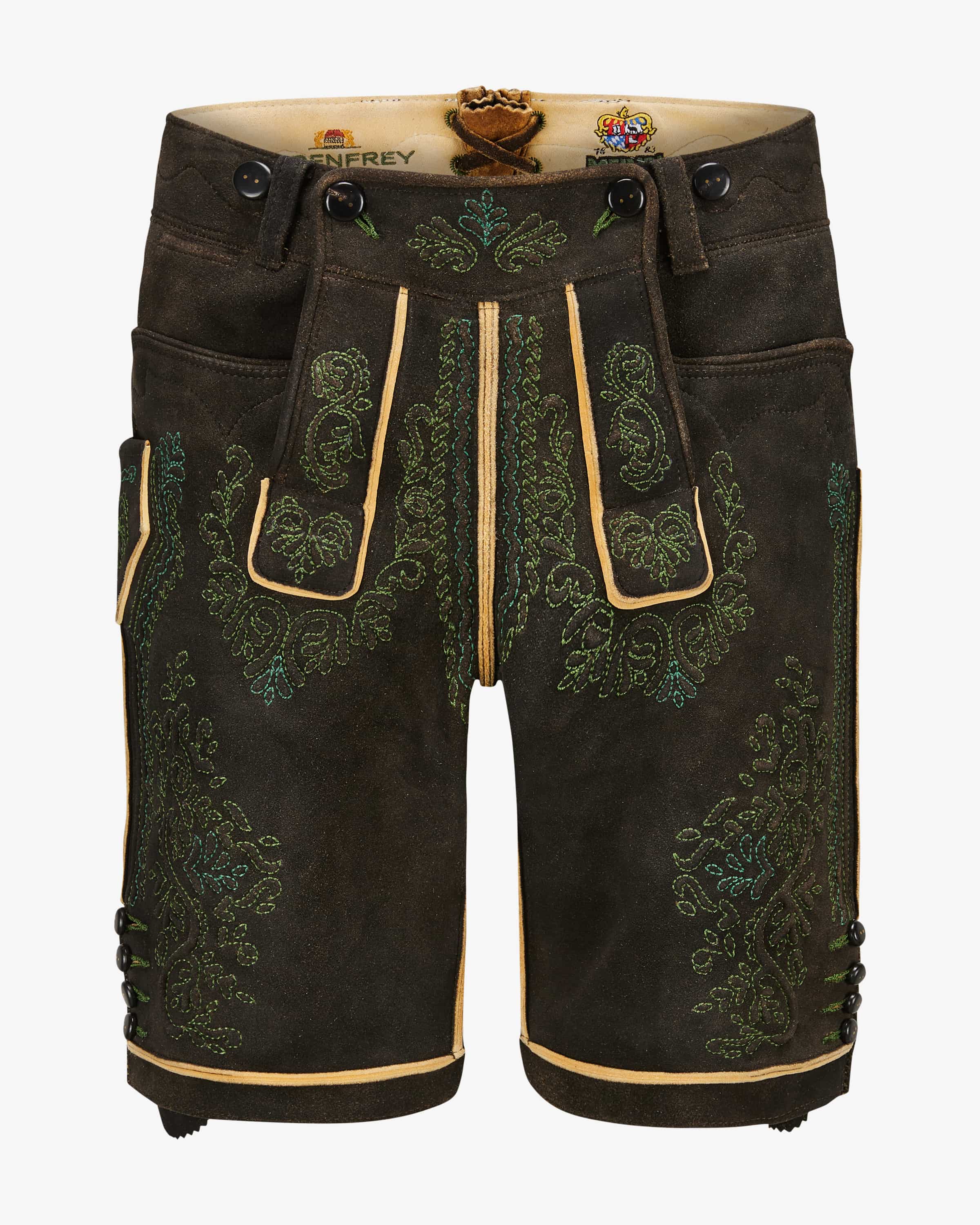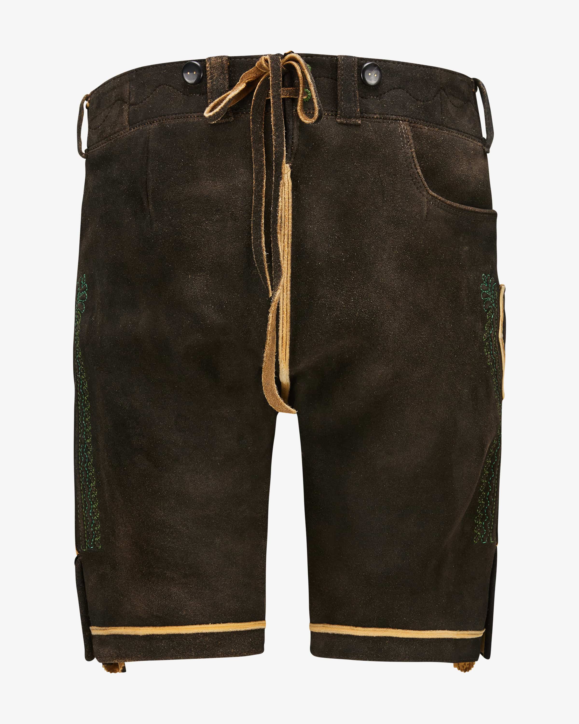 Bad Aussee Lederhose kurz aus Hirschleder für Herren von Meindl in Ahorn. Lederhandwerk aus Bayern - Bereits 1693 wurden bei Meindl die ersten Produkte aus Leder gefertigt und seit nun mehr als 70 Jahren fertigt das Traditionshaus hochwertige Lederhosen, die von Kennern meist ein Leben lang geschätzt werden. Das traditionelle Modell aus robustem Hirschleder spiegelt dies gekonnt wider und besitzt ein handgesticktes, kontrastierendes Muster mit erhabenen Elementen.