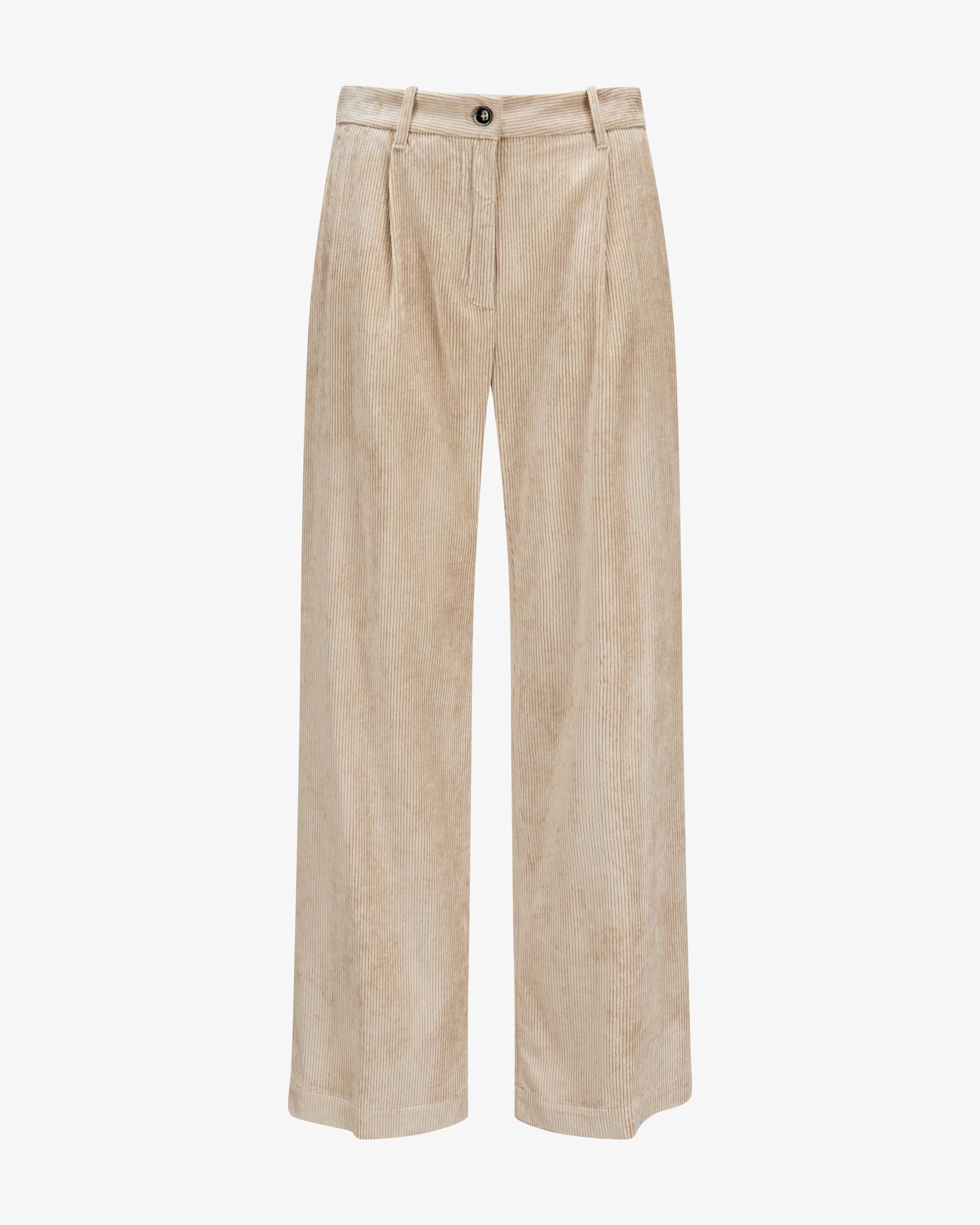 Blenda Cordhose für Damen von nine:inthe:morning in Ecru. Das italienische Label setzt auf moderne Silhouetten, Qualität und klare Schnitte – elegant, urban, puristisch. Gefertigt aus elastischem Viskose-Seiden-Mix in weicher Cord- Verarbeitung besticht das Modell mit angenehmem Tragekomfort, während die weite Schnittführung mit Bundfalten einen stilvollen Favoriten mit modischen Country- Vibes kreiert.