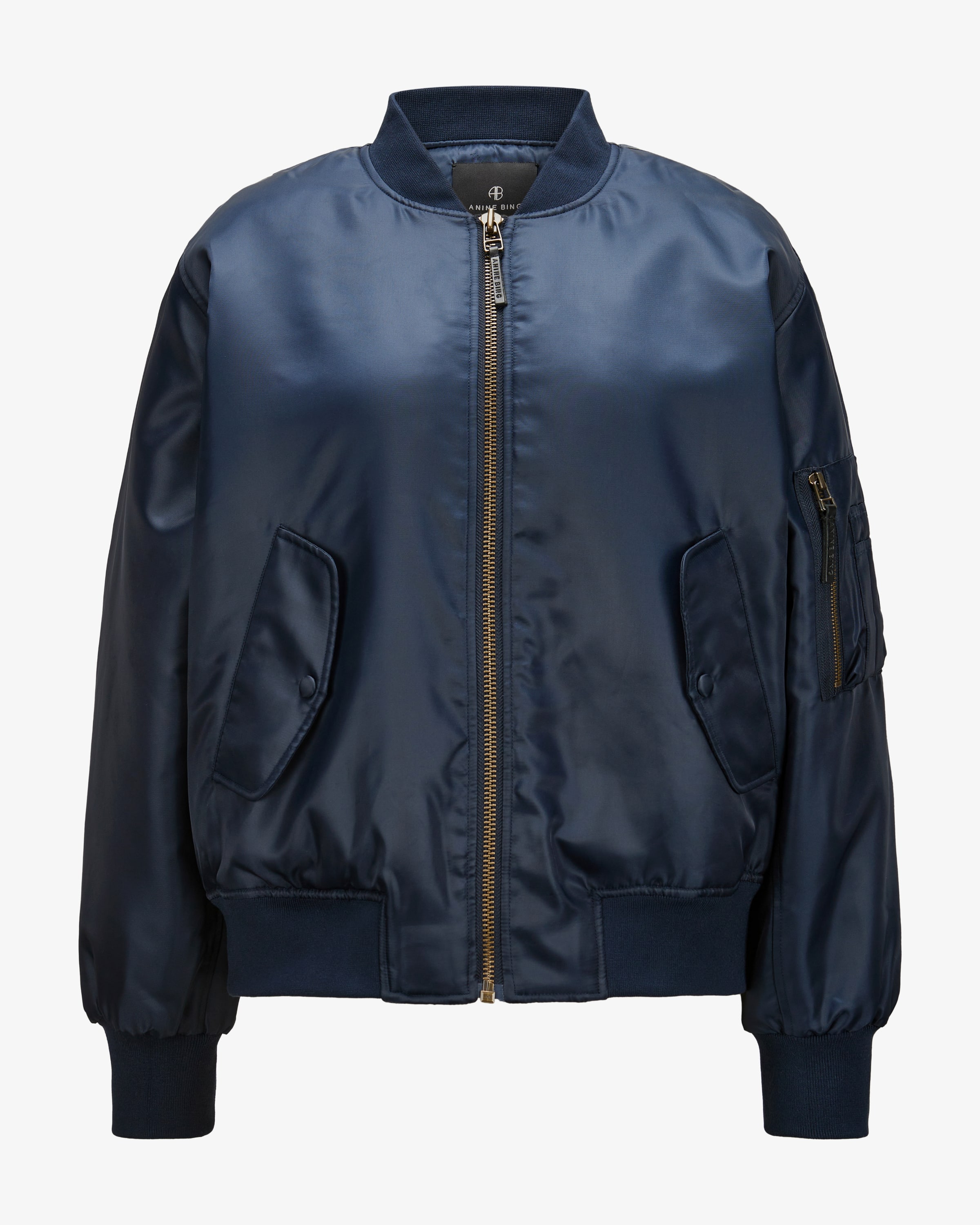 Bomberjacke Leon für Damen von Anine Bing in Navy. 2012 in Los Angeles gegründet, vereint das Label skandinavischen Minimalismus mit amerikanischer Coolness. Auch dieses angesagte Bomber-Modell überzeugt mit legerer Silhouette in voluminösem Design, welches durch die changierende Optik sowie die charakteristische Ärmeltasche gekonnt unterstrichen wird.