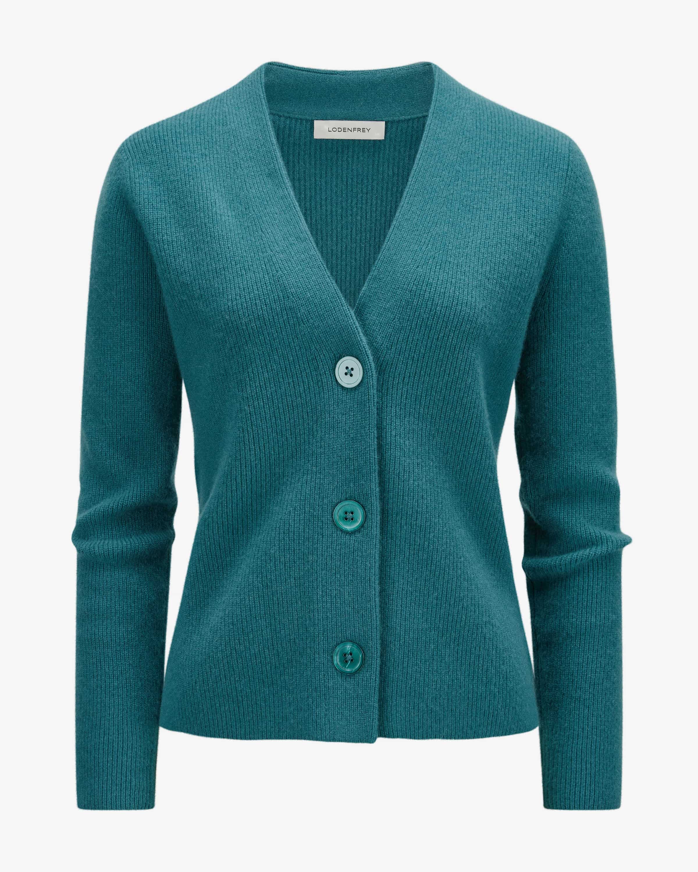 Cashmere-Strickjacke für Damen von LODENFREY in Petrol. Das Modell in schlichter Aufmachung überzeugt dank der feinen Cashmere-Qualität mit angenehmen Tragemomenten, während die markanten Knöpfe einen klassischen Begleiter für vielseitige Styles schaffen.