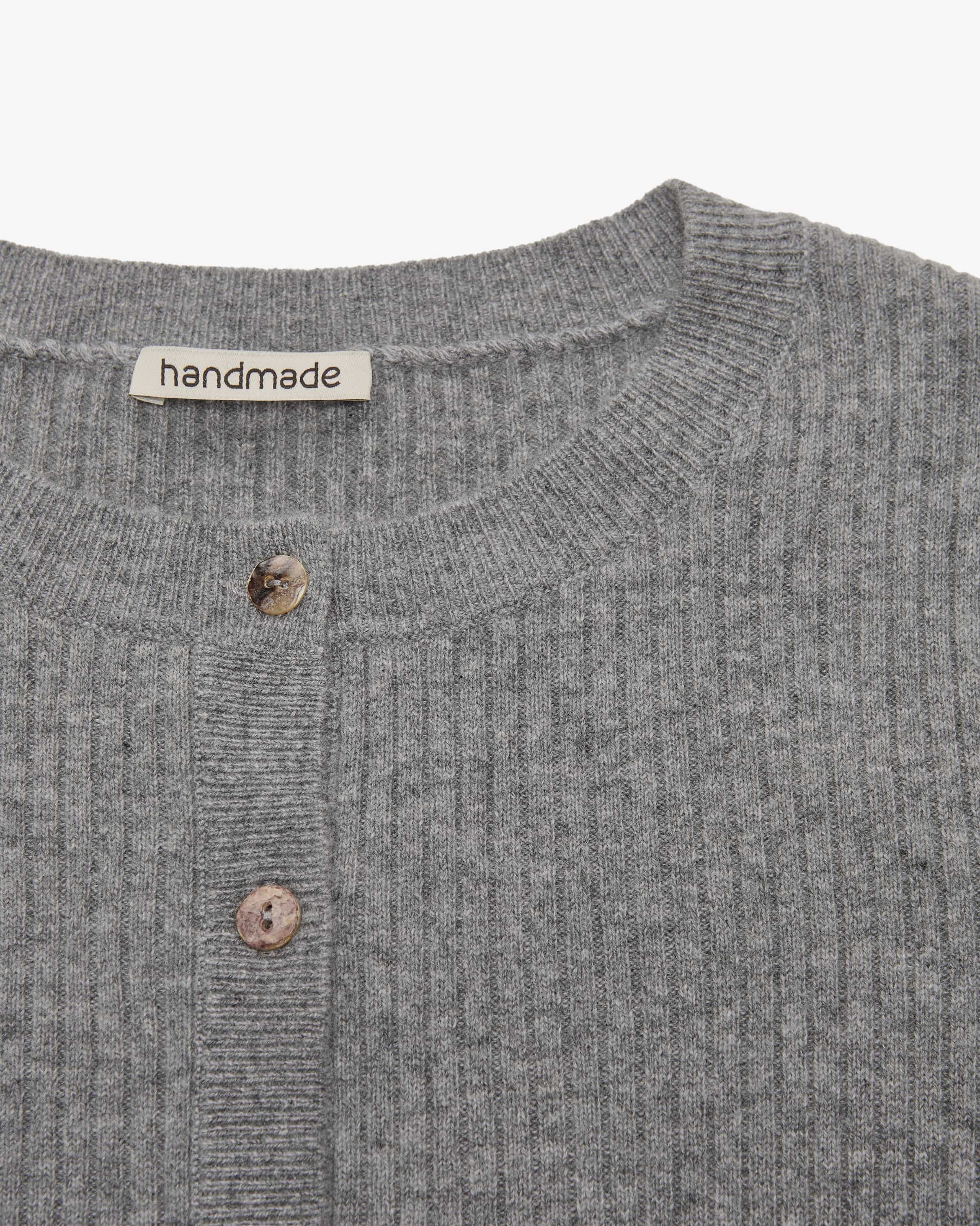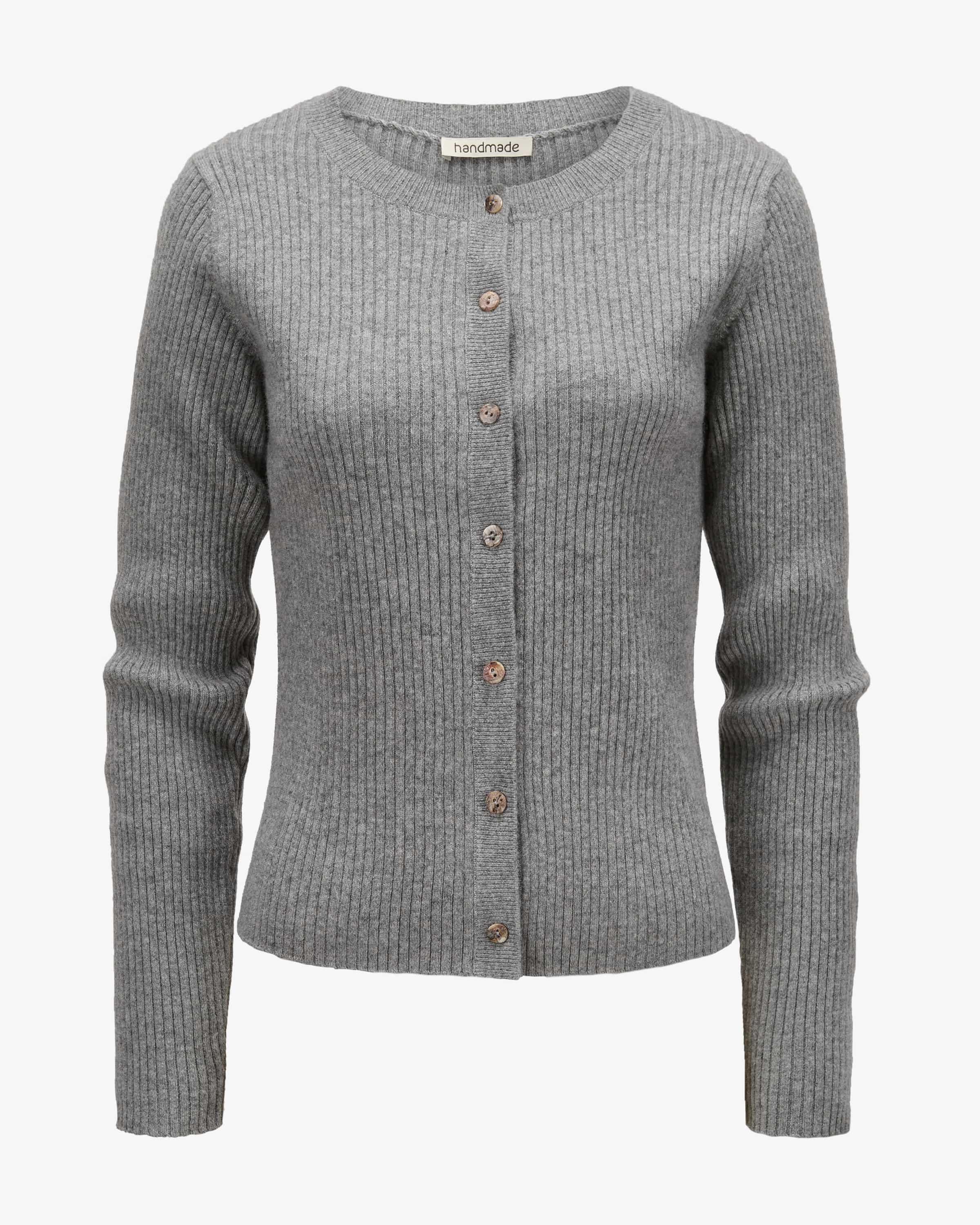 Cashmere-Strickjacke für Damen von handmade in Grau. Das Modell präsentiert sich dank der hochwertigen Cashmere-Verarbeitung als Casual Begleiter mit hohem Tragekomfort, während die sonst klassische Aufmachung einen kombistarken Favoriten für Ihre Garderobe schafft.