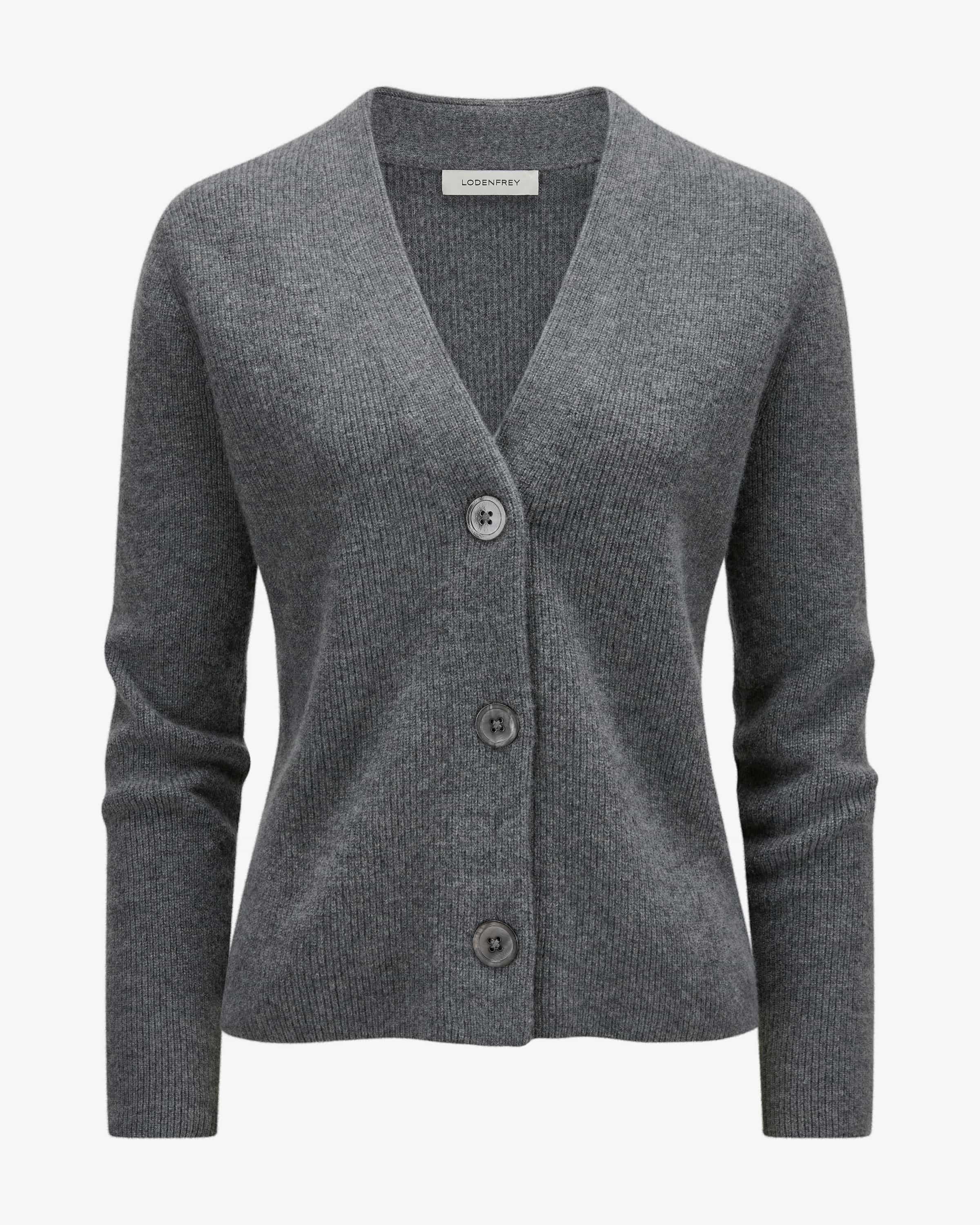 Cashmere-Strickjacke für Damen von LODENFREY in Grau. Das Modell in schlichter Aufmachung überzeugt dank der feinen Cashmere-Qualität mit angenehmen Tragemomenten, während die markanten Knöpfe einen klassischen Begleiter für vielseitige Styles schaffen.