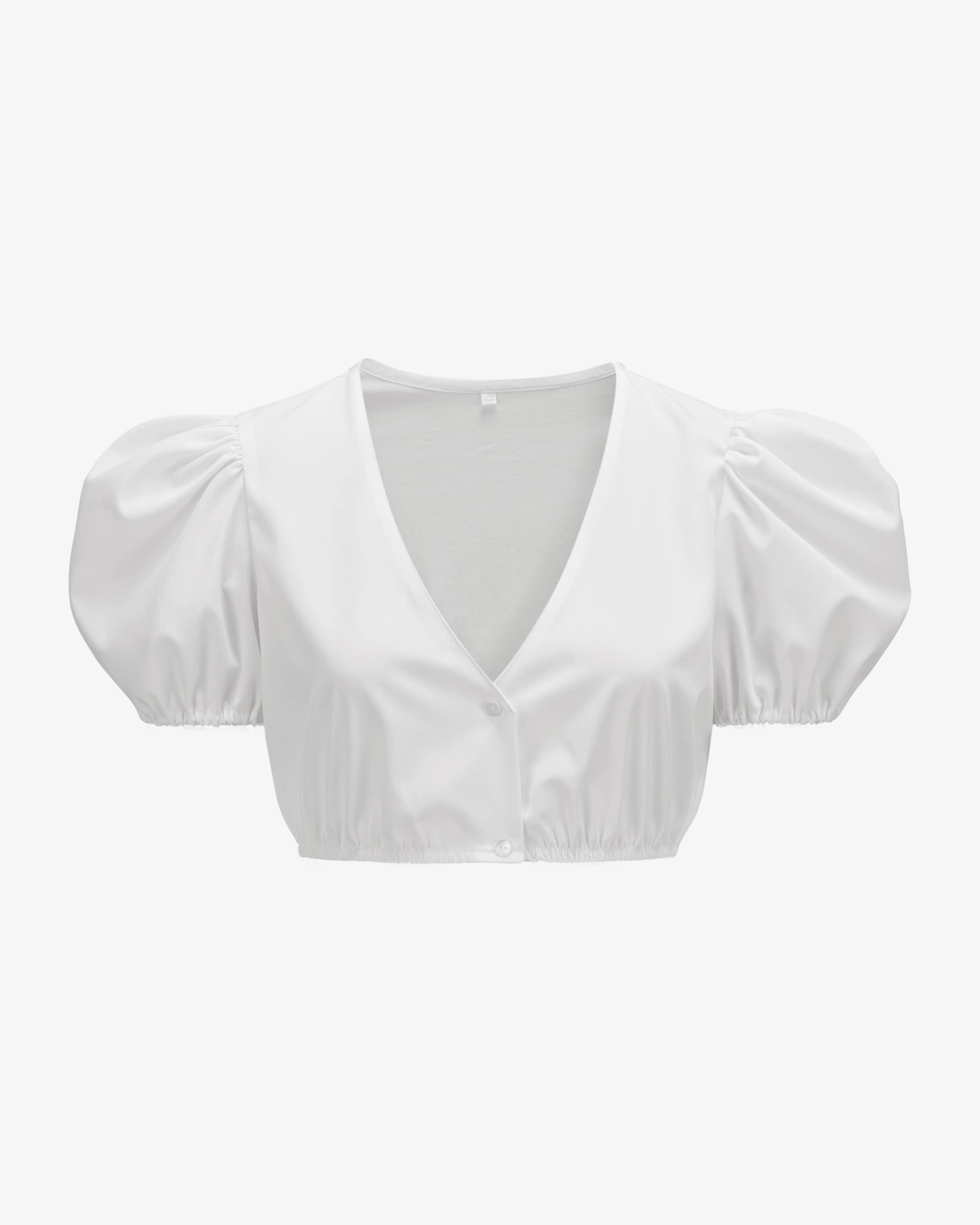 Clara Dirndlbluse für Damen von Giacomelli Trachten in Weiß. Das Modell punktet dank femininer Puffärmel in stilvoller Aufmachung, während der tiefe V- Ausschnitt das traditionelle Gesamtbild stilvoll inszeniert.