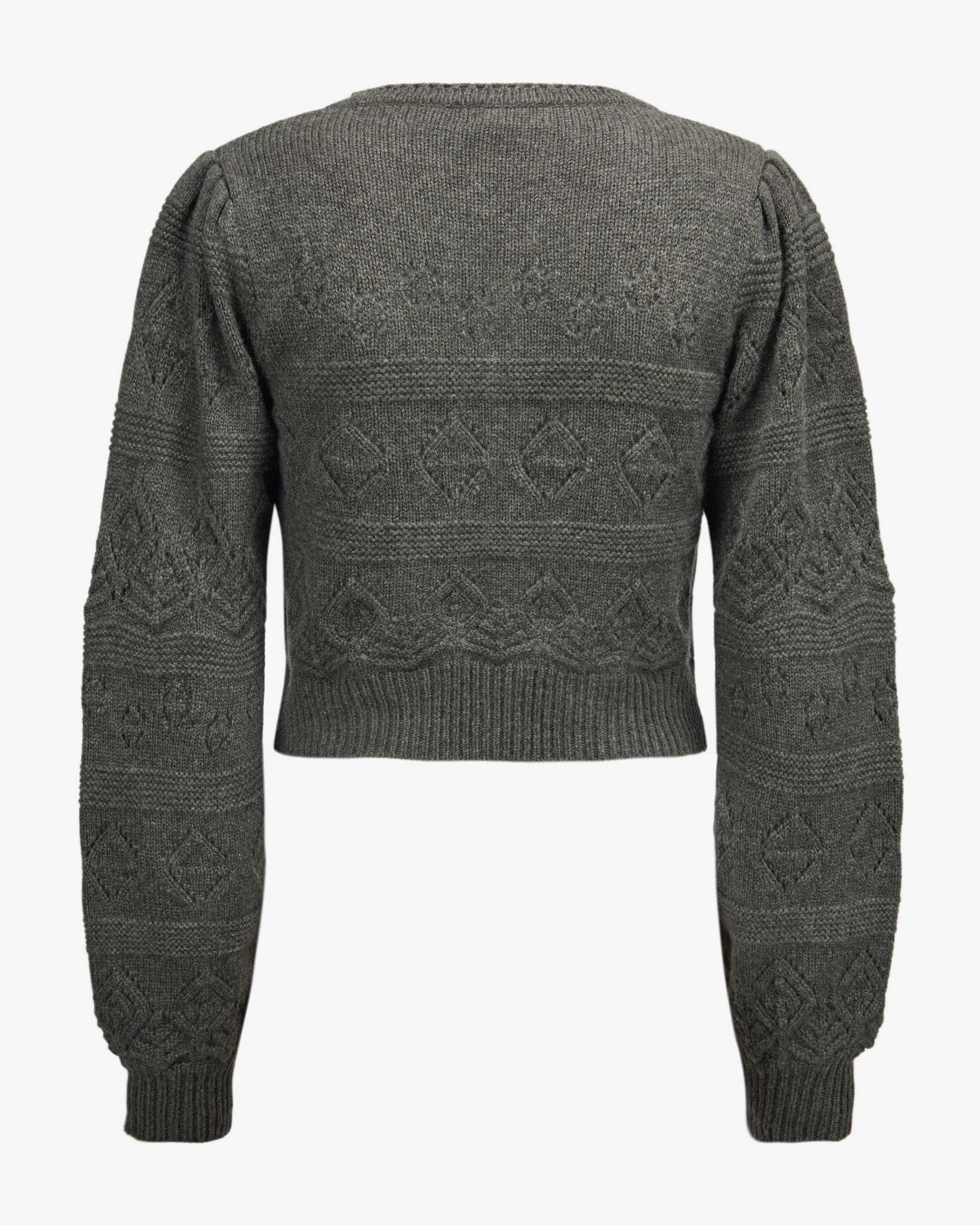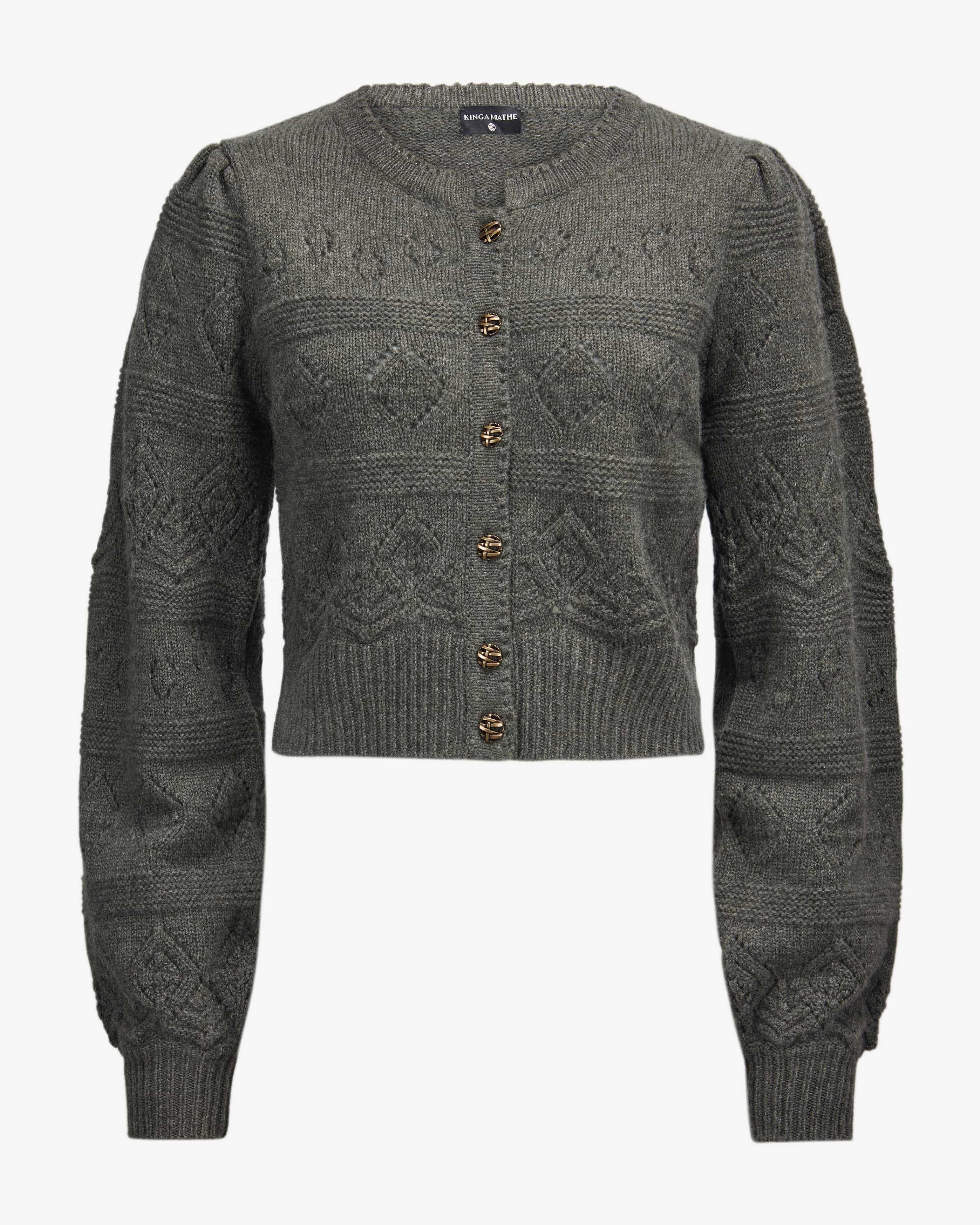 Dakota Trachten-Cashmere-Strickjacke für Damen von Kinga Mathe in Oliv. Tradition und Moderne in perfektem Zusammenspiel – Das Modell begeistert durch die raffinierte Ajour-Strick-Qualität, während raffinierte Knöpfe den Trachten- Look charmant abrunden.