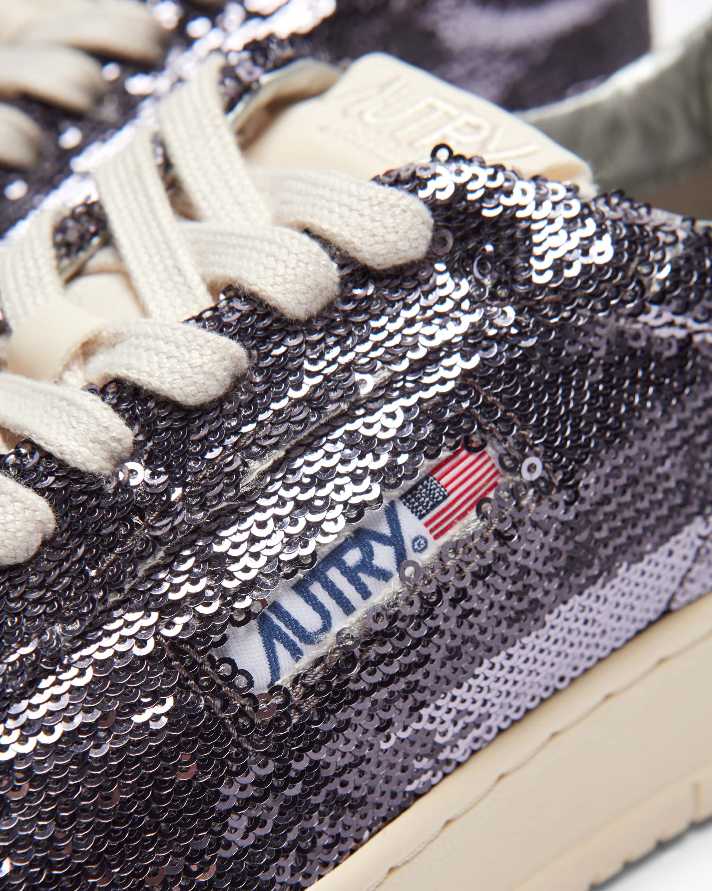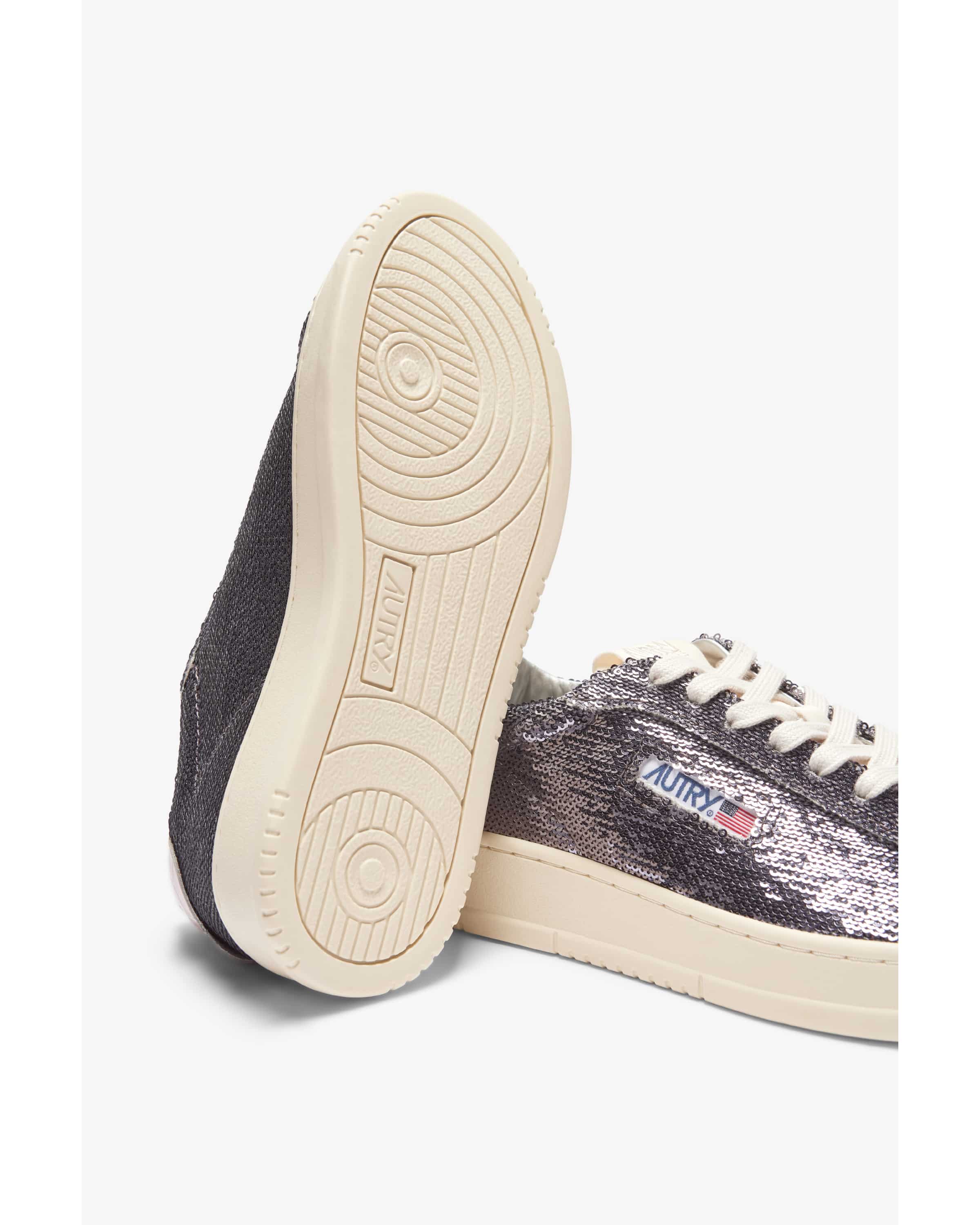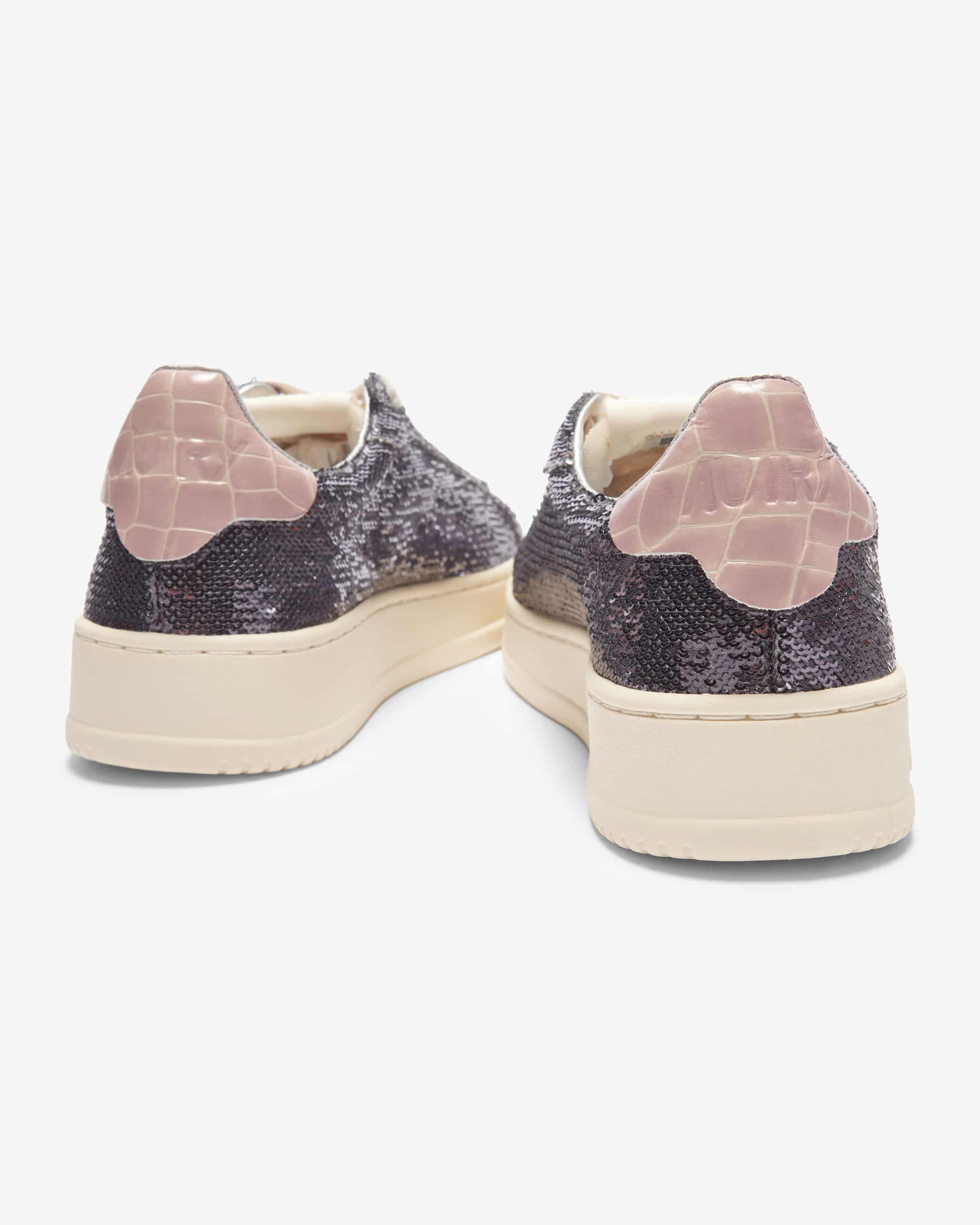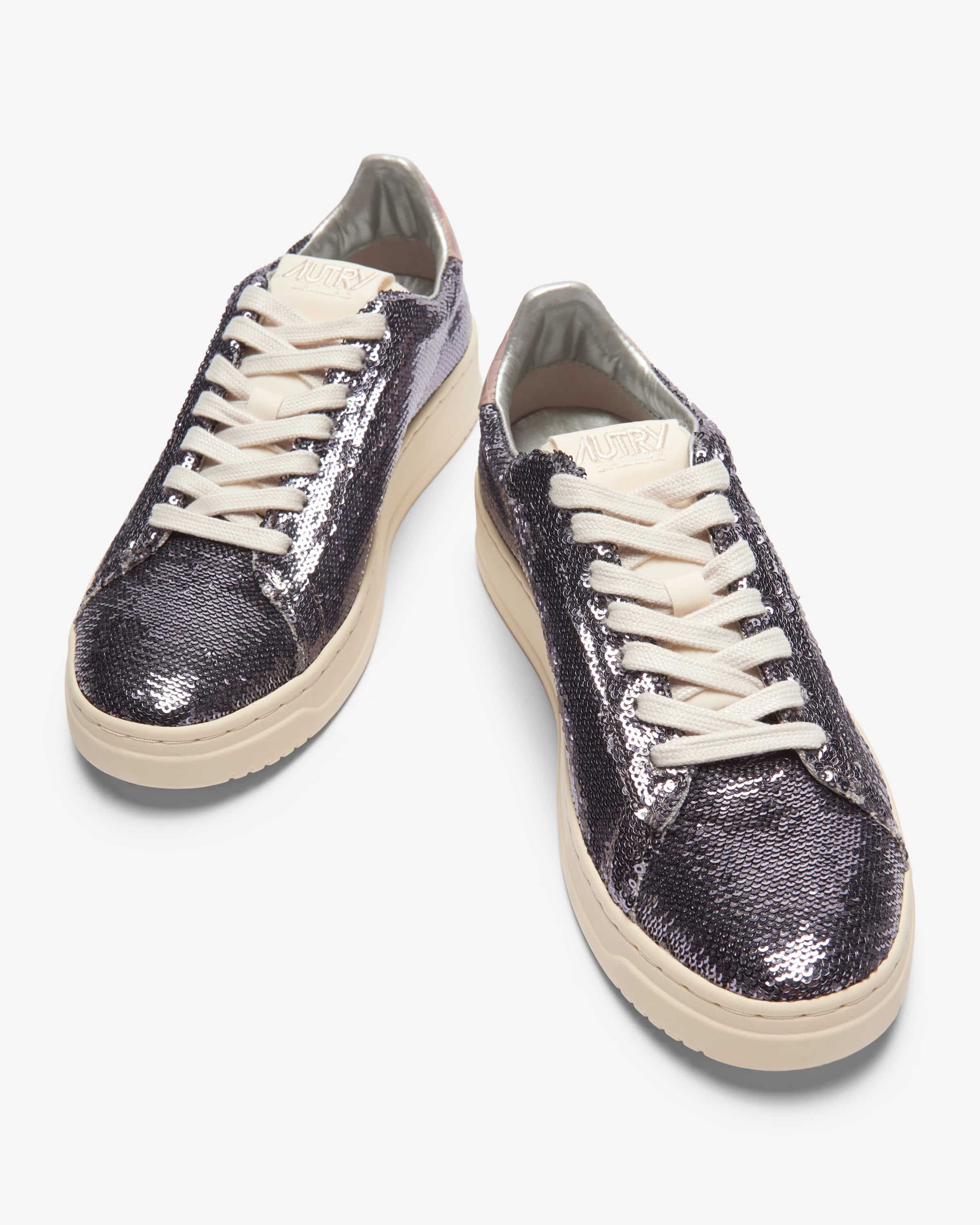 Dallas Low Sneaker für Damen von Autry in Creme und Violett. Das Modell präsentiert sich in hochwertigem Material-Mix aus Leder, Textil und goldenen Pailletten, die sowohl haptisch als auch optisch überzeugen. Das weiche Frottee- Innenfutter und die fummierte Sohle garantieren zudem einen angenehmen Tragekomfort.
