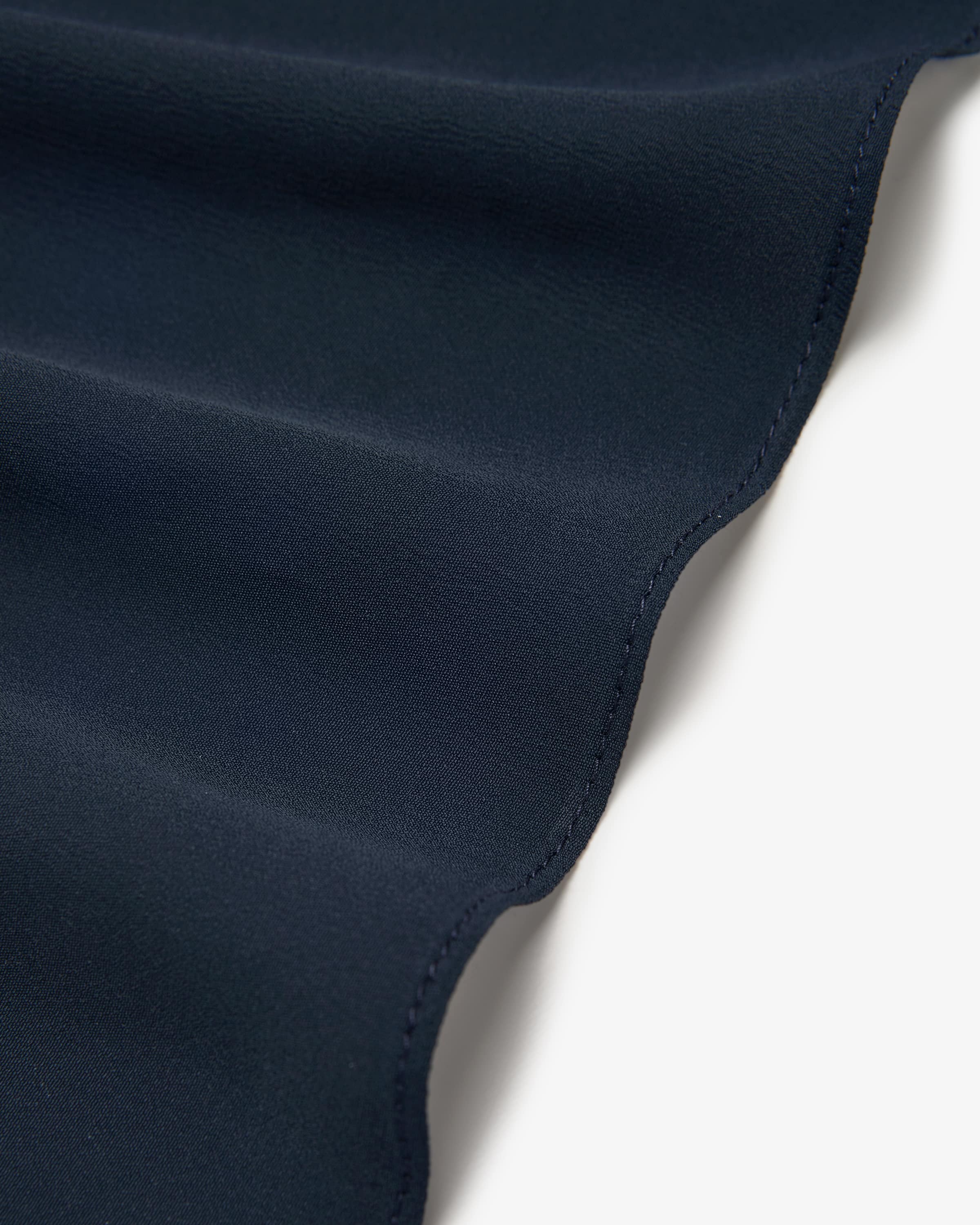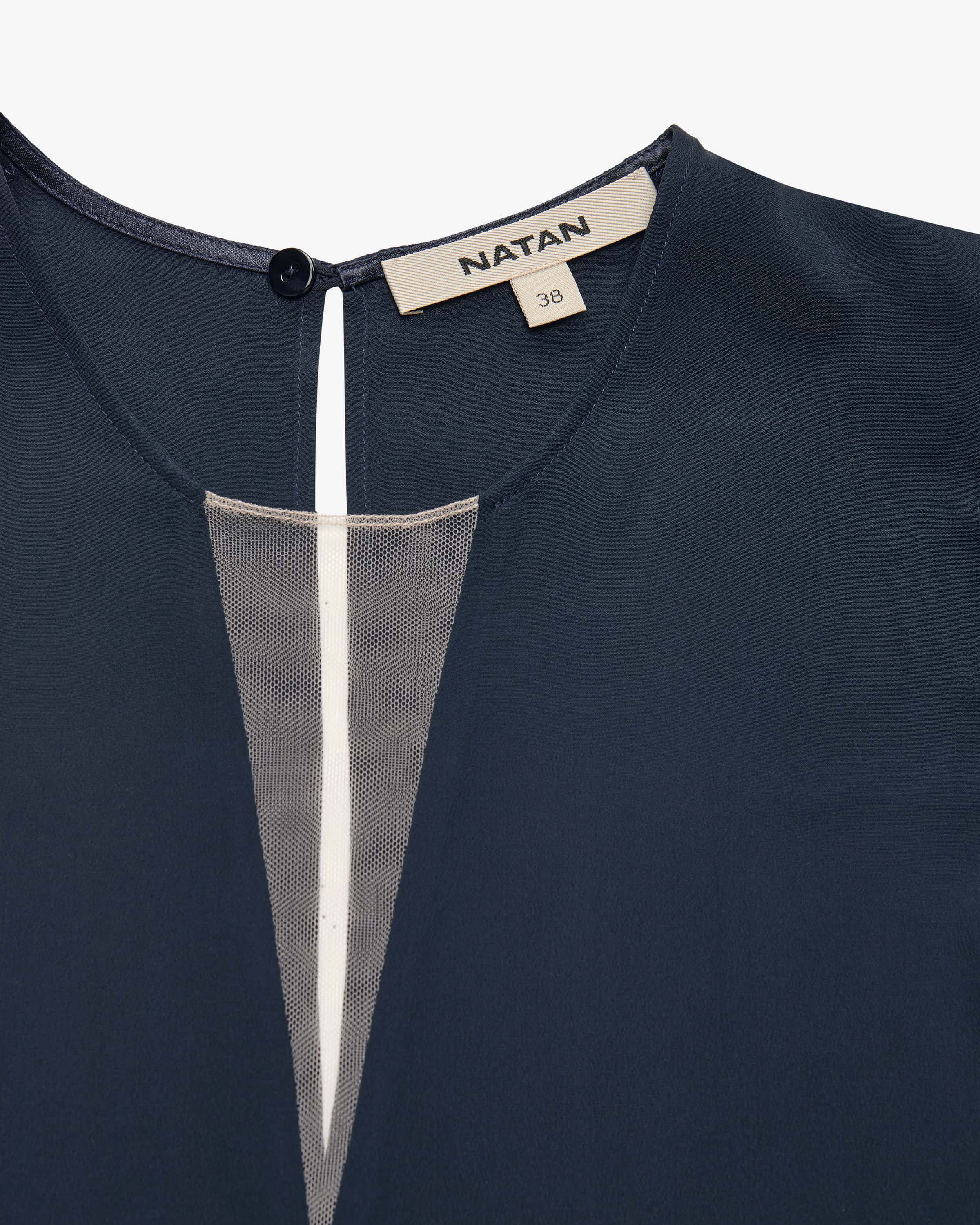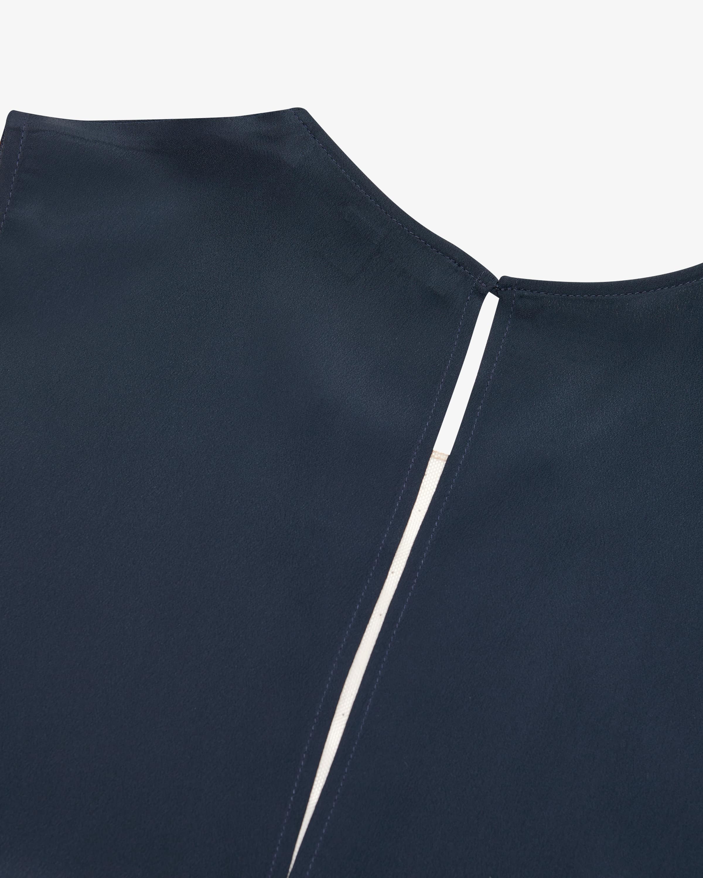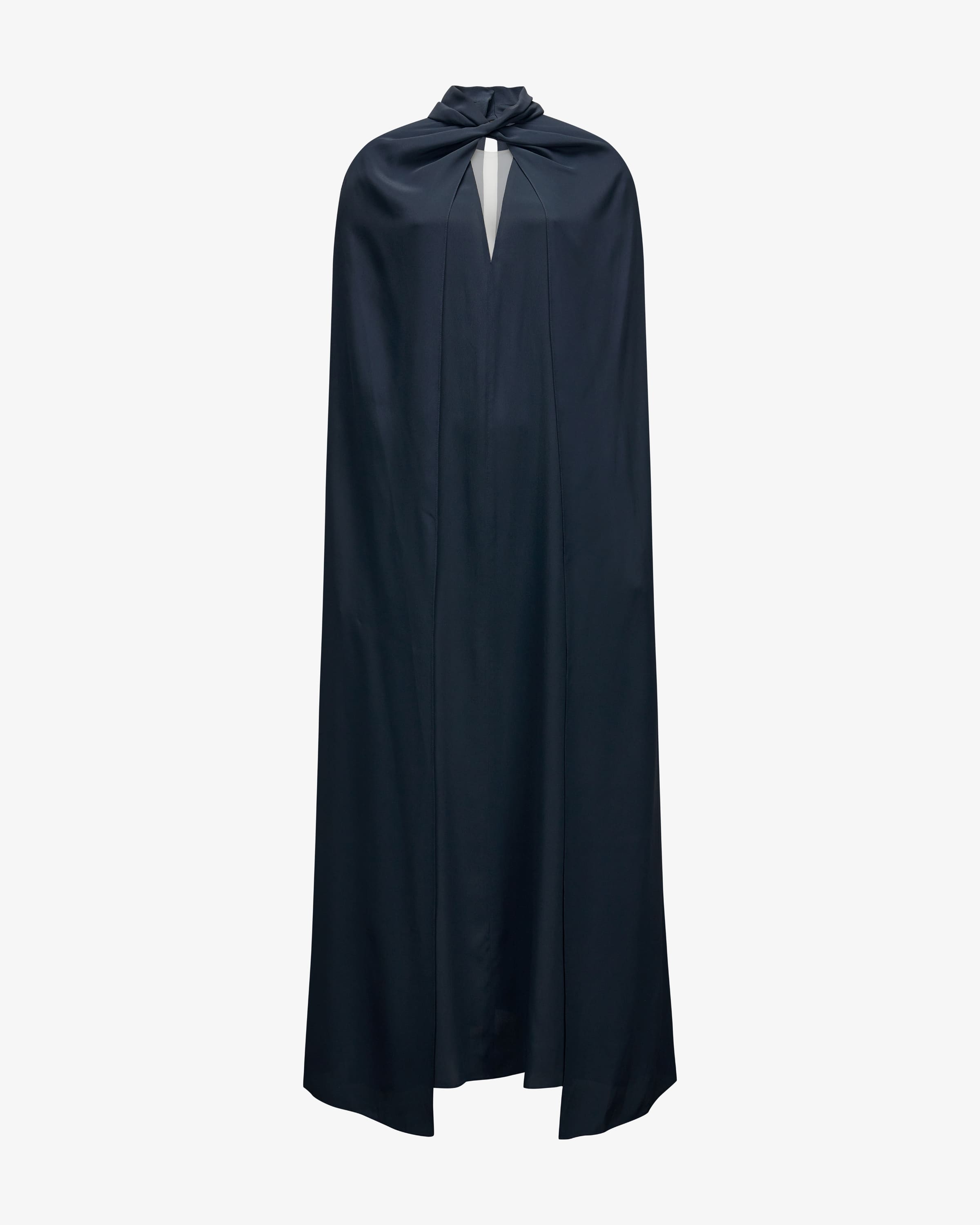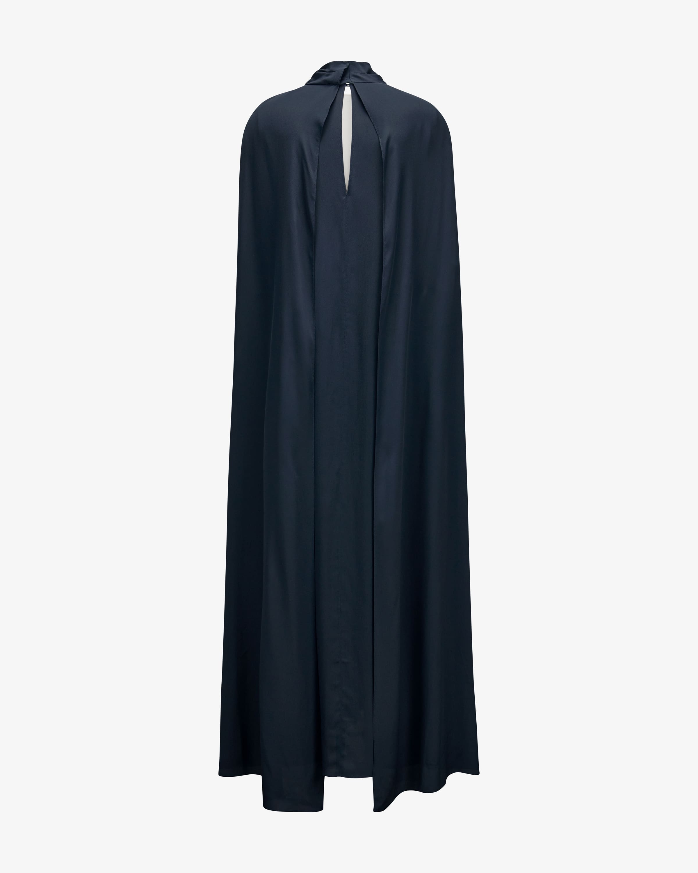 Daphi Kleid für Damen von Natan in Marine. Das Modell zeichnet sich durch die fließende Verarbeitung mit Seide aus, welche sowohl haptisch als auch optisch überzeugt. Das abnehmbare Cape mit Stehkragen und feinen Raffungen rundet den extravaganten Abend-Look gekonnt ab.