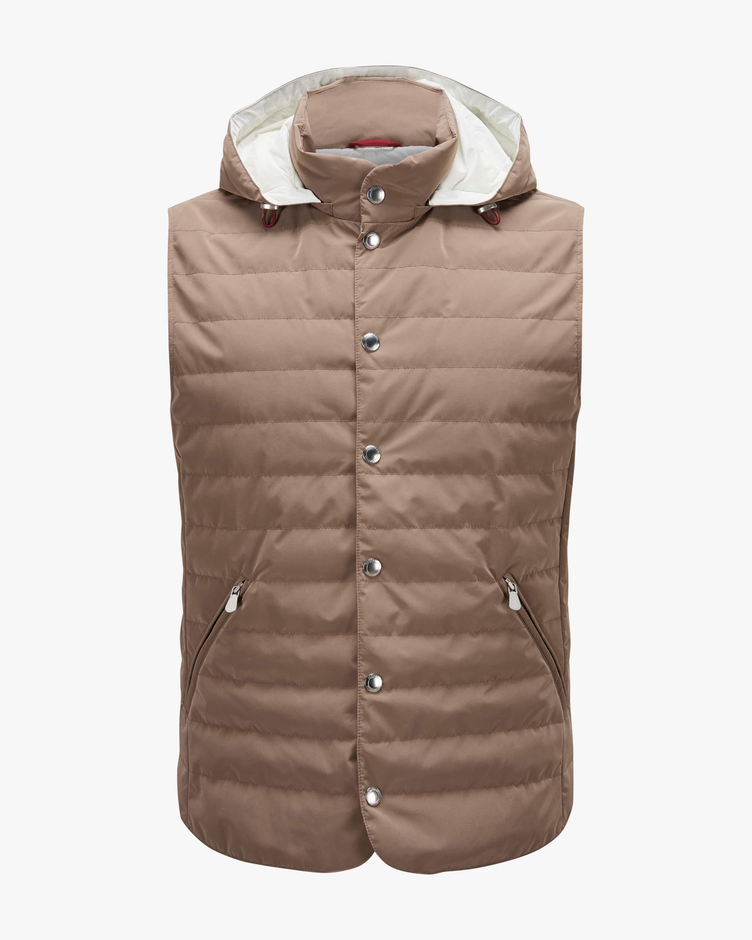 Daunenweste für Herren von Brunello Cucinelli in Taupe. In gesteppter Optik und klassischer Aufmachung besticht das Modell als sportiver Favorit mit maskulinem Charme. Dezente Logo-Details runden das Gesamtbild harmonisch ab, während die hochwertige Daunen-Feder-Füllung eine perfekte Wärmeisolierung verspricht.