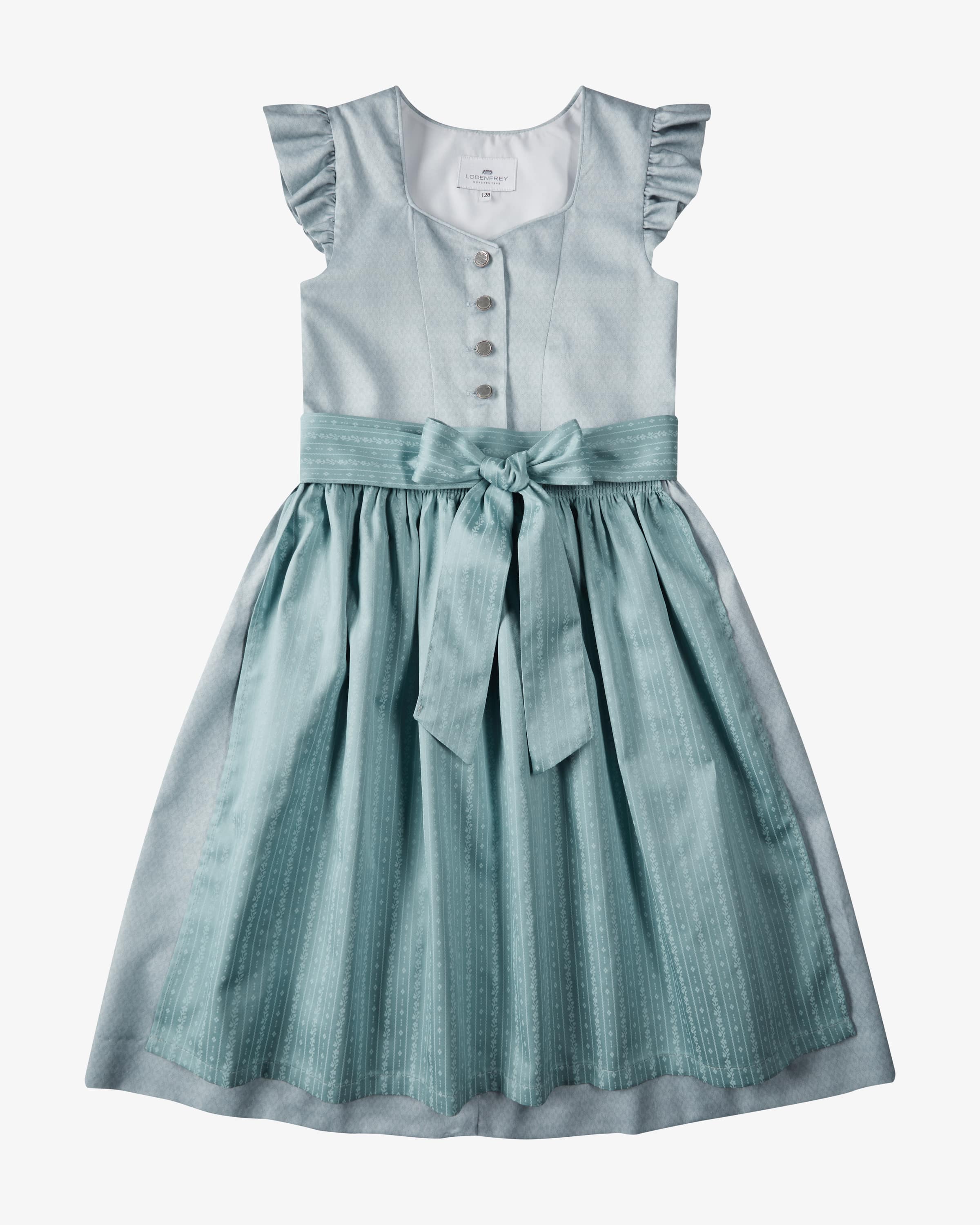 Dirndl mit Schürze Emmi für Mädchen von LODENFREY in Eisblau. Mit viel Liebe zum Detail entwirft das Label zeitlose Designs für stilsichere Looks, die sich an aktuellen Trends orientieren. Dank der klassischen Schnittführung begeistert das süße Modell mit zeitlosem Charme. Zugleich sorgt das tonale Design und die gestreifte-Schürze für optische Highlights.