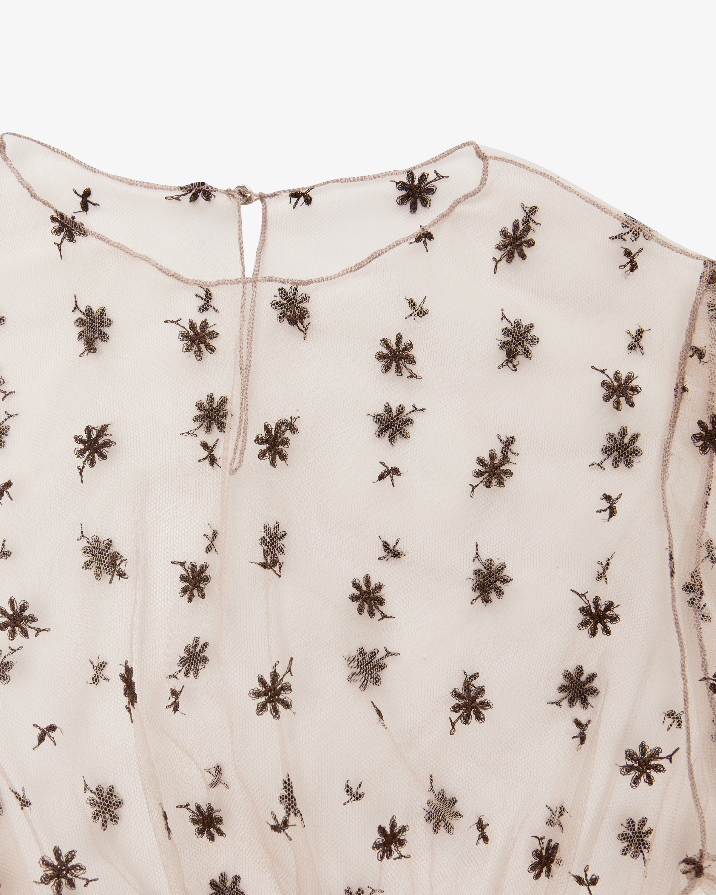 Blumen-Stickereien sowie den kurzen Ballonärmeln überzeugt