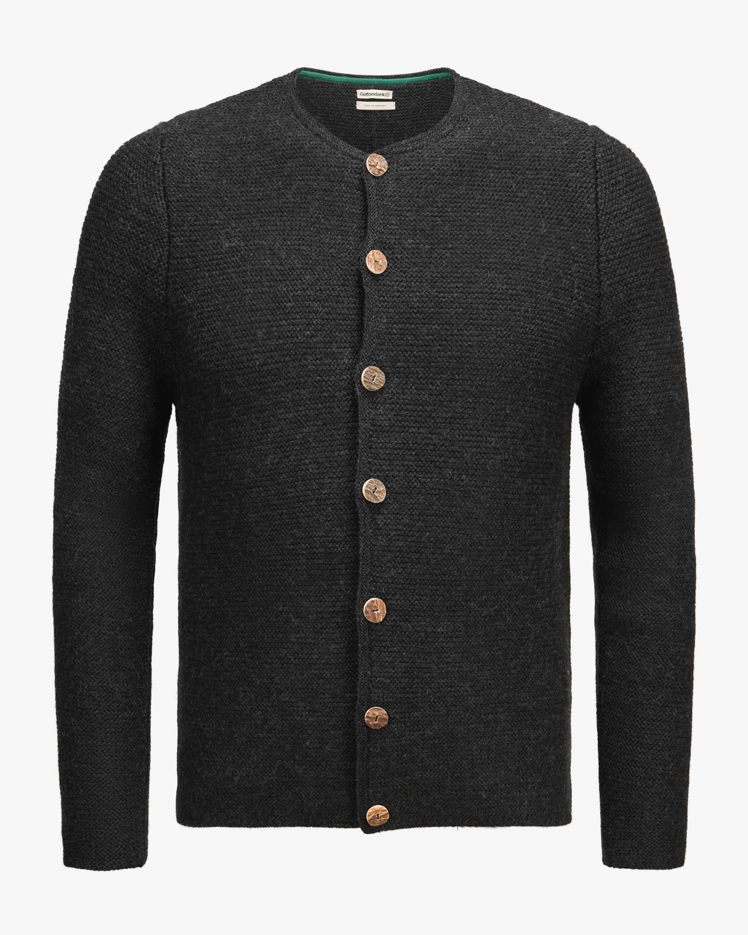 Franz Trachten-Strickjacke für Herren von Gottseidank in Schwarz. Tracht mit Charakter - Traditionelle Details sowie hochwertige Verarbeitung schaffen ein modernes Highlight für besondere Herren-Outfits. Zugleich untermalen rustikale Hornknöpfe das Trachten-Design aus feiner Schurwolle gekonnt.