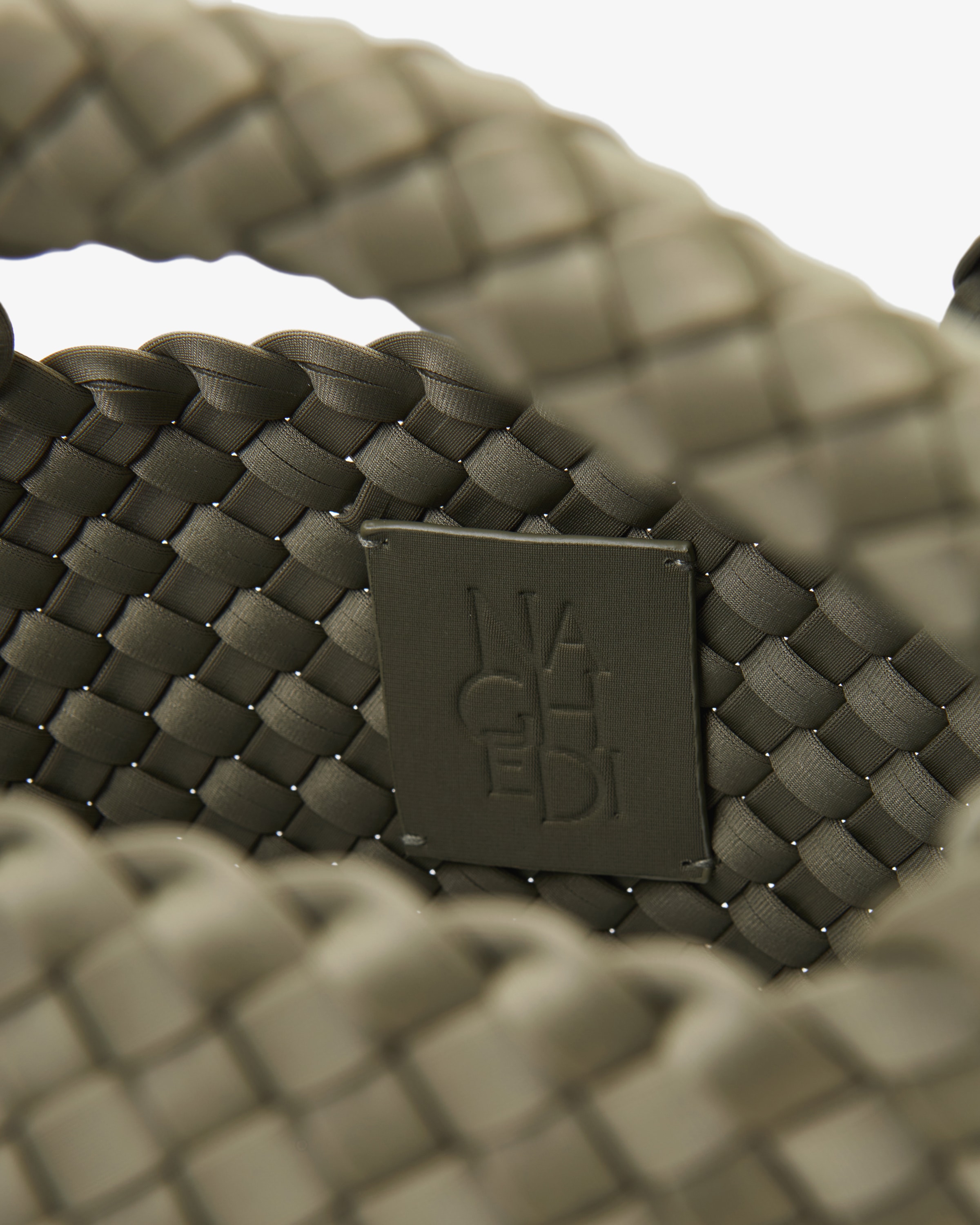 St. Barths Small Tote Handtasche für Damen von Naghedi in Salbei. Dieses textile Modell präsentiert sich in dezent changierender Optik und edler Flecht- Aufmachung, während das cleane Design für einen zeitlosen Look sorgt. Die separate Clutch ist mit einem Reißverschluss versehen und bietet Platz für Ihre Kosmetikartikel oder andere Kleinigkeiten.
