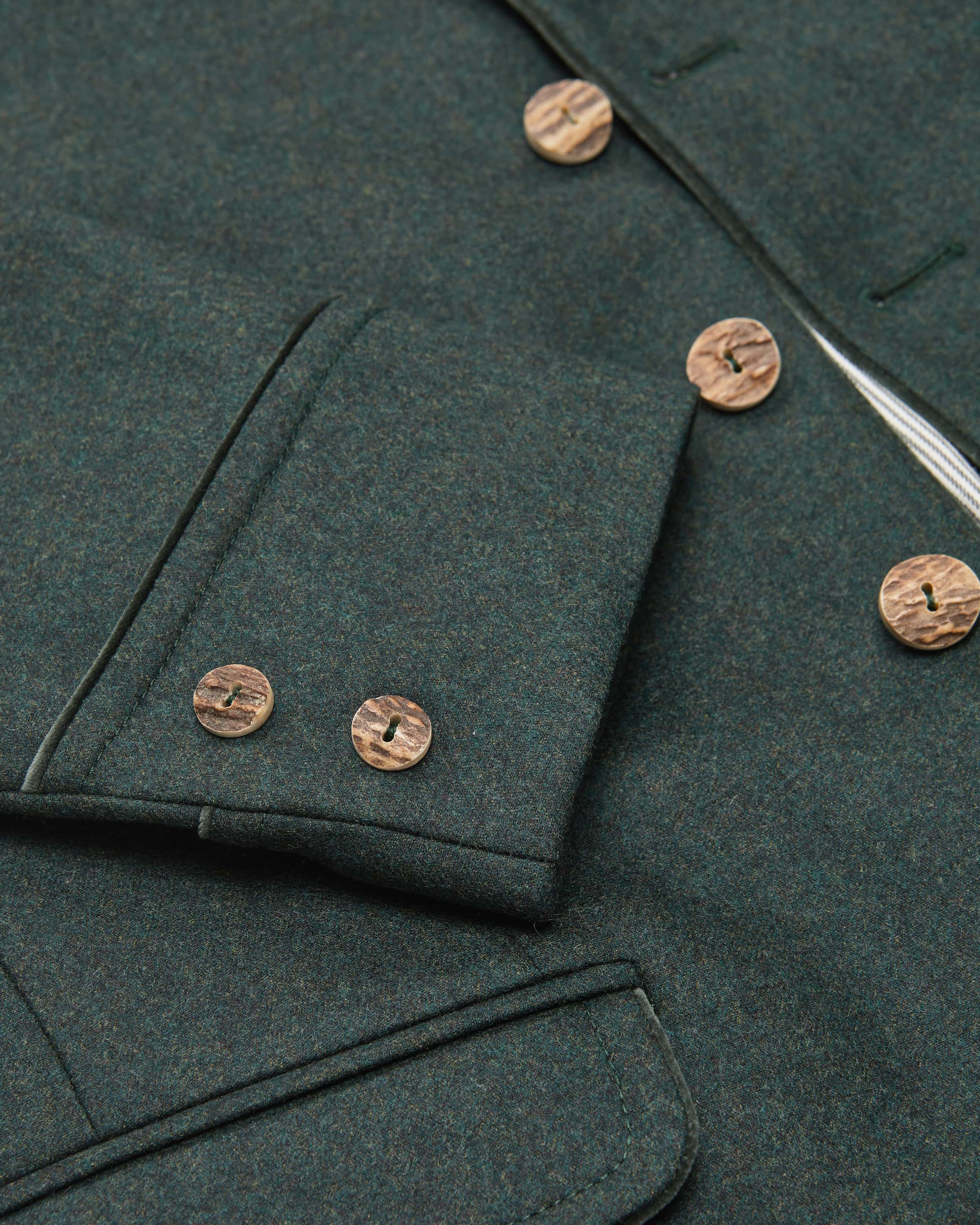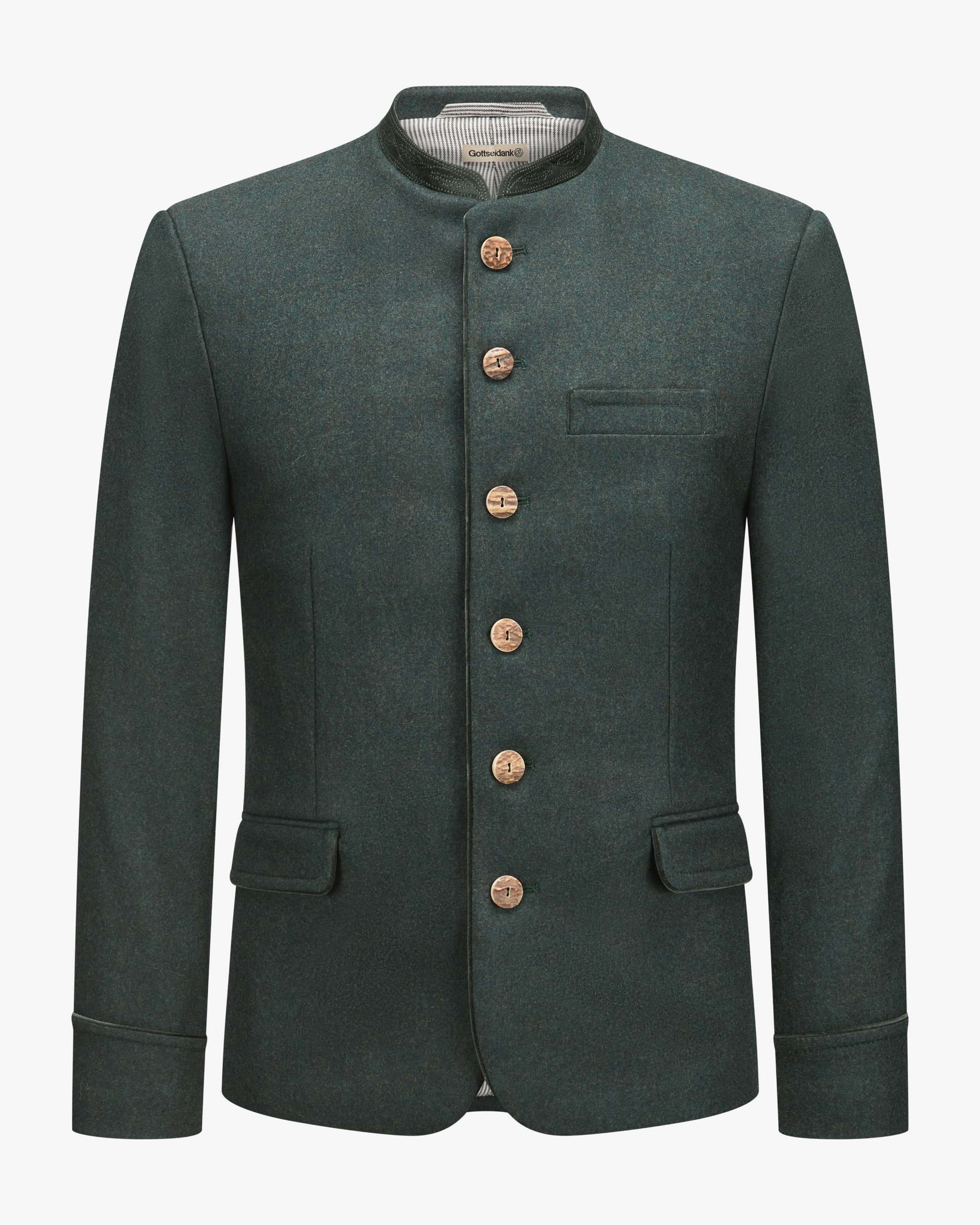 Helmut Trachten-Janker für Herren von Gottseidank in Flaschengrün. Das Modell überzeugt durch die feine Schurwoll-Qualität zusammen mit eleganten Paspelierungen in traditioneller Aufmachung, während rustikale Hornknöpfe und der rückseitige Riegel das stilvolle Trachten-Design gekonnt abrunden.