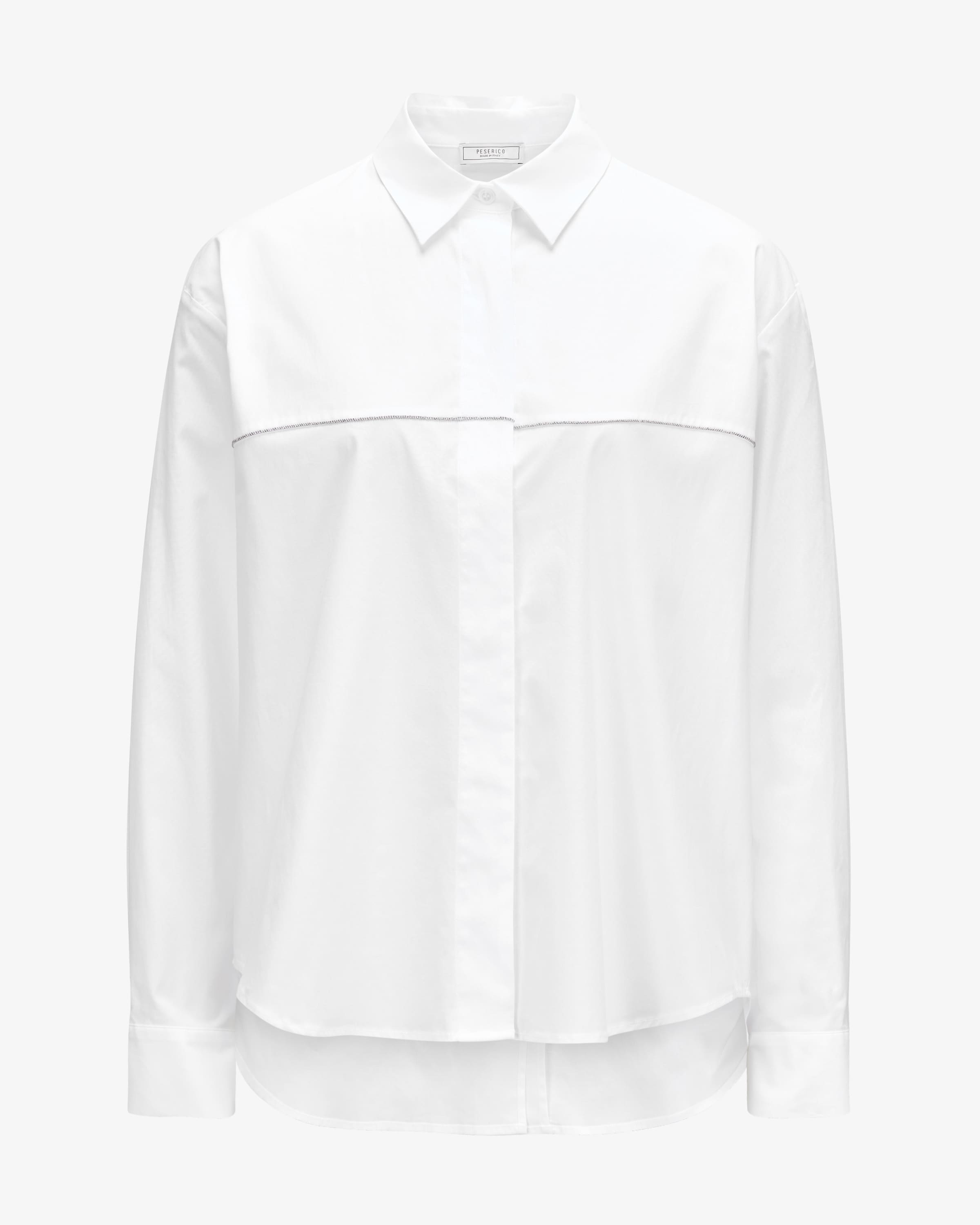 Hemdbluse für Damen von Peserico in Weiß. Die italienische Marke steht für feine Damenmode mit Fokus auf Materialien, Passform und Handwerkskunst. Auch dieses weite Modell präsentiert sich mit leichtem Baumwoll-Mix, der angenehmen Tragekomfort garantiert. Die feine Ketten-Applikation rundet den femininen Power-Look harmonisch ab.