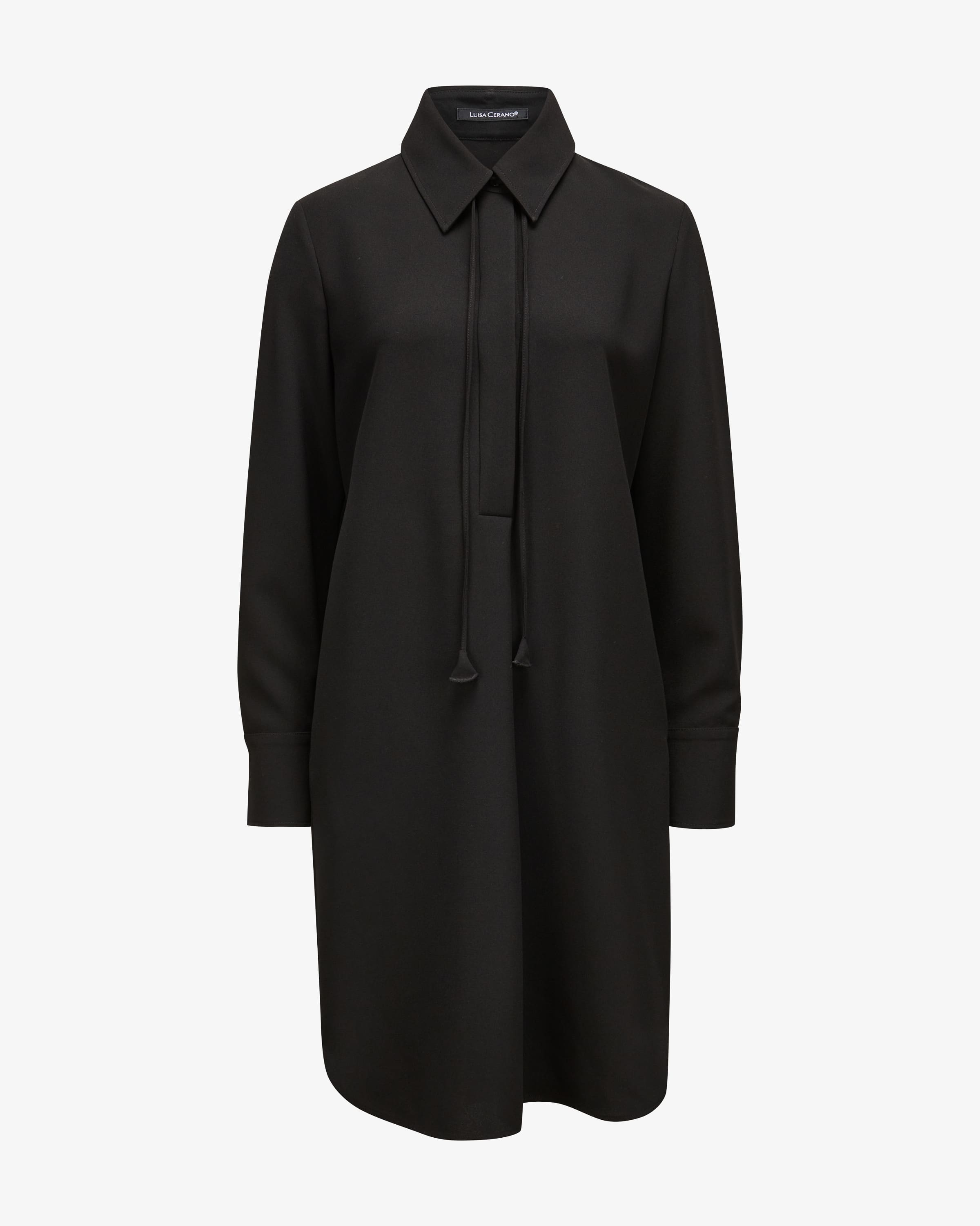 Hemdblusenkleid für Damen von Luisa Cerano in Schwarz. Das deutsche Modelabel Luisa Cerano begeistert mit luxuriöser, femininer Damenmode, die durch hochwertige Materialien, lässige Schnitte, vielfältige Farben und subtile Eleganz überzeugt. Auch dieses Modell begeistert mit klassischen Hemdblusen- Details, während die schmalen Taillenbänder eine feminine Silhouette zaubern.