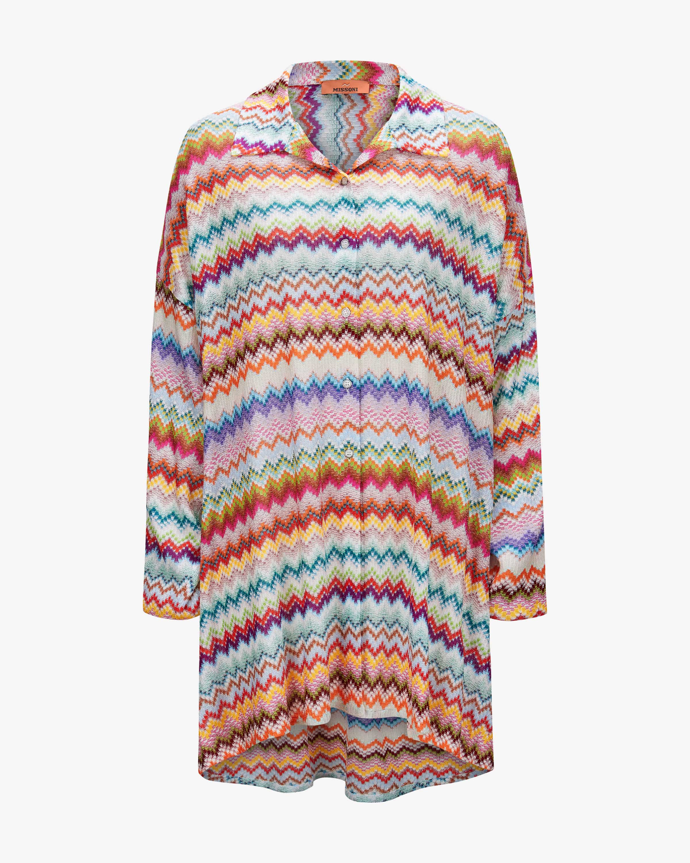 Hemdblusenkleid für Damen von Missoni in Bunt. Das italienische Modehaus ist bekannt für farbenfrohe Strickkunst & Zickzack-Muster. Auch dieses Modell präsentiert sich im labeltypischen Zick-Zack-Dessin, das durch die Glitzer- Details raffiniert ergänzt wird, während die weite Silhouette mit überschnittenen Schultern einen sommerlichen Look zaubert.