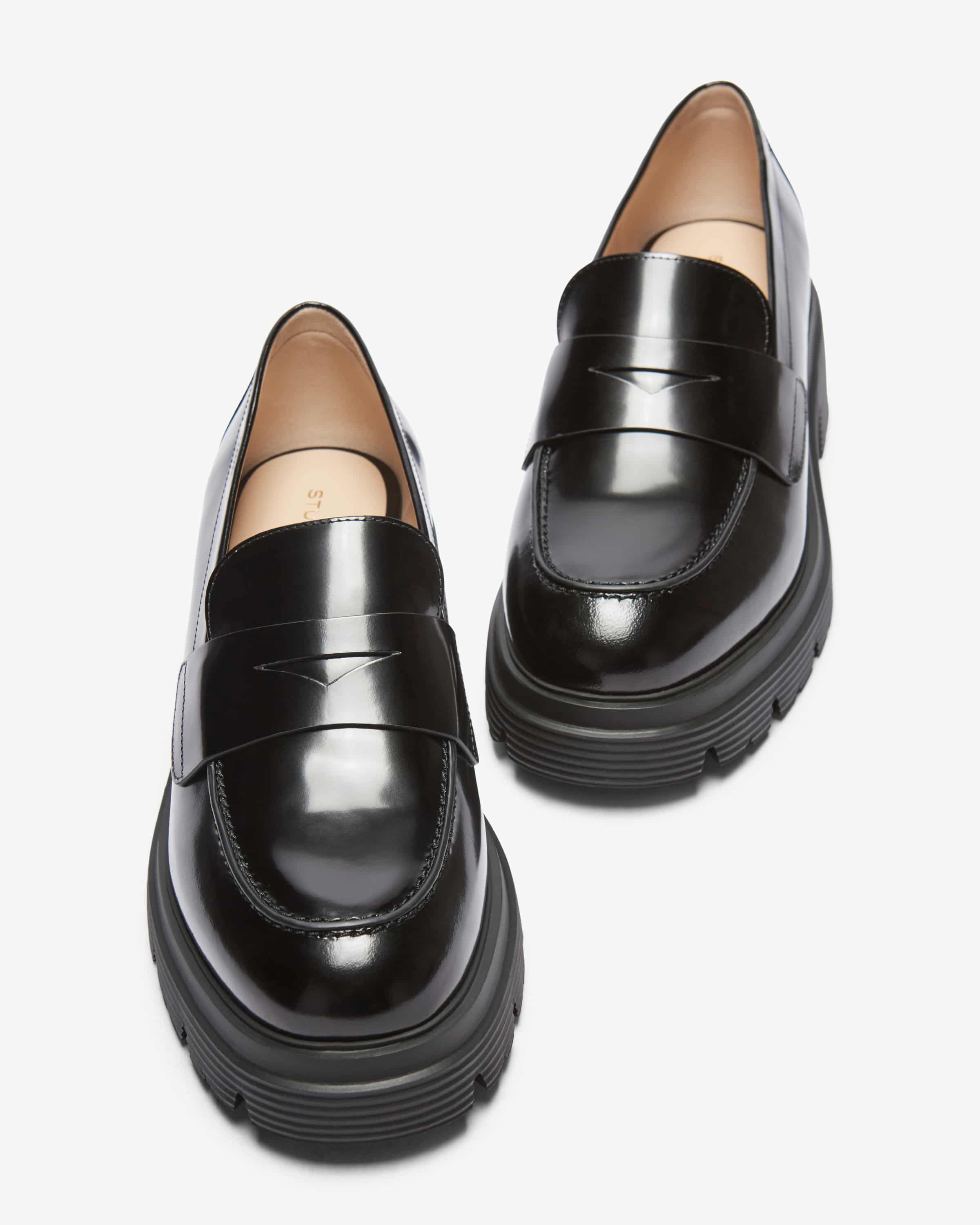 Hudson Lite Loafer für Damen von Stuart Weitzman in Schwarz. Die US-Marke ist weltbekannt für elegante Pumps, Overknees und Bridal-Heels – luxuriös, aber tragbar. Glattes Leder verleiht dem robusten Modell eine edle Note, während Ziernähte und ein dekorativer Zierriegel für den stilvollen Feinschliff sorgen – ein vielseitiger Begleiter für modische Looks mit Brit-Chic-Flair.