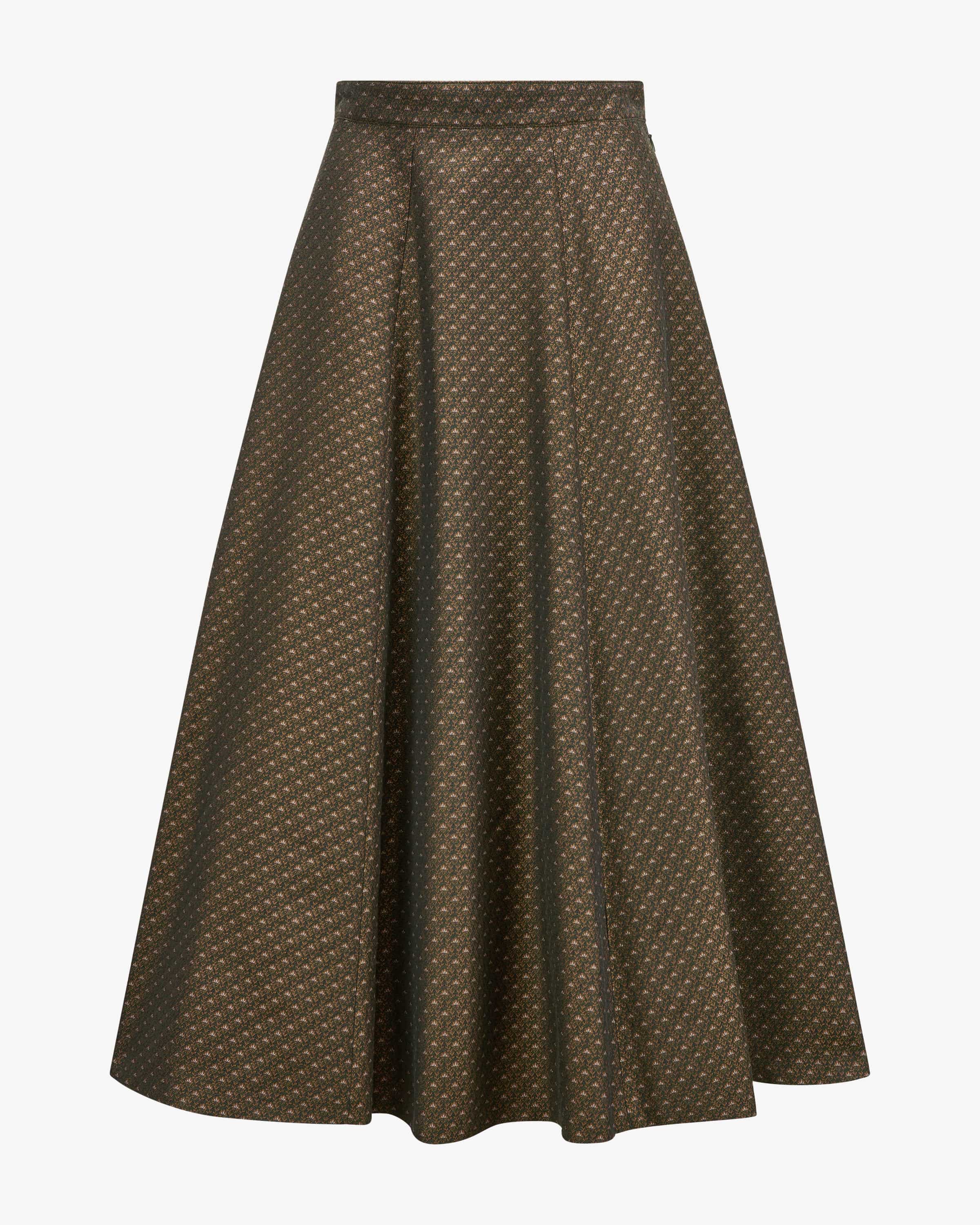 Ileane Trachtenrock für Damen von Grasegger x Lodenfrey in Oliv, Camel und Creme. Das in Kooperation mit Lodenfrey designte Modell präsentiert sich in traditioneller Aufmachung und raffiniertem Jacquard-Muster, das dem Design eine edle Note verleiht.