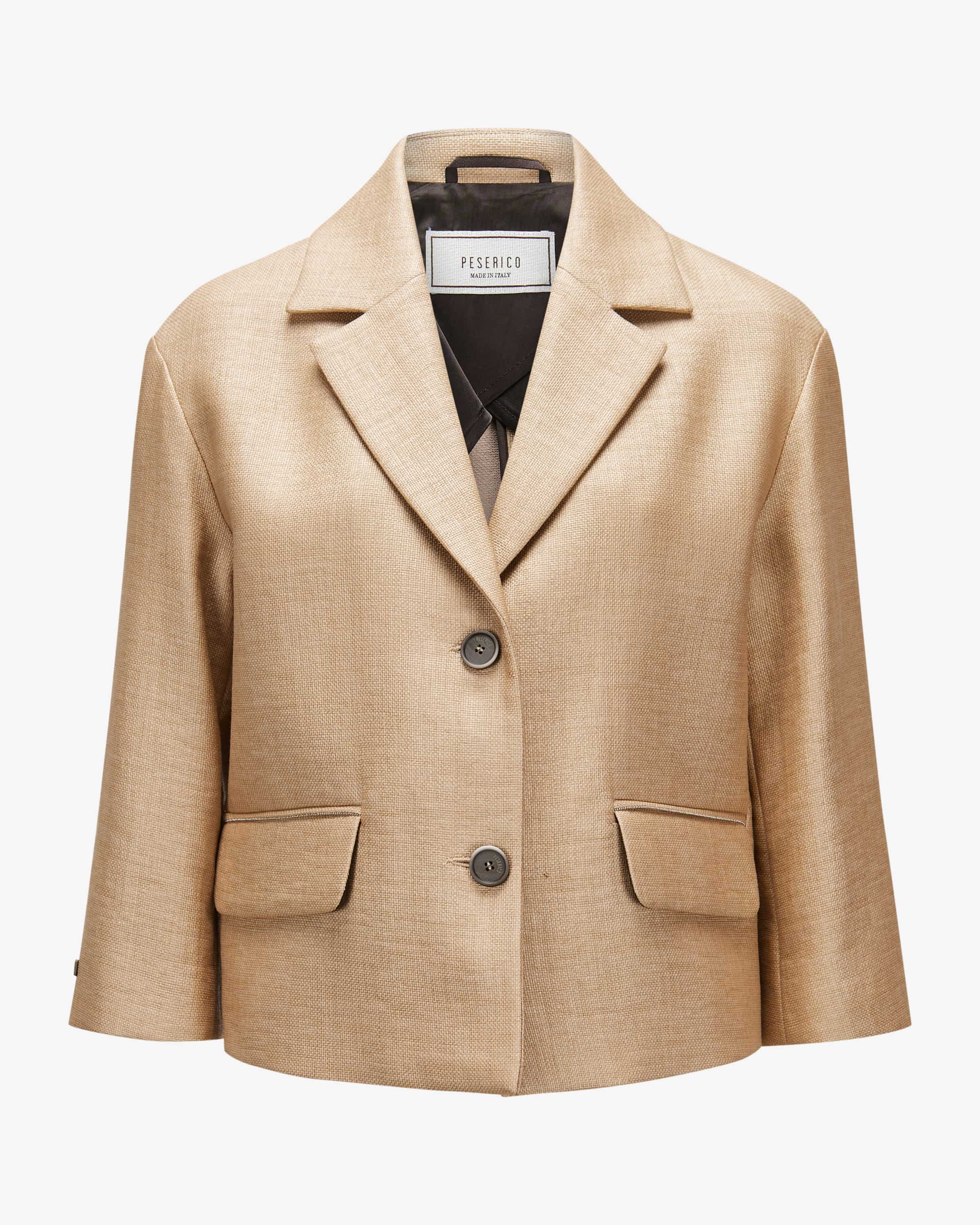 Jacke für Damen von Peserico in Beige. Die italienische Marke steht für feine Damenmode mit Fokus auf Materialien, Passform und Handwerkskunst. Auch dieses Modell in moderner Passform überzeugt mit fester Haptik, während die silberfarbenen Schmuckketten für optisches Augenmerk sorgen, runden die verkürzten Ärmel und Raffia-Aufmachung das Gesamtbild harmonisch ab.