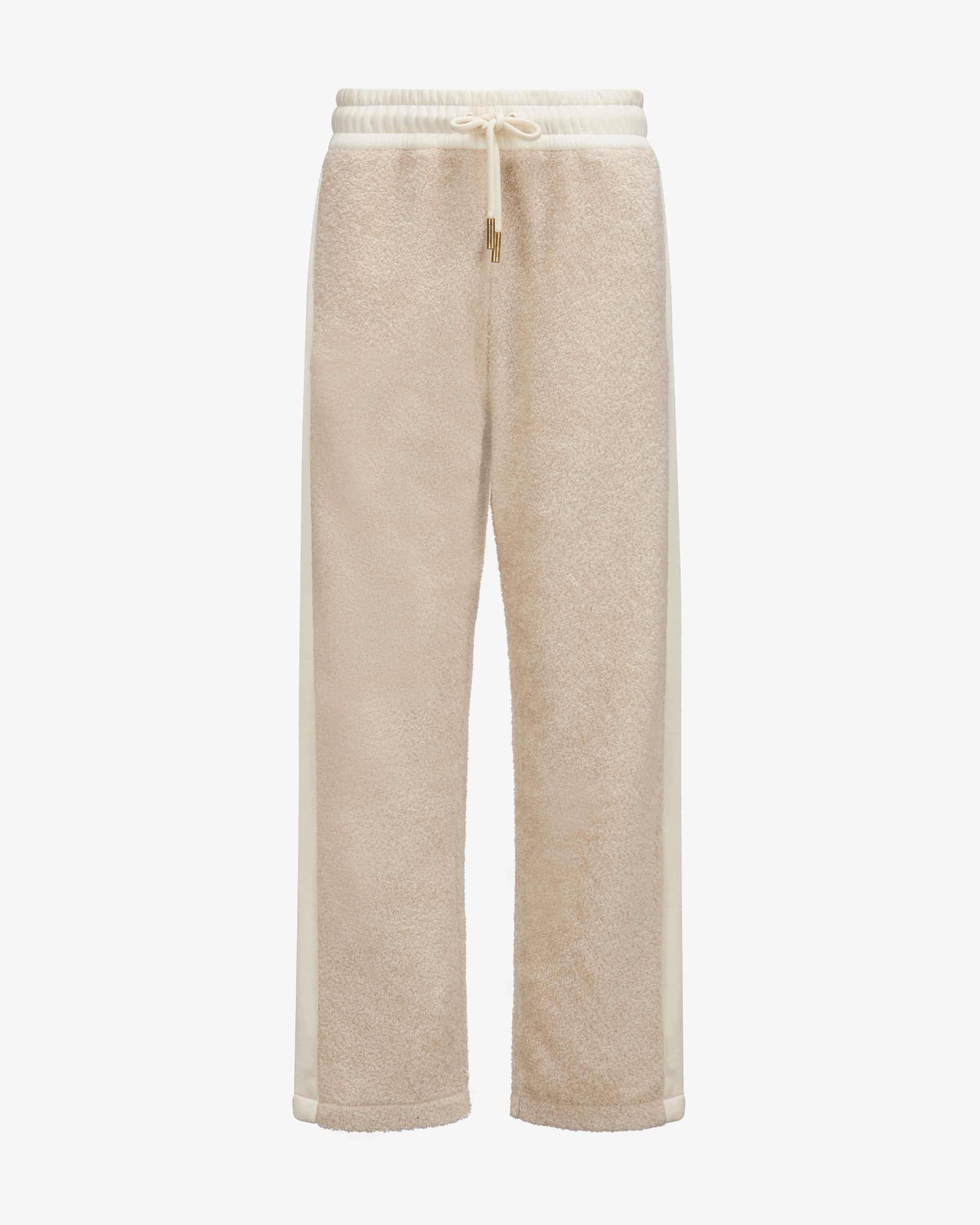 Joggpants für Damen von Moncler in Creme. Das Modell begeistert mit weichem Teddyfell und einem elastischen Bund, der für höchsten Tragekomfort sorgt. Seitliche Streifen und sportive Details verleihen dem legeren Look den letzten Schliff.