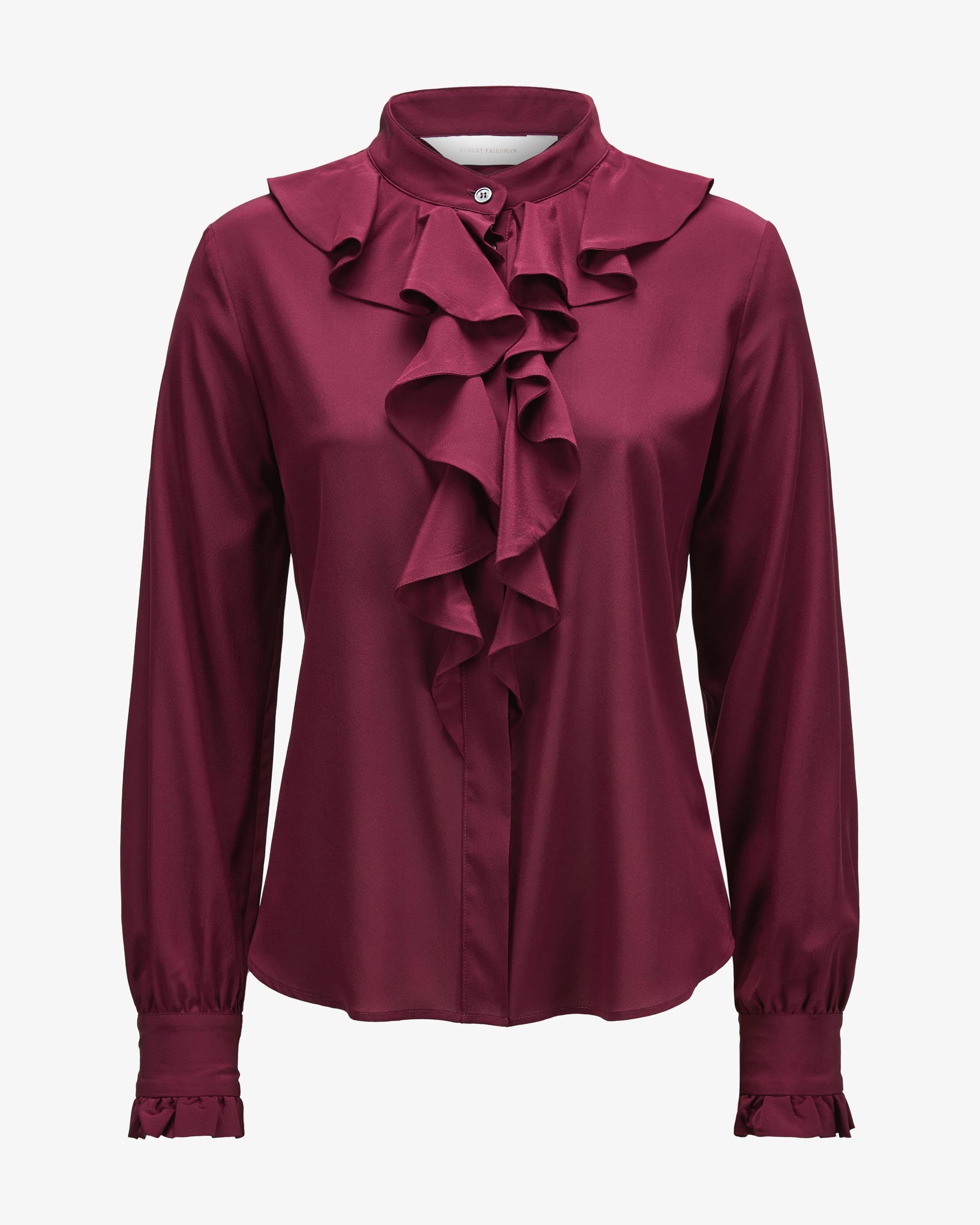 Kelly Seidenbluse für Damen von Robert Friedman in Bordeaux. Das Label steht für hochwertige Blusen und Hemden – italienische Stoffe, deutsche Passform, internationale Klasse. Auch dieses Modell begeistert mit hochwertiger Seiden- Qualität, der für angenehm fließenden Tragekomfort sorgt. Die feminine Aufmachung mit angesetztem Volant entlang der Knopfleiste rundet den modischen Look stilvoll ab.