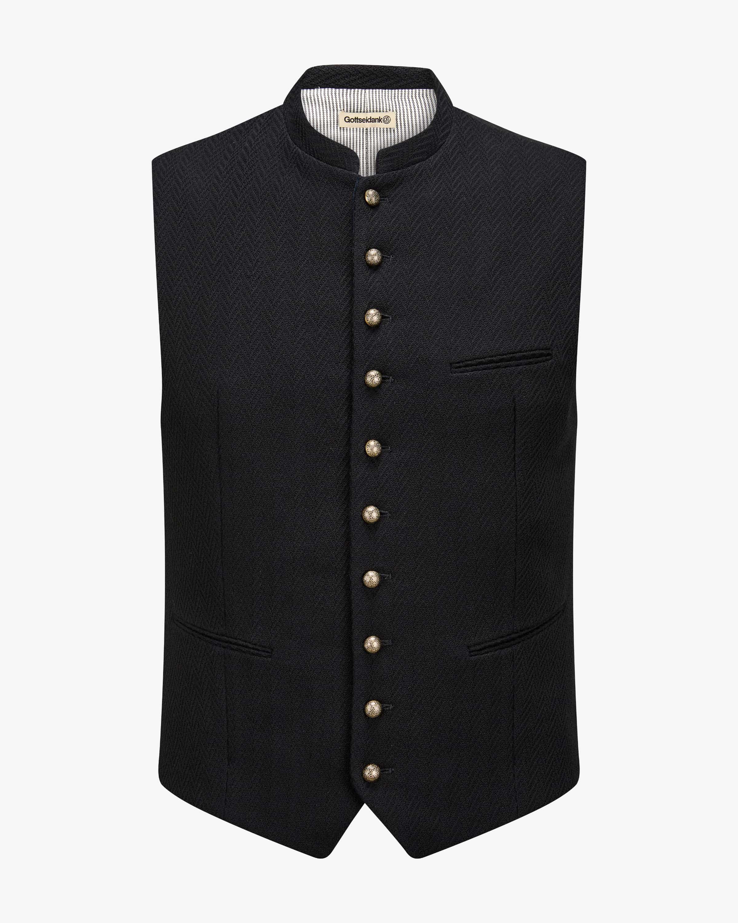 Konstantin Trachtenweste für Herren von Gottseidank in Schwarz. Das Modell besticht durch die traditionelle Aufmachung mit strukturiertem Muster und Samt- Details auf der Innenseite, welche dank der verzierten Kugelknöpfe stilvoll ergänzt wird - Ein hochwertiger Trachten-Begleiter mit besonderem Touch.