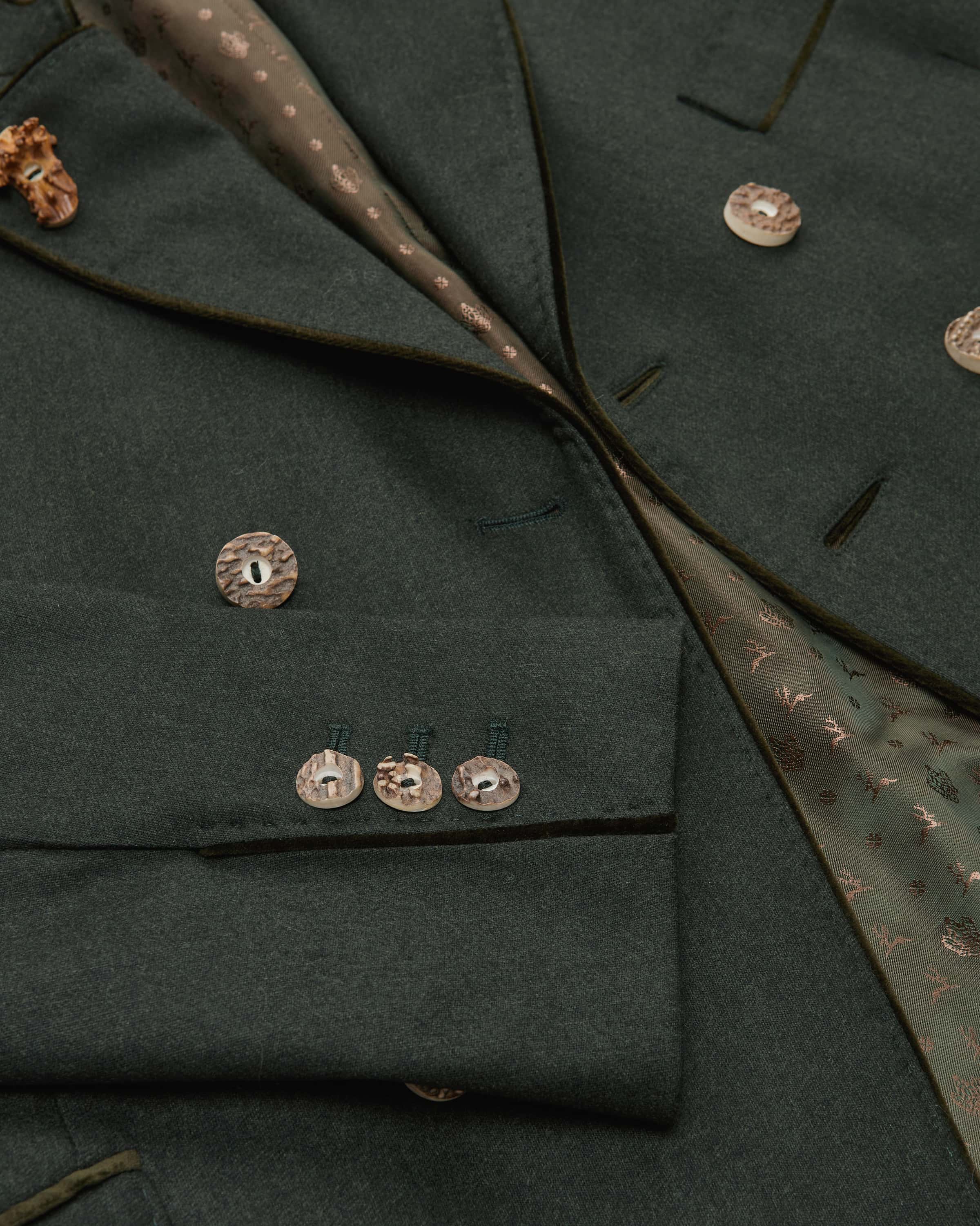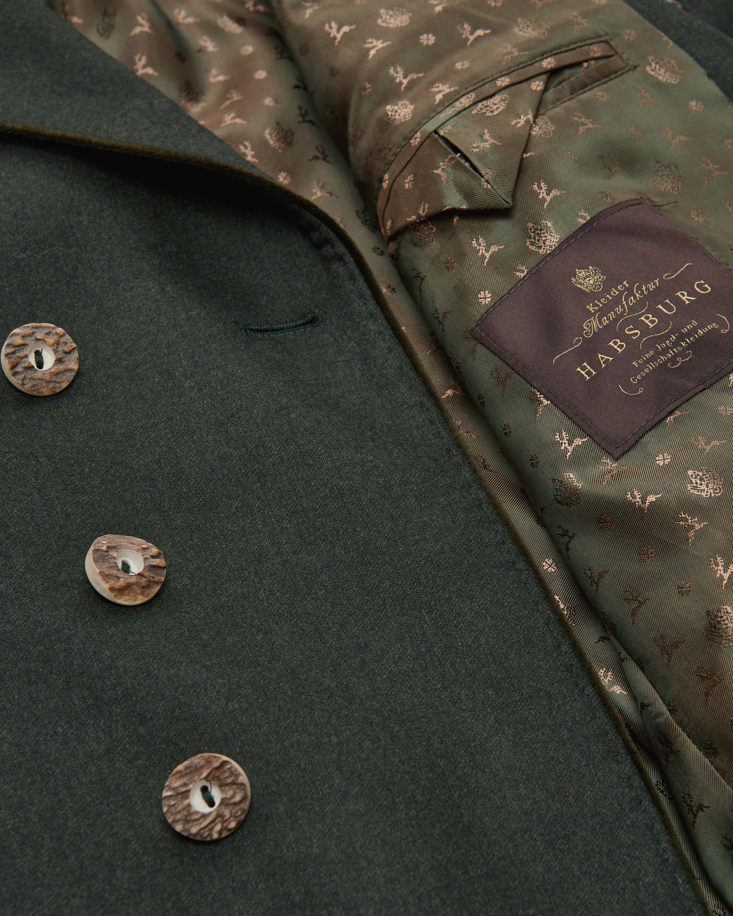 Kornegg Doppelreiher-Trachtenjanker für Herren von Habsburg in Dunkelgrün. Das Modell aus hochwertiger Schurwolle präsentiert sich in traditioneller Aufmachung, welche dank der rustikalen Hornknöpfe gekonnt untermalt wird. Zugleich vollenden die Wappen-Stickerei sowie weiche Samt-Paspelierungen den Trachten-Look harmonisch.
