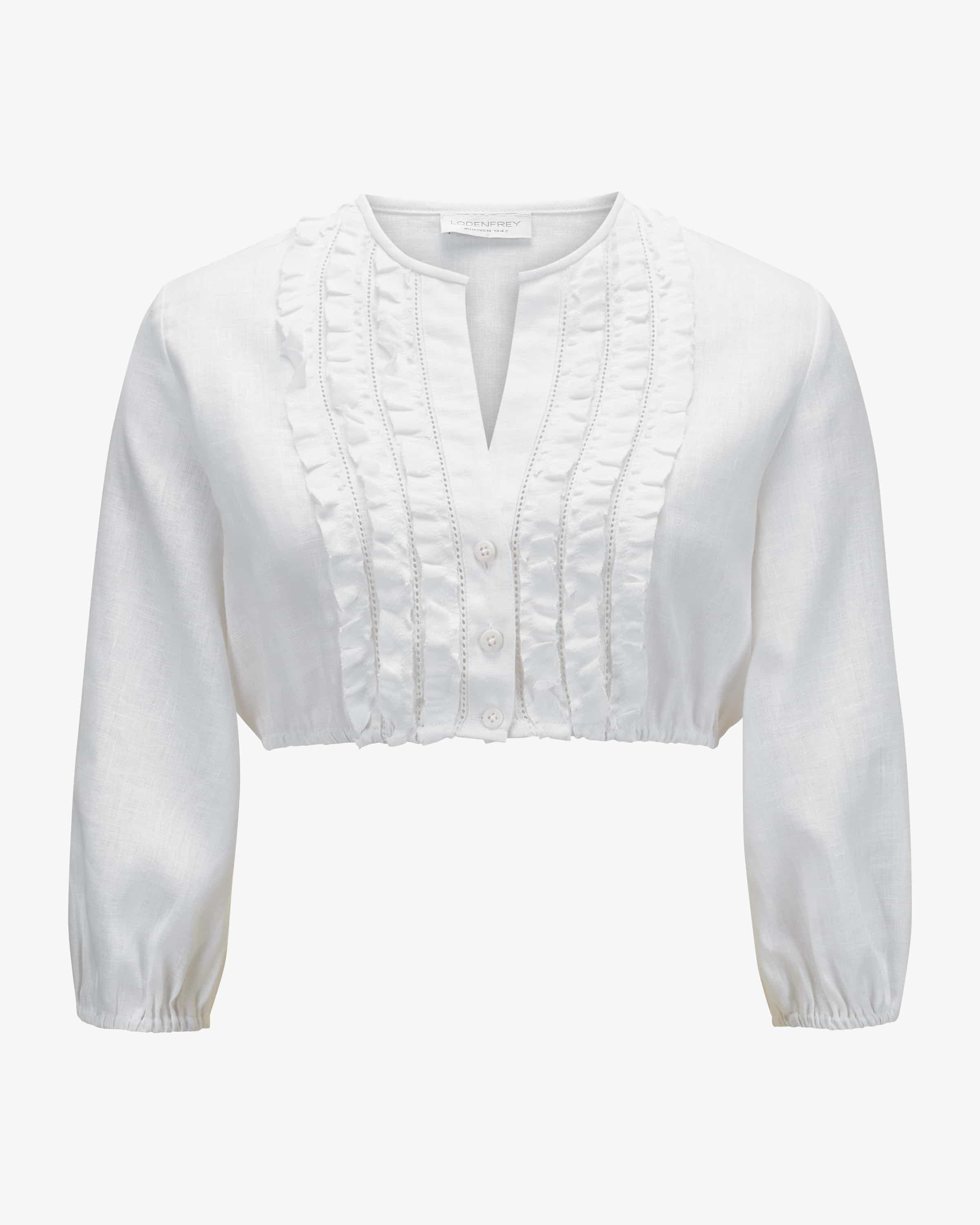 Leinen-Dirndlbluse für Damen von LODENFREY München 1842 in Weiß. Das Modell zeichnet sich durch seine leichte Leinen-Verarbeitung aus, welche mit angenehm- kühlender Eigenschaft punktet. In Verbindung mit Rüschen-Details und feinen Lochstickereien avanciert die Bluse zu einem stilvollen Trachten-Begleiter für feminine Looks.