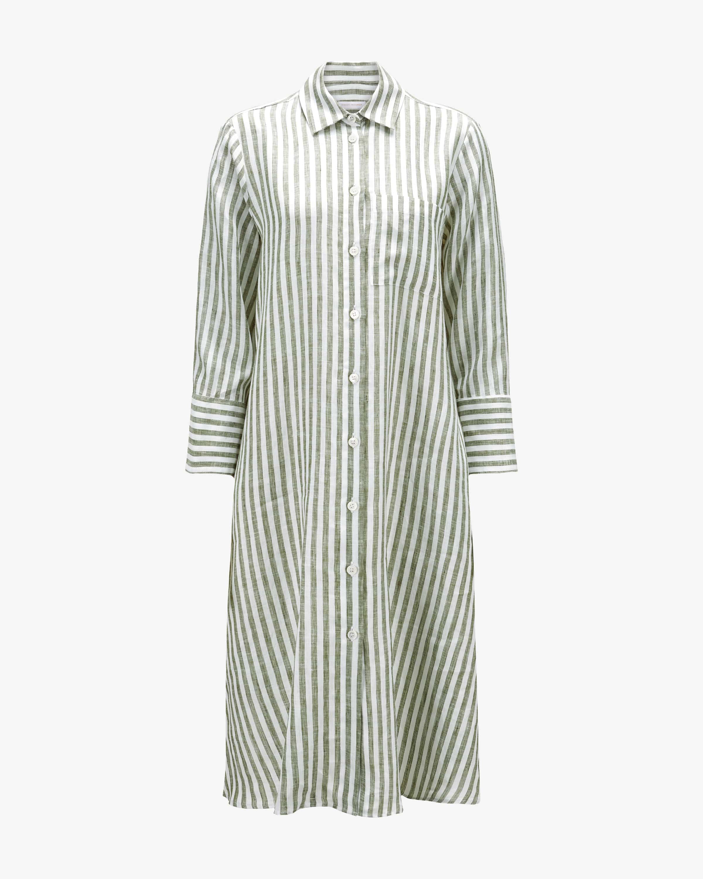 Leinen-Hemdblusenkleid Lena für Damen von Robert Friedman in Khaki und Weiß. Steht für hochwertige Blusen und Hemden – italienische Stoffe, deutsche Passform, internationale Klasse. Gefertigt aus hochwertiger Leinen-Qualität, überzeugt das weit geschnittene Modell mit seiner leichten wie auch kühlenden Eigenschaft. Changierende Knöpfe setzen zudem stilvolle Akzente und schaffen einen zeitlos-modernen Sommer-Begleiter.