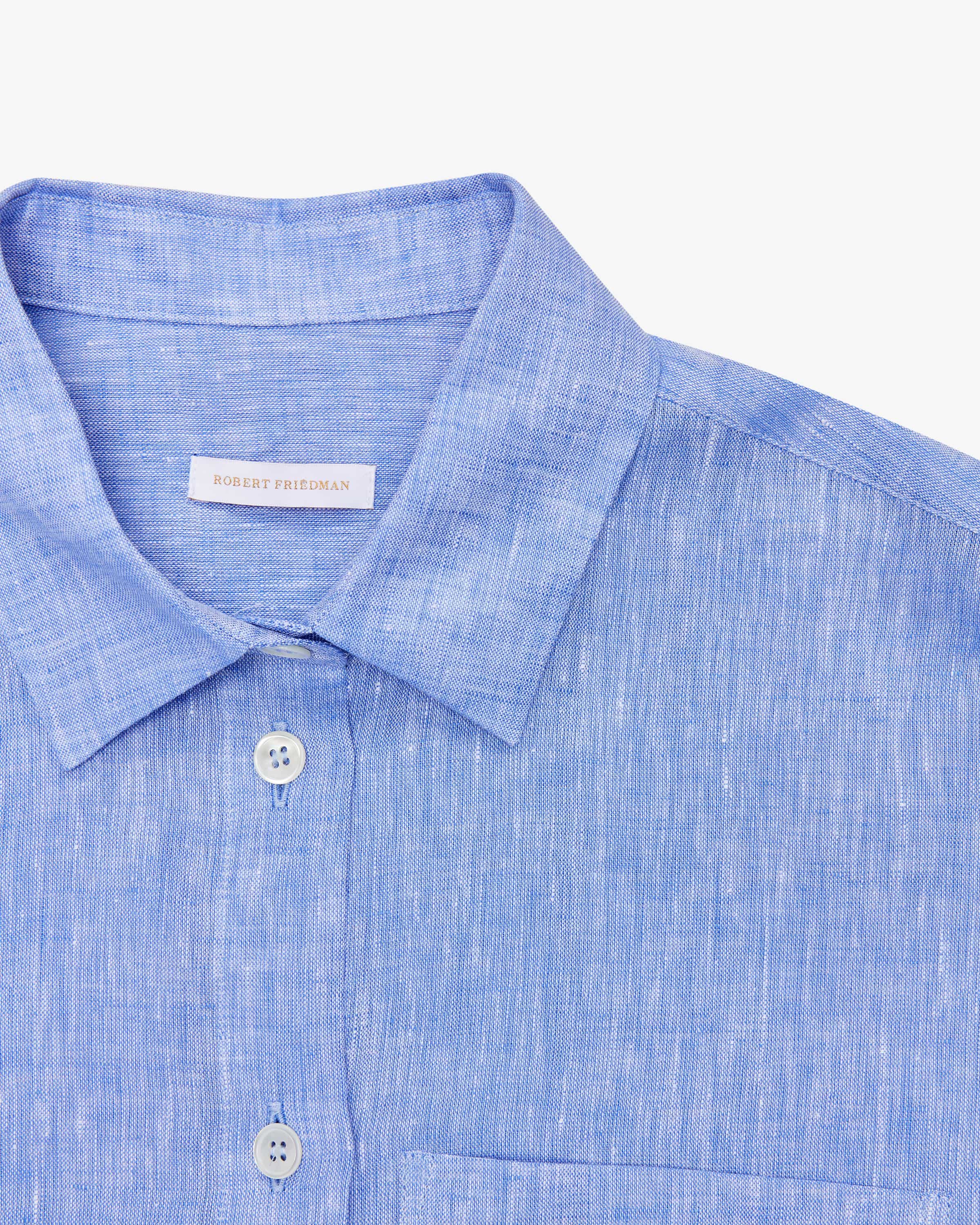 Leinen-Hemdblusenkleid Lena für Damen von Robert Friedman in Blau. Gefertigt aus hochwertiger Leinen-Qualität, überzeugt das weit geschnittene Modell mit seiner leichten wie auch kühlenden Eigenschaft. Changierende Knöpfe setzen zudem stilvolle Akzente und schaffen einen zeitlos-modernen Sommer- Begleiter.