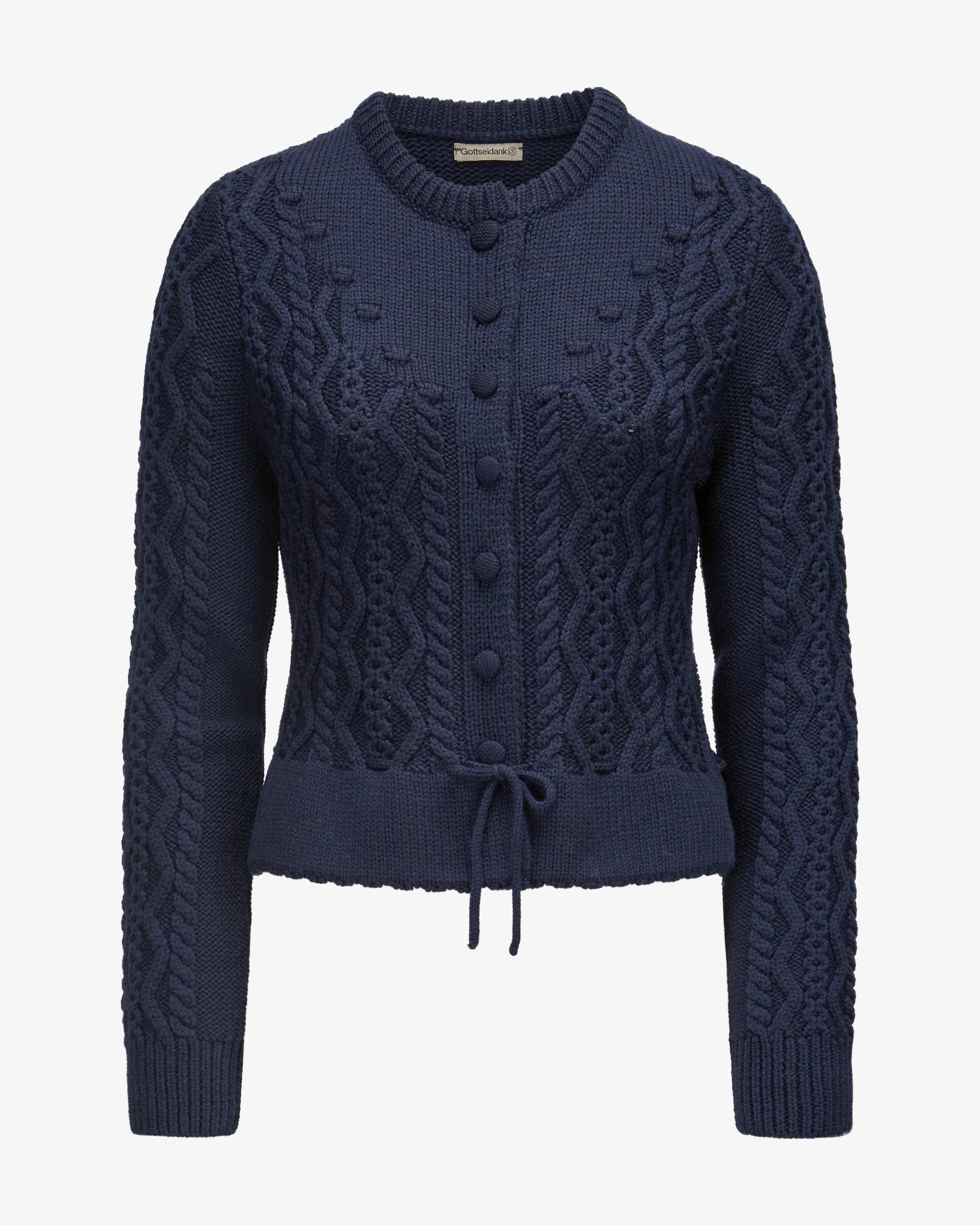 Lene Trachten-Strickjacke für Damen von Gottseidank in Navy. Die extrafeine Merino-Wolle in raffinierter Strick-Qualität punktet mit besonders angenehmem Tragekomfort, während tonale, stoffbezogene Knöpfe sowie der Tunnelzug das traditionelle Modell feminin vollenden.