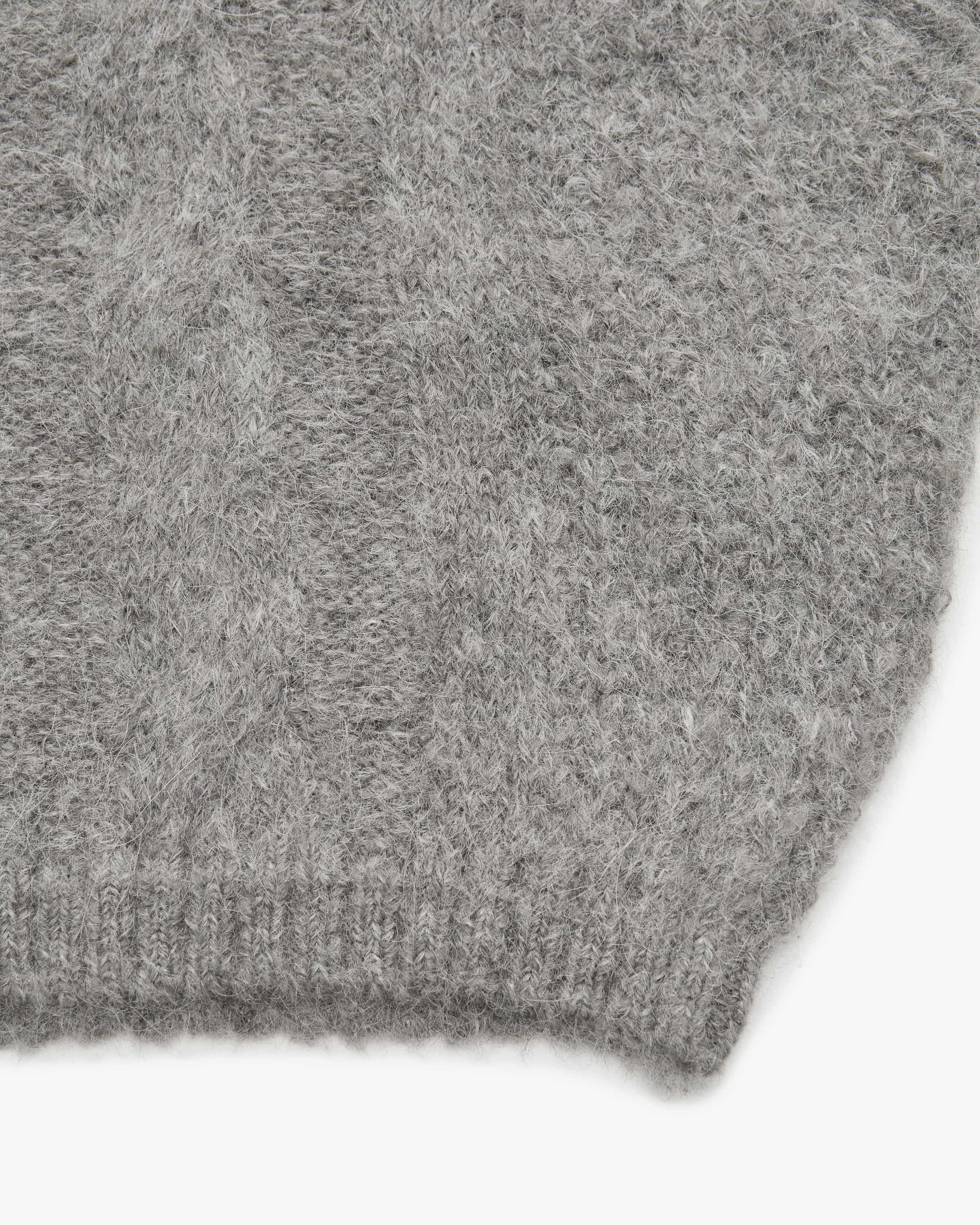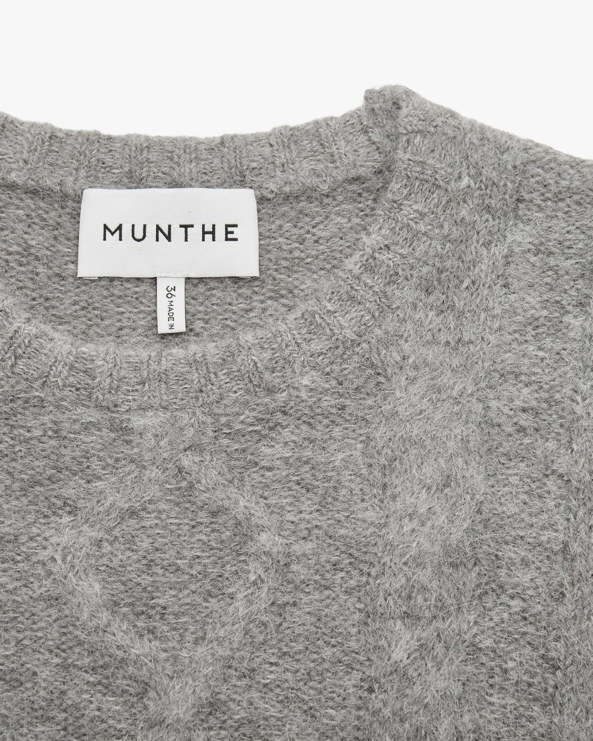 Loline Strickshirt für Damen von Munthe in Grau. Das skandinavische Label aus Kopenhagen – feminin & cool. Auch dieses Modell begeistert mit verkürzter Boxy- Passform und klassischem Zopfstrickmuster, während der weiche Woll-Mix das modische Gesamtbild gekonnt abrundet.