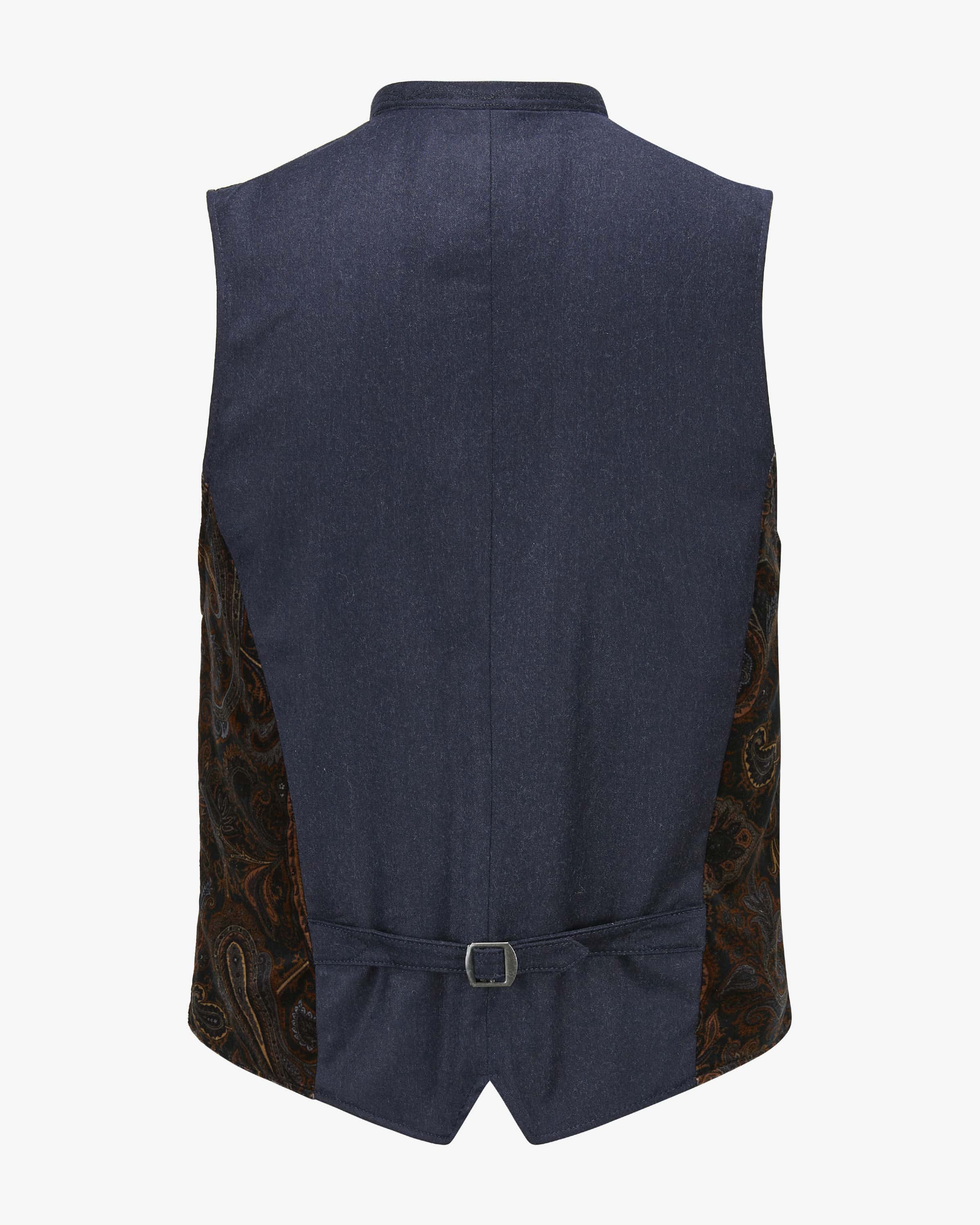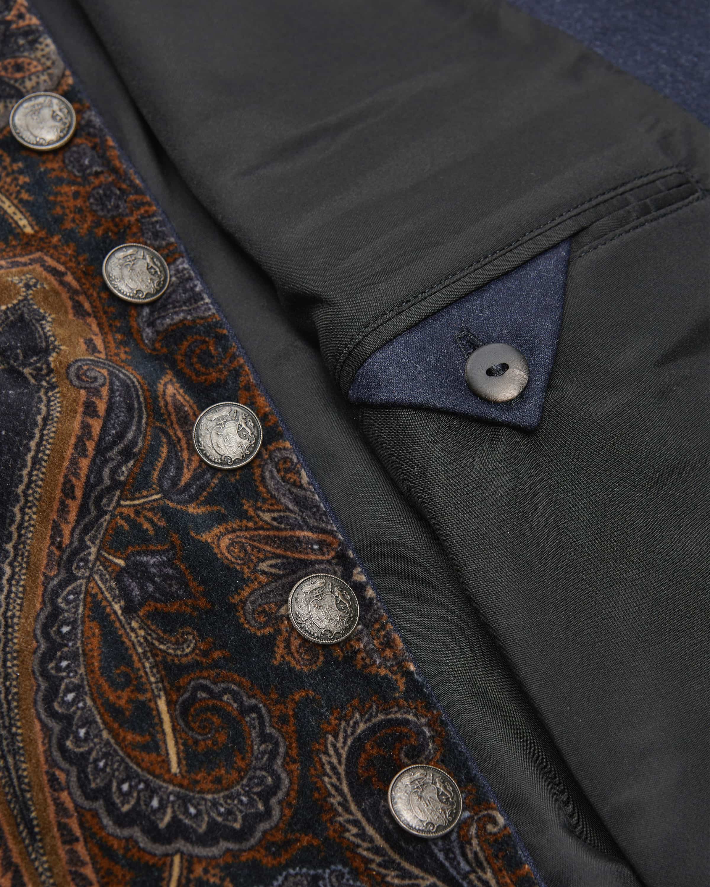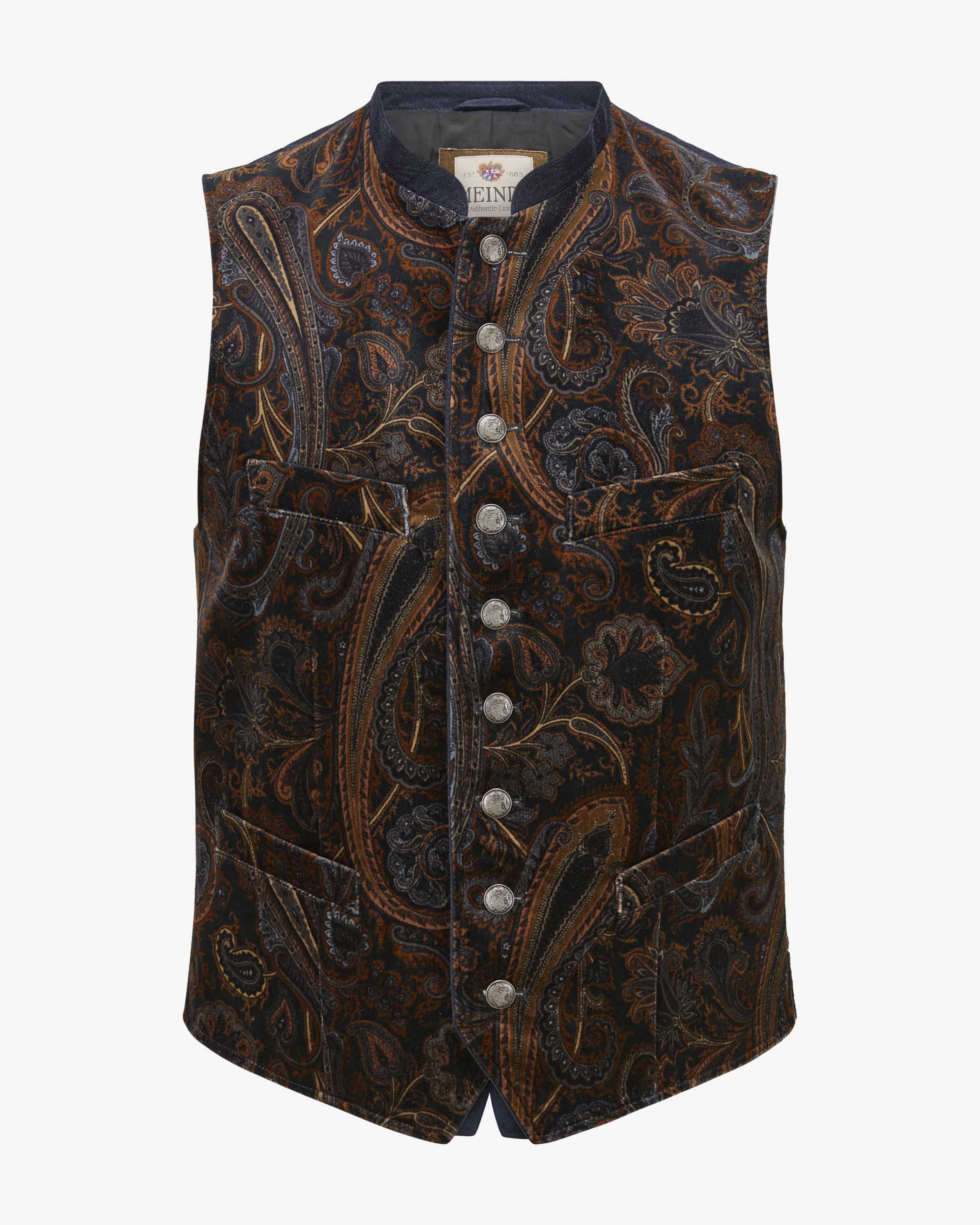 Lorenz Trachten-Weste für Herren von Meindl in Midnight Navy. Das Modell aus hochwertigem Material-Mix mit leicht elastischer Woll-Rückseite präsentiert sich in traditionellem Charme, welcher dank der Münzknöpfe sowie der Samt-Aufmachung stilvoll untermalt wird. Zugleich setzt das Paisley-Muster besondere Akzente.