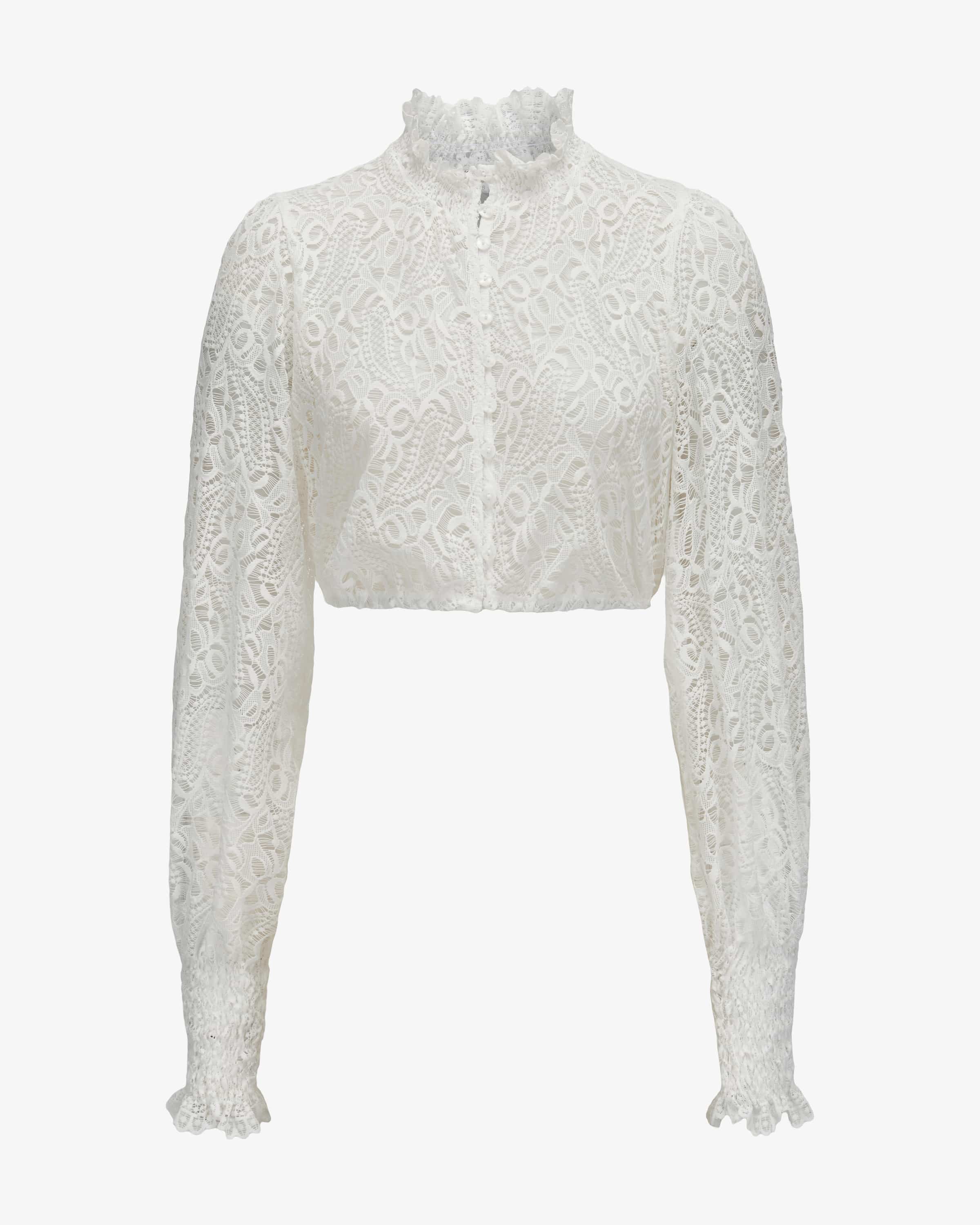 Luise Dirndlbluse Semi-Transparent für Damen von Heimatglück in Weiß. Das hochgeschlossene Modell erhält dank der semi-transparenten Spitze eine feminine Leichtigkeit, während elastische Einsätze an Kragen und Ärmeln einen perfekten Sitz garantieren und zugleich stilvolle Rüschen kreieren.