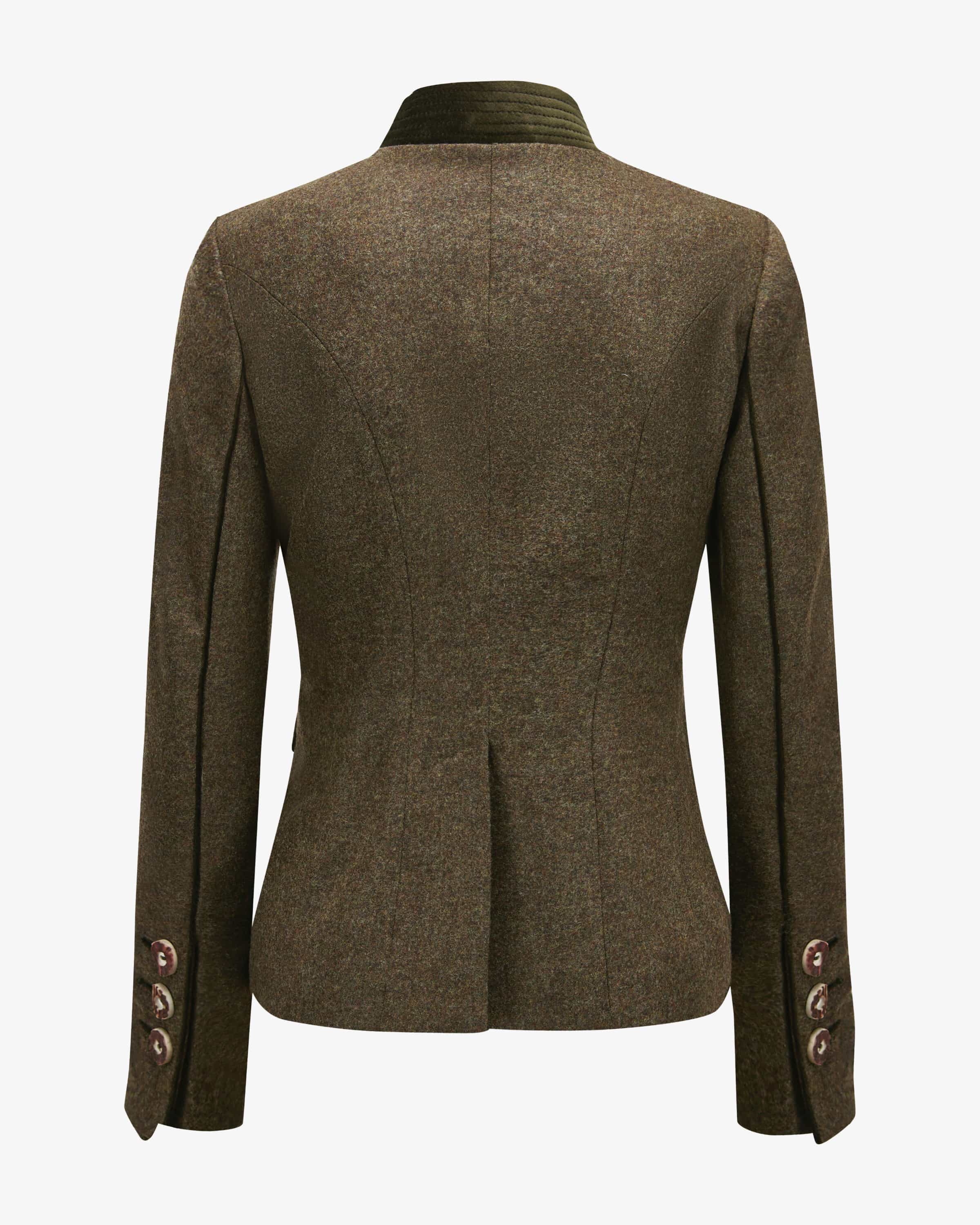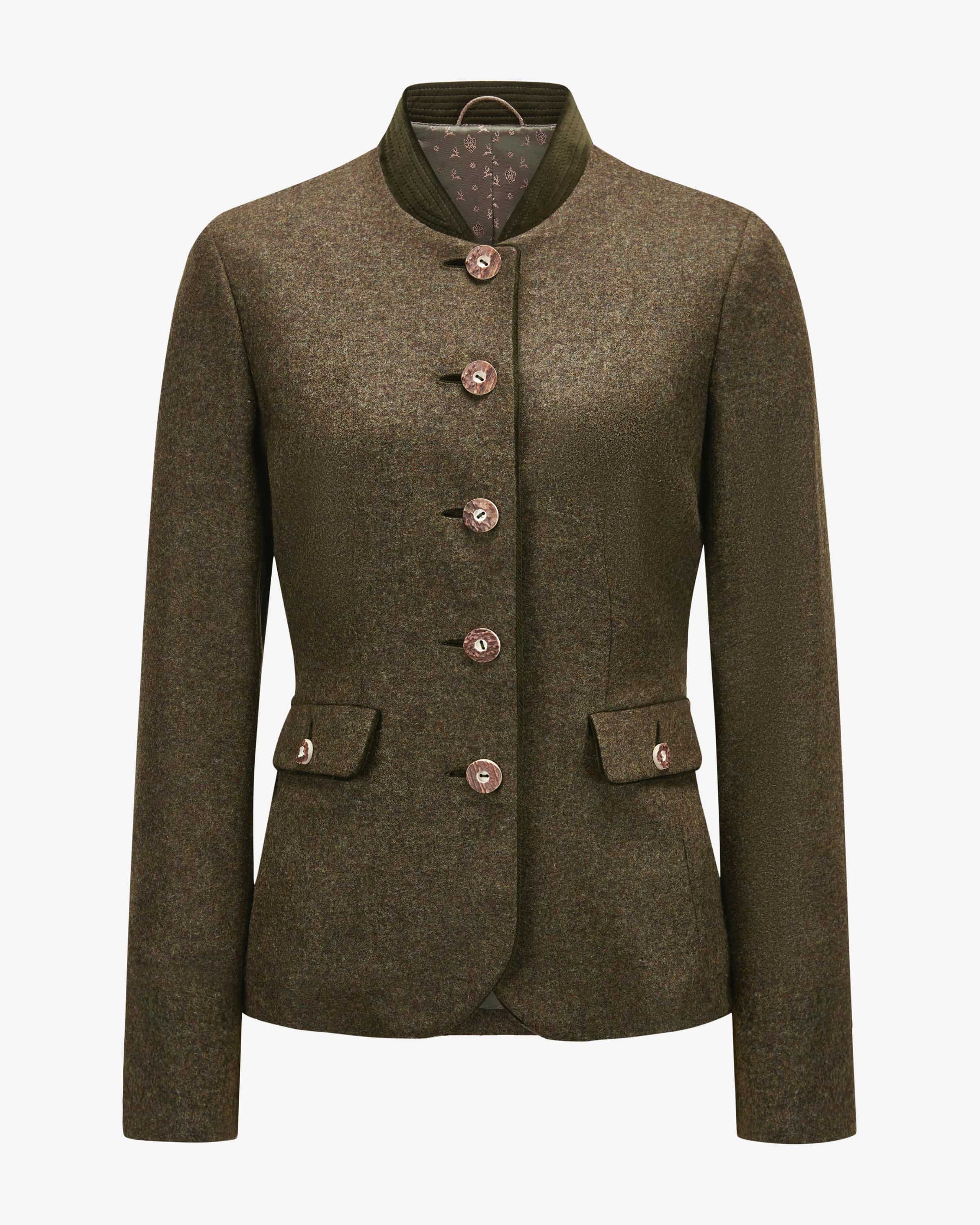 Mariella Trachtenblazer für Damen von Habsburg in Khaki und Dunkeloliv. Das taillierte Modell besticht dank der hochwertigen Schurwoll-Qualität mit angenehmem Griff, während klassische Details sowie kontrastierende Samt-Einsätze das traditionelle Gesamtbild perfekt ergänzen.