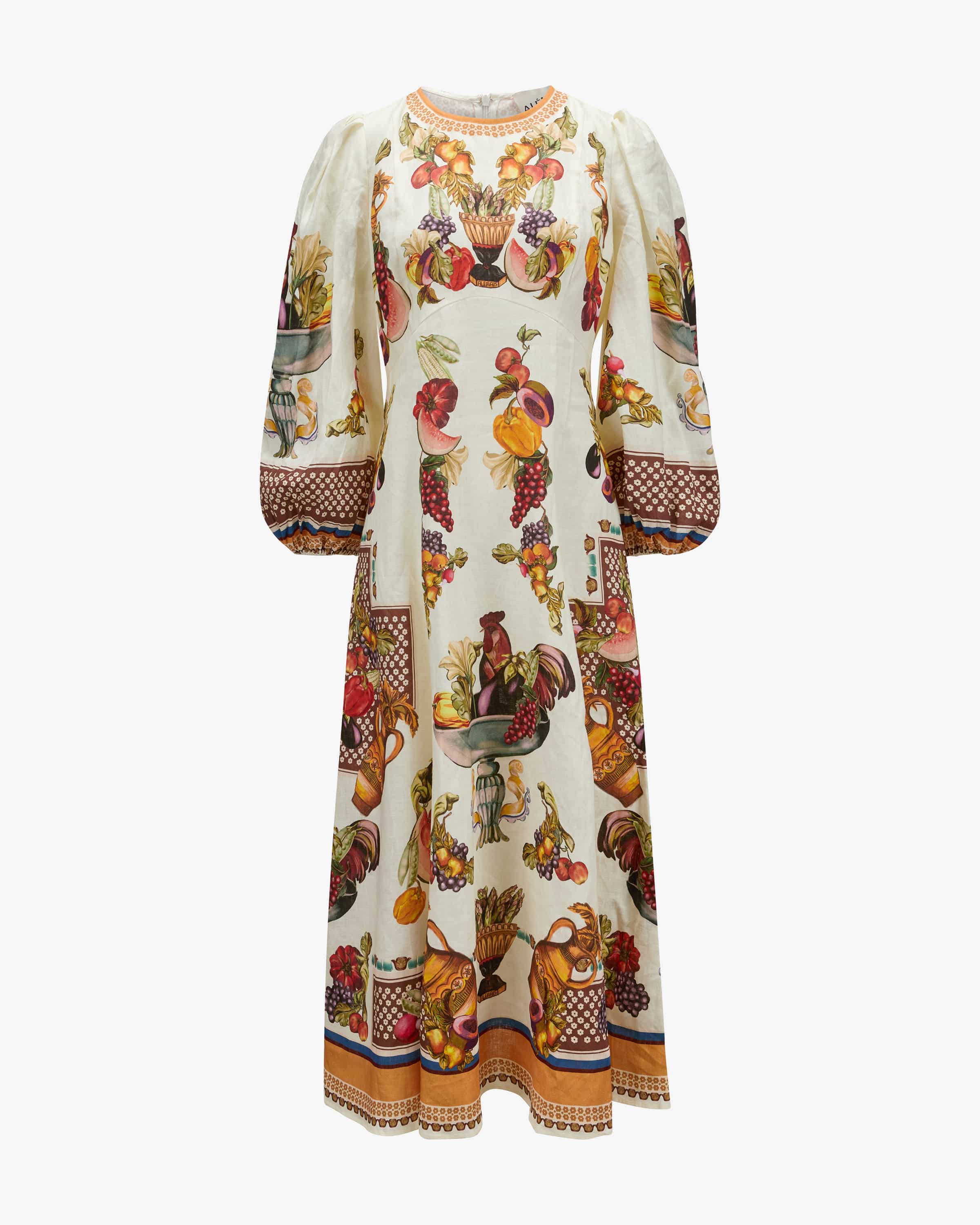 Mercado Leinenkleid für Damen von Alémais in Bunt. Das Kreativstudio aus Sydney mit Fokus auf kunstvolle Prints, nachhaltiges Design und nostalgische Ästhetik ist unverwechselbar durch Collage-artige Muster, Patchwork-Effekte und Vintage- Flair. Auch dieses Modell punktet mit hochwertiger Leinen-Qualität sowie kreativem Allover-Print mit buntem Obst und Gemüse, während die feminine Silhouette mit Puffärmeln sommerliche Leichtigkeit versprüht.