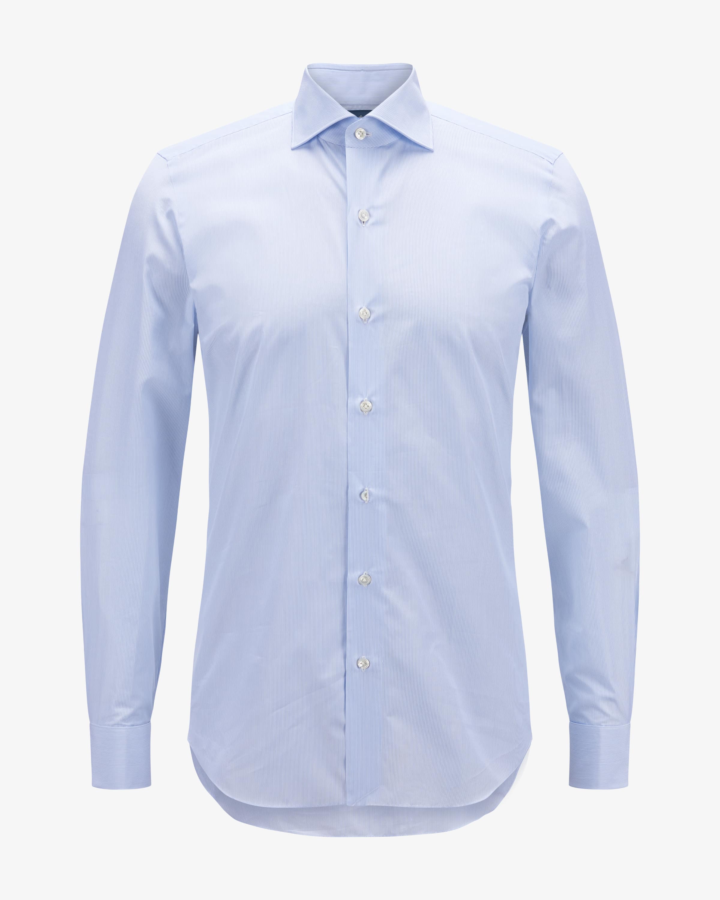 Milano Eduardo Businesshemd Slim für Herren von Finamore 1925 in Hellblau und Weiß. Mit diesem Modell erhalten sie einen luxuriösen Businessbegleiter aus hochwertiger Giza-Bauwolle, der neben der klassischen Aufmachung mit einem besonders weichen Griff überzeugt.