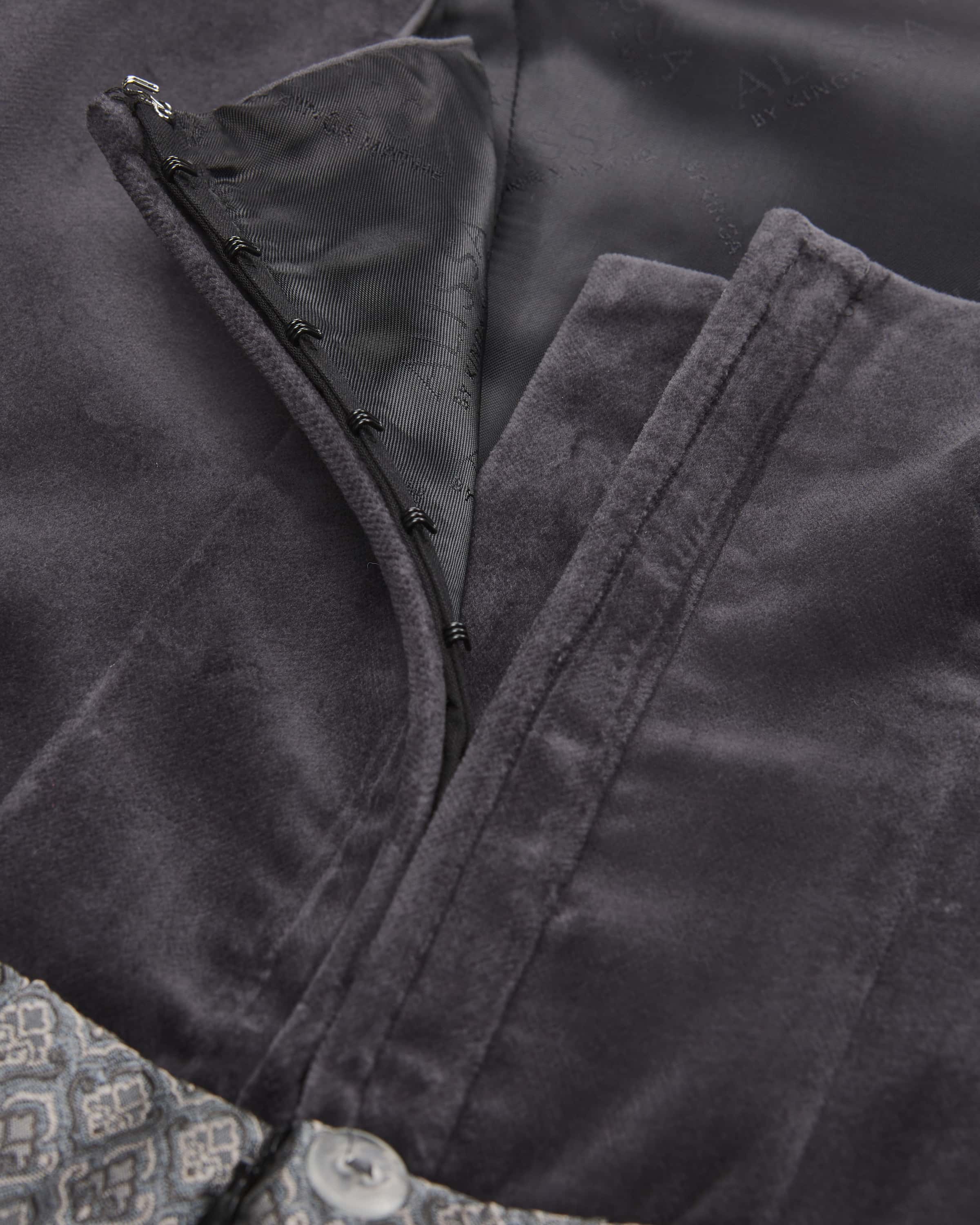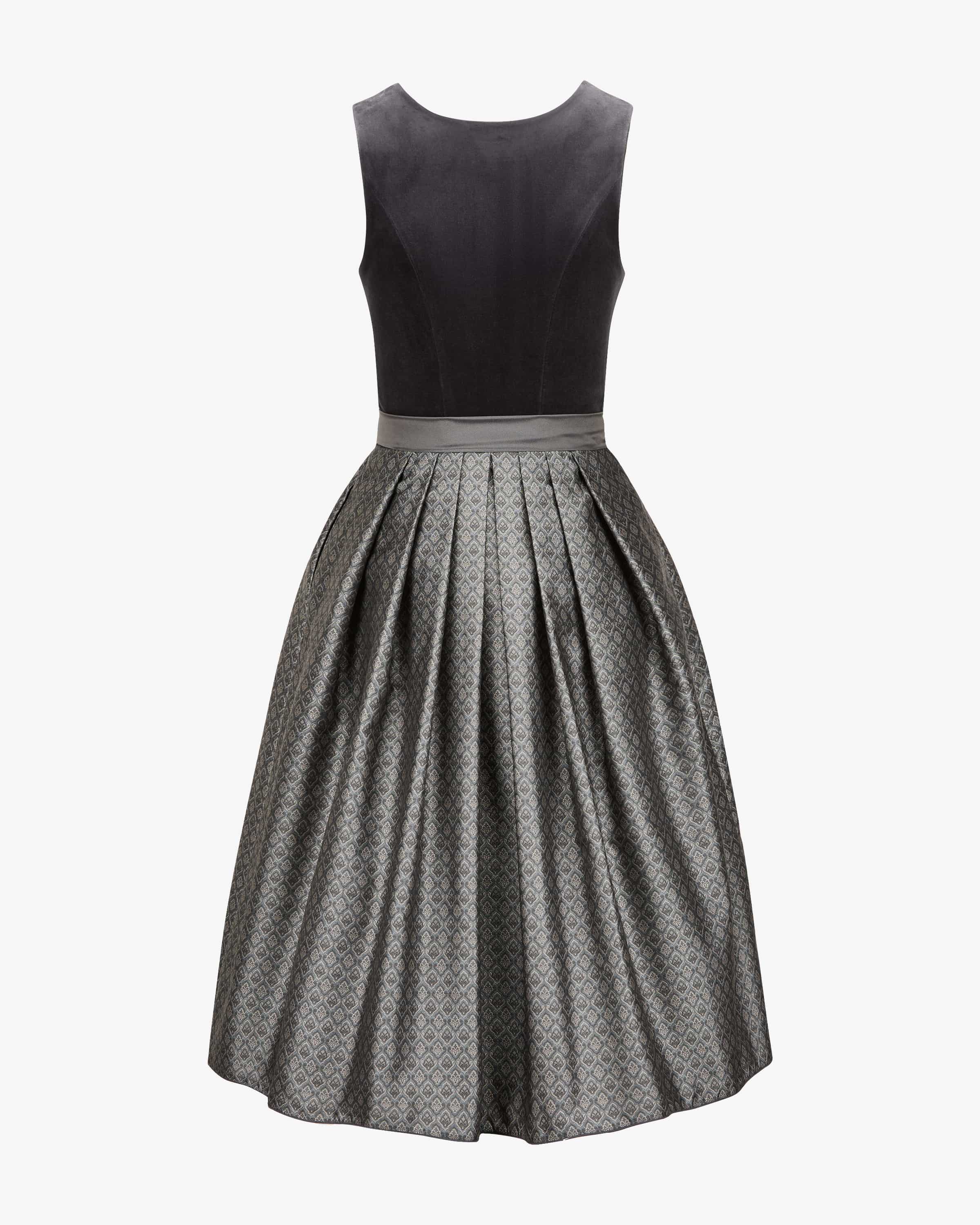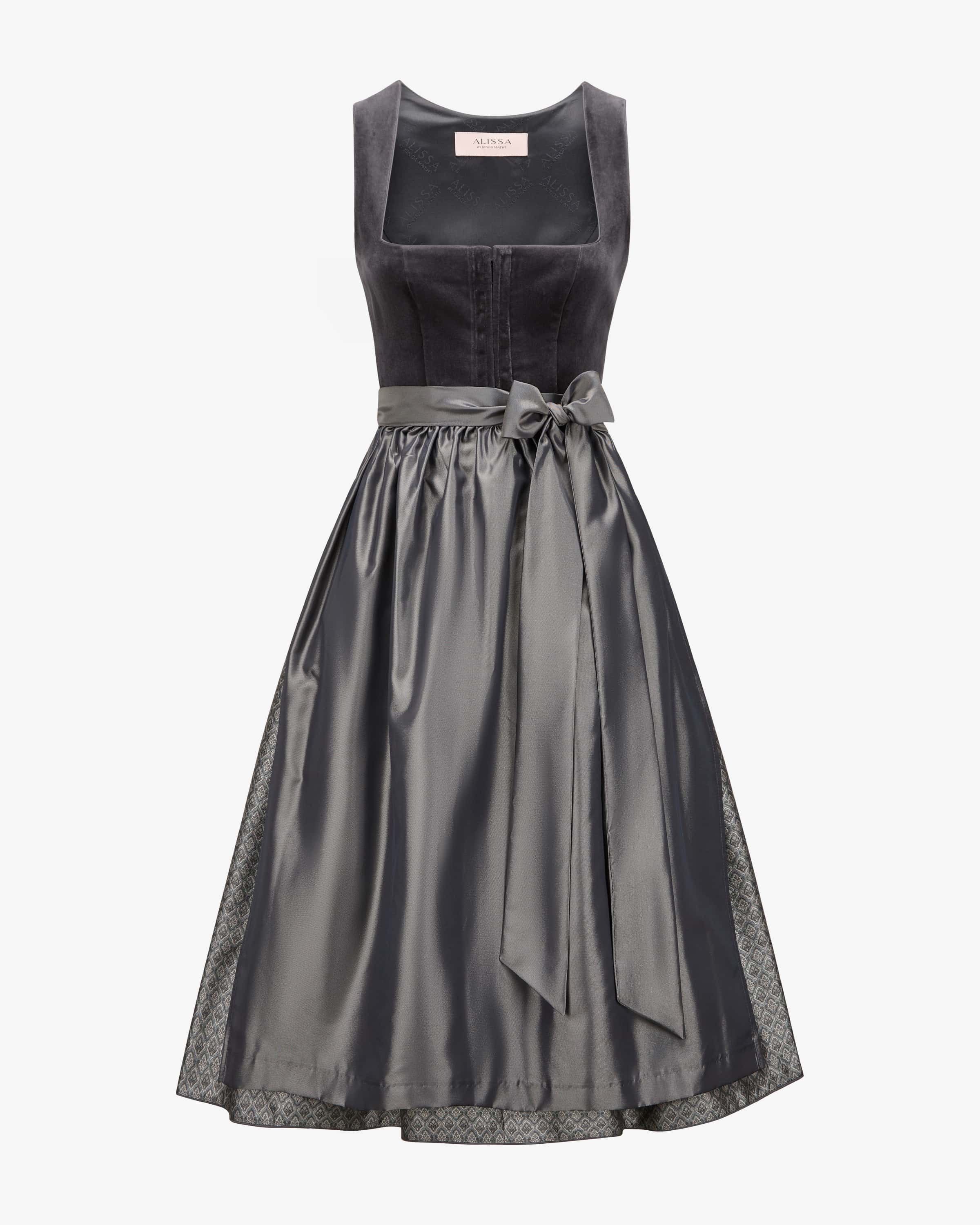 Nala Midi-Dirndl mit Schürze für Damen von Alissa by Kinga Mathe in Anthrazit und Hellgrau. Mit Liebe zum Detail entwirft das deutsche Label aufwendige Trachten-Kreationen mit dem gewissen Etwas und überzeugt mit erlesener Stoffauswahl sowie kreative Designs. Das Modell überzeugt mit Samt-Mieder und Jacquard-Rock, während der Unterrock mit Volants-Saum eine feminine Passform verleiht. Die changierende Schürze komplettiert den traditionellen Look harmonisch.