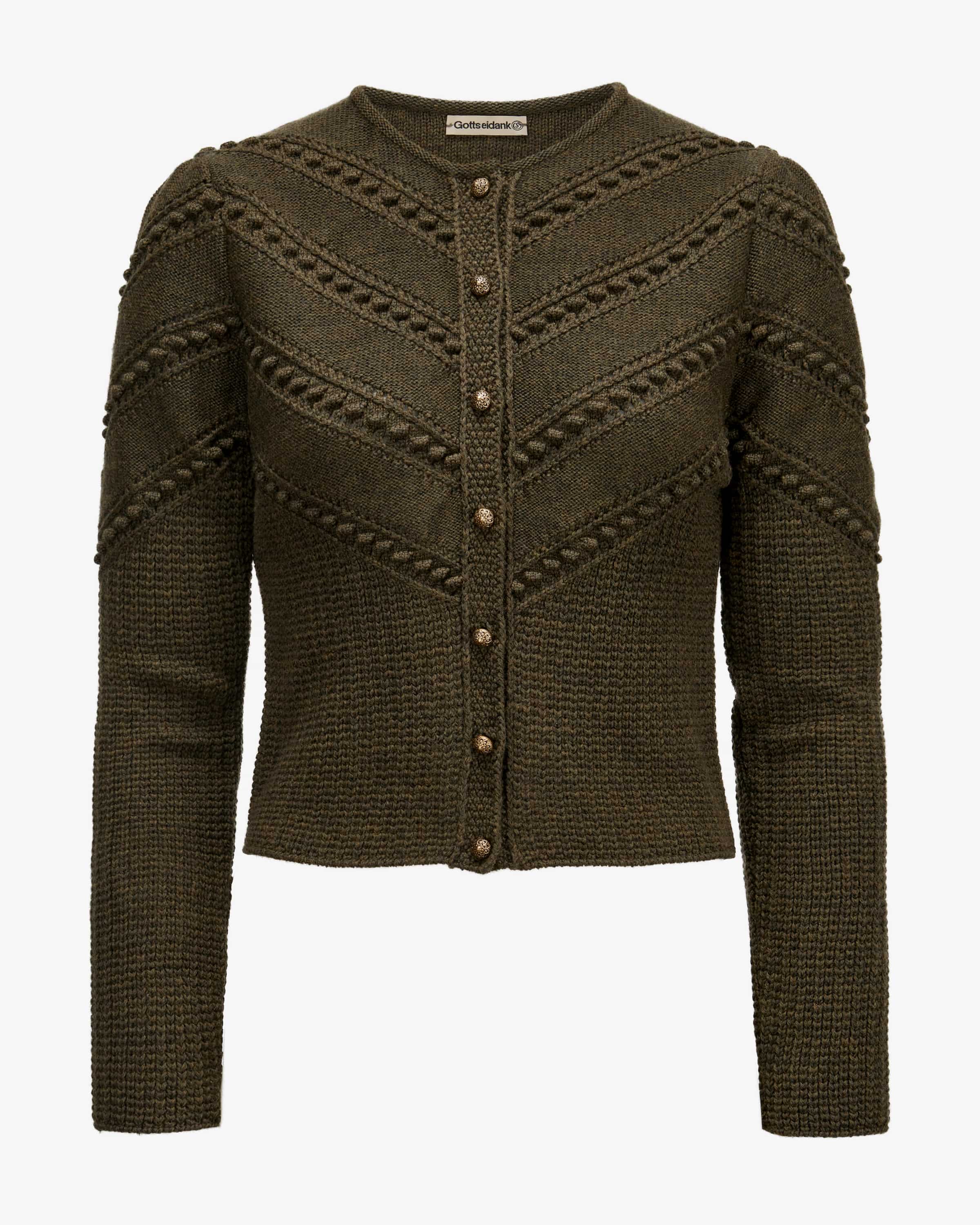 Ophelia Trachten-Strickjacke für Damen von Gottseidank in Oliv. Die extrafeine Merino-Wolle in raffinierter Strick-Qualität punktet mit besonders angenehmem Tragekomfort, während stilvolle Kugelknöpfe sowie die Raffungen an den Schultern das traditionelle Modell gekonnt vollenden.