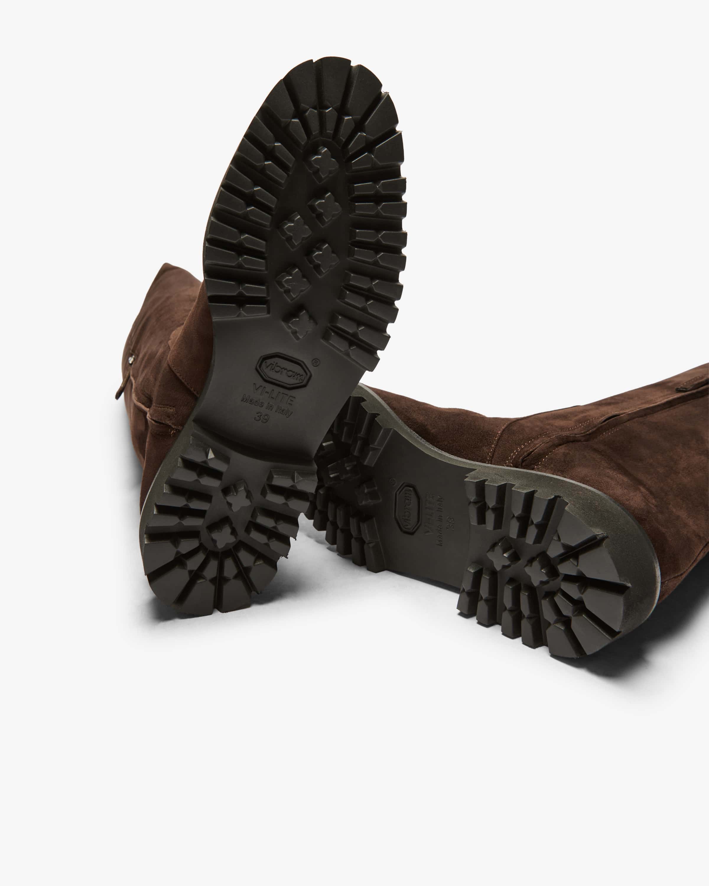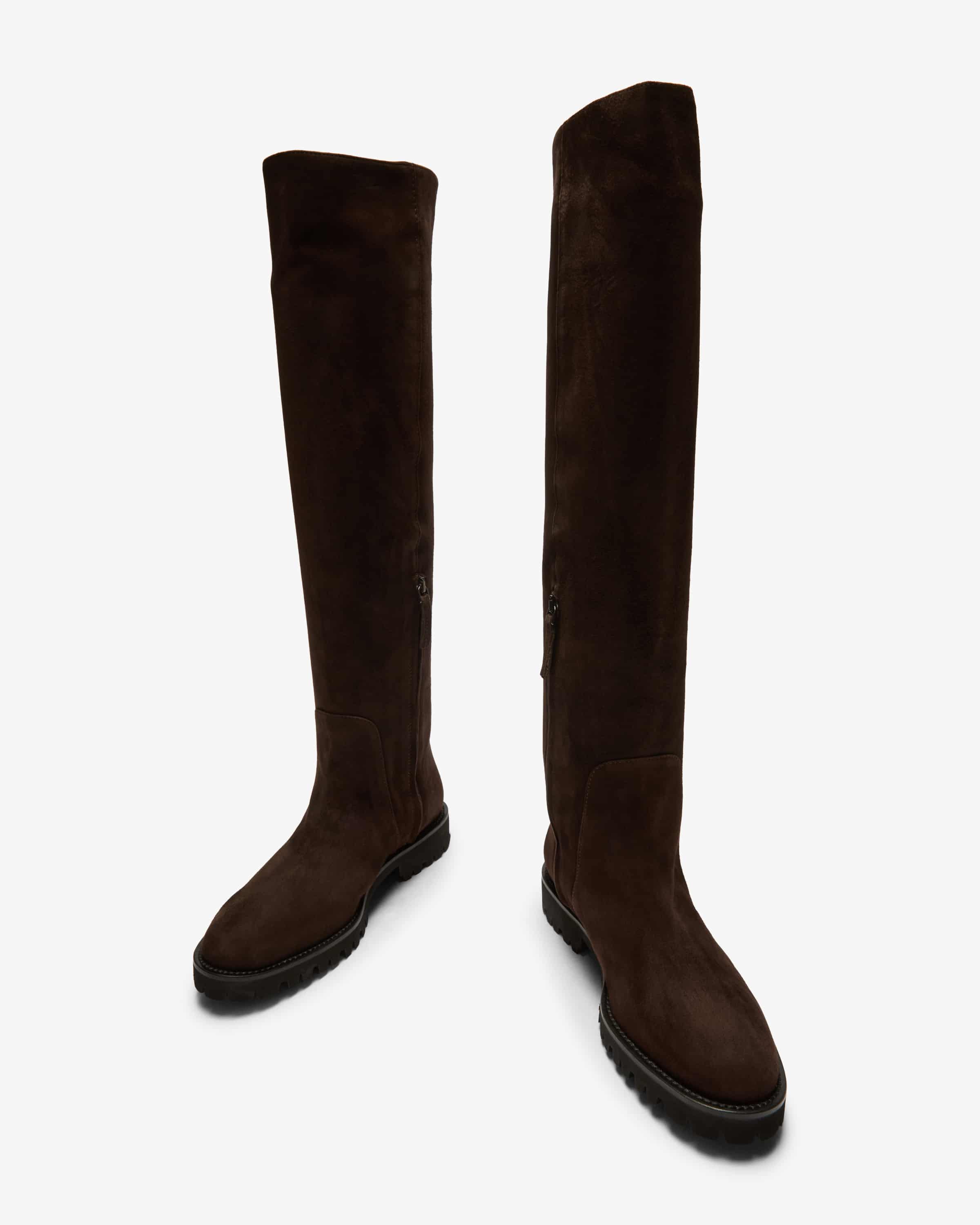 Overknee-Stiefel für Damen von LODENFREY in Dunkelbraun. Das Modell besticht durch die Verwendung von hochwertigem Veloursleder in stilvoller Aufmachung, während die leichte Vibram-Profilsohle sowie der hohe, geschlitzte Schaft einen modischen Begleiter kreiert.