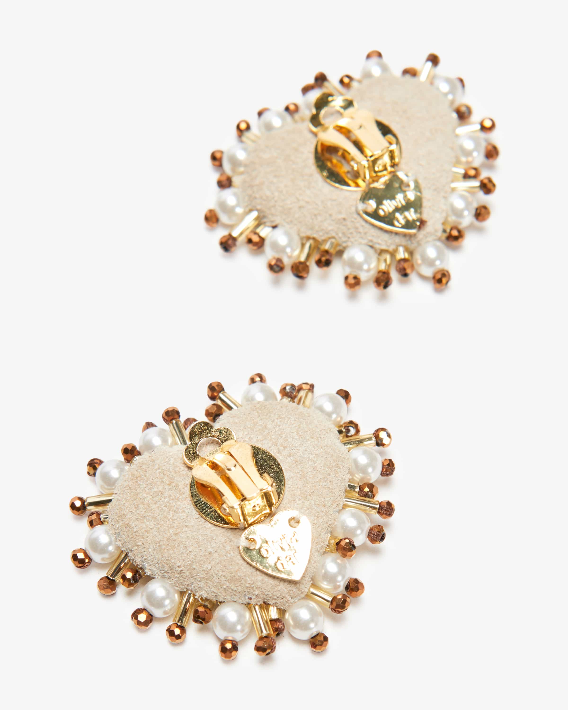 Pearl Heart Clip-Ohrringe von Olivia Dar in Gold, Creme und Kupfer. Verspielte Accessoires mit indischen Einflüssen – jedes Stück ein handgefertigtes Kunstwerk. Auch diese extravaganten Clip-Ohrringe in Herzform avancieren dank changierender Schmuckperlen-Applikationen zu einem besonderen Eyecatcher, der jedem Outfit einen Hauch edle Raffinesse verleiht.