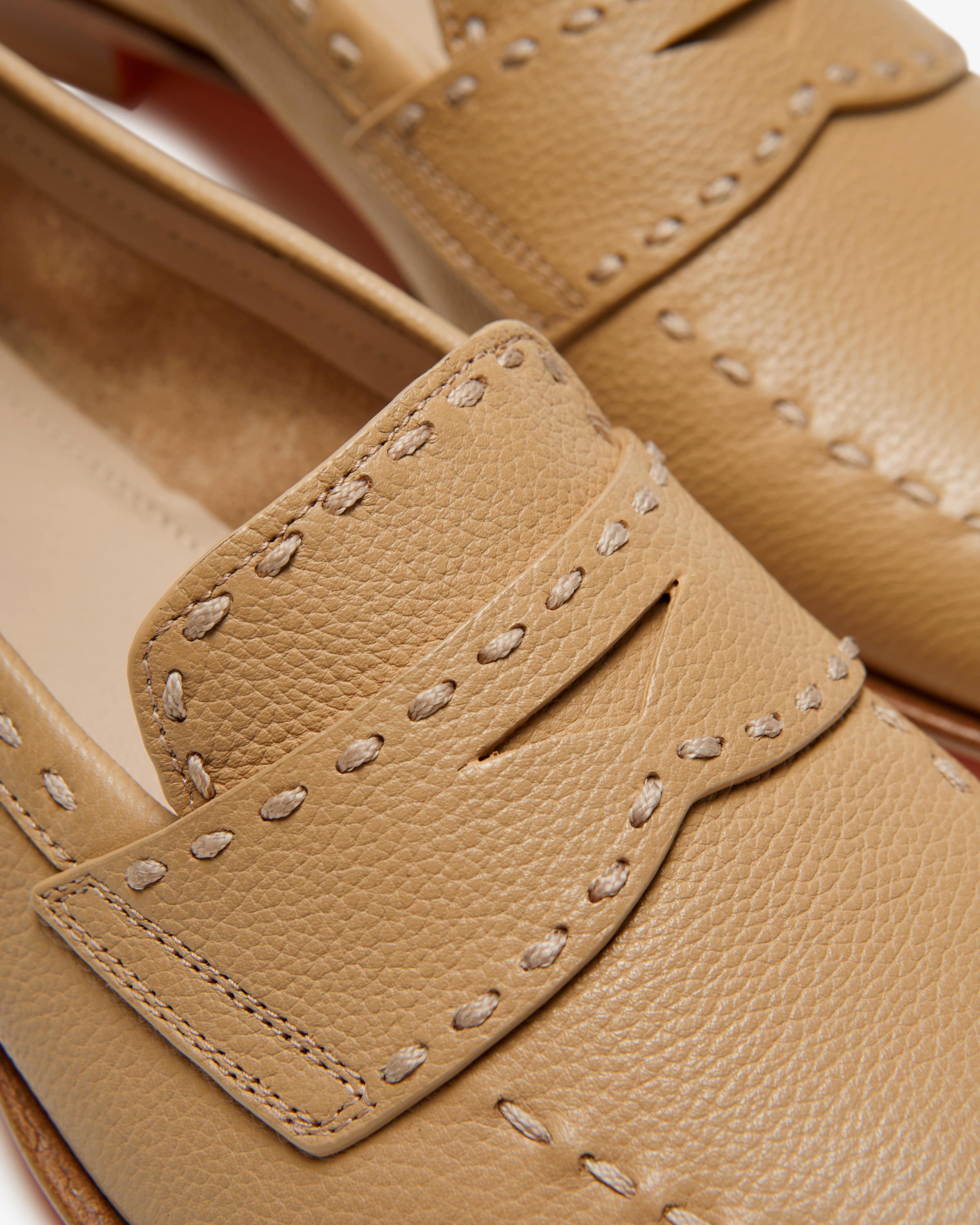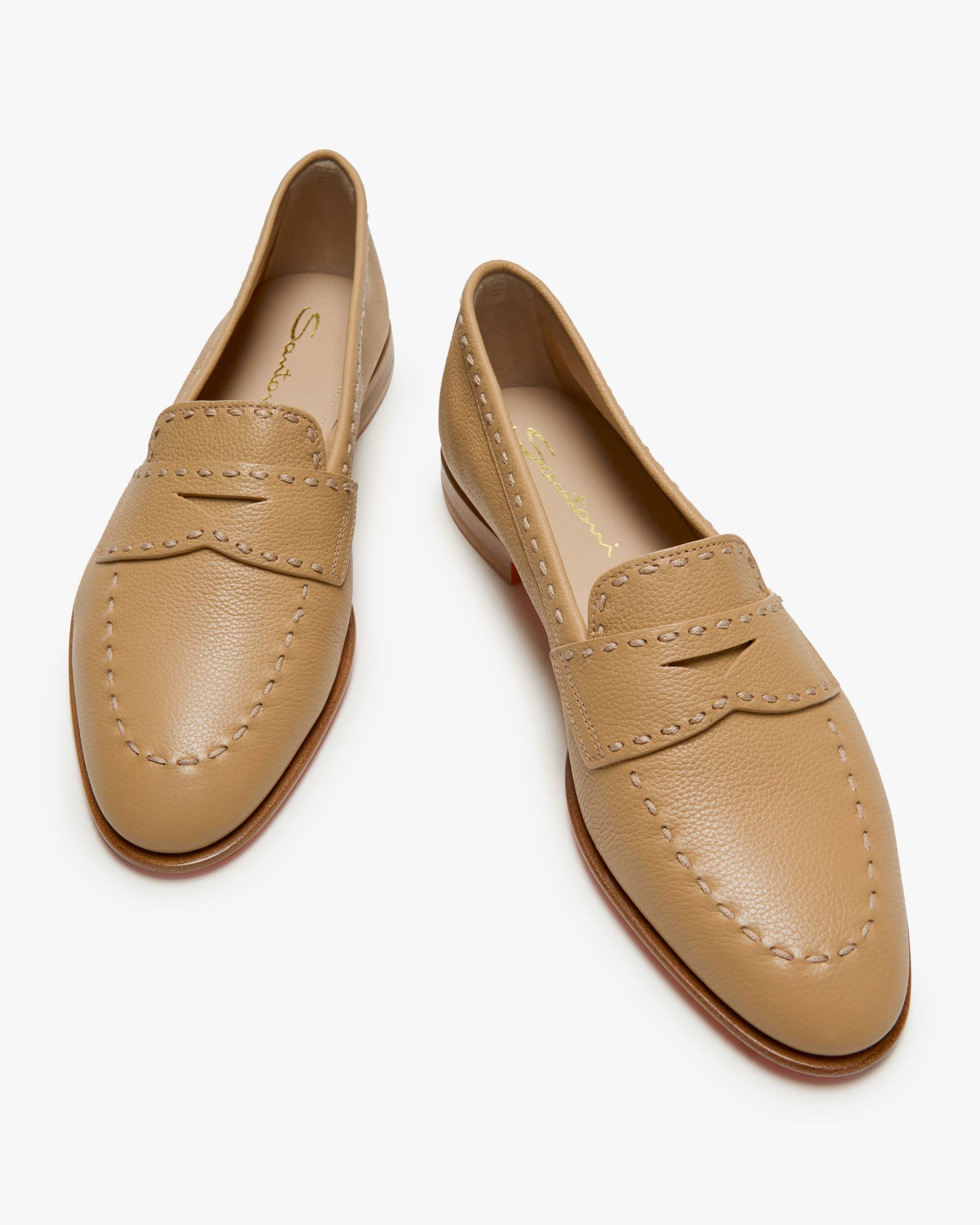 Marlene Penny Loafer für Damen von Santoni in Beige. Höchste Handwerkskunst gepaart mit klassisch britischem Design - die Schuhe der Schuhmanufaktur Santoni stehen für einen unvergleichlichen Stil, welcher neben einem hohen Qualitätsanspruch auch durch perfektionierte Formen und eine erstklassige Passform begeistert. Auch dieses Modell besticht mit weichem, genarbtem Leder und schmaler Silhouette, während die hochwertige, charakteristische orange Ledersohle mit Gummieinsatz Sie stilsicher auftreten lässt.