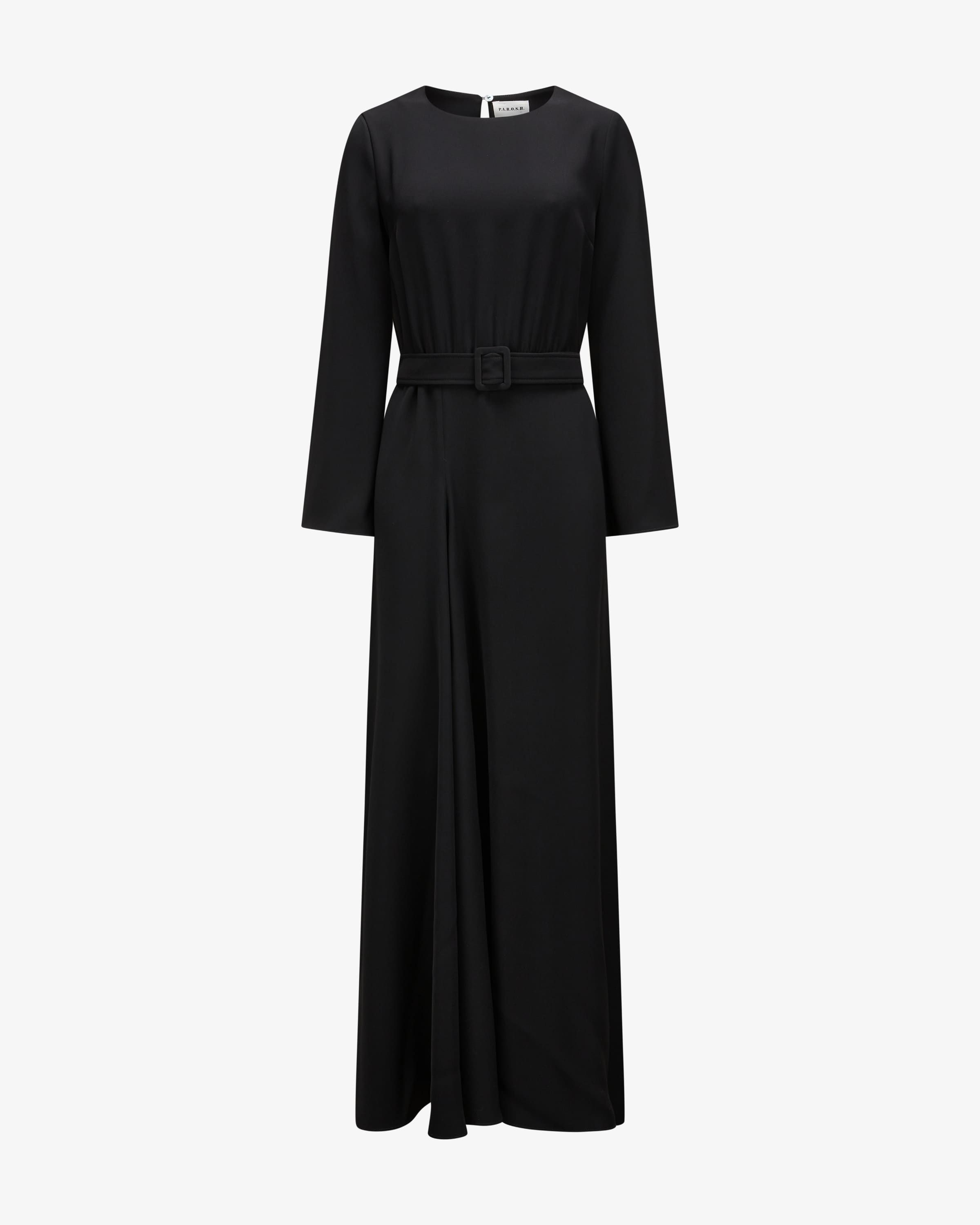 Poker25 Kleid für Damen von Parosh in Schwarz. Das Modell besticht dank fließender Material-Qualität mit angenehmem Tragekomfort, während der Taillengürtel sowie die Trompetenärmel einen femininen sowie edlen Look kreieren.